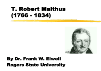 T. Robert Malthus (1766 - 1834) By Dr. Frank W. Elwell Rogers State University Note: This presentation is based on the theories of T. Robert Malthus as presented in his books listed in the bibliography. A complete summary of his and other macro-social theories can be found in Macrosociology: The Study of Sociocultural Systems, by Frank W. Elwell. A Word of Explanation The following slide show is a faithful summary of Malthus’s original 1798 Essay on Population. While nothing will substitute for reading the original essay with an open mind, I hope this summary will go some way toward rehabilitating this man’s reputation. Principle Of Population "Population, when unchecked, increases at a geometrical ratio. Subsistence increases only in an arithmetical ratio. A slight acquaintance with numbers will show the immensity of the first power in comparison with the second." Principle Of Population "Population must always be kept down to the level of the means of subsistence.” While Malthus was not the first one to notice this, he was the first to inquire into “the means by which this level is effected.” Principle Of Population Man has no natural predators (save for other men). "The passion between the sexes has appeared in every age to be so nearly the same, that it may always be considered, in algebraic language as a given quantity." Principle Of Population Population, when unchecked, will double itself every twenty-five years. "...Supposing the present population equal to a thousand million, the human species would increase as the numbers 1, 2, 4, 8,16, 32, 64, 128, 256, and subsistence as 1, 2, 3, 4, 5, 6, 7, 8, 9... Principle Of Population "In two centuries the population would be to the means of subsistence as 256 to 9; in three centuries as 4096 to 13, and in two thousand years the difference would be almost incalculable.” Subsistence Vs. Population Please note: By writing this Malthus is not making a prediction of the future. He knows full well that population cannot grow long beyond the means of subsistence. He is simply trying to illustrate to his readers the unequal powers of growth in population and food production. Subsistence Vs. Population The following slide is a graphic illustration of Malthus’ conception of the unequal strength of subsistence and population growth potential. Growth Potential of Subsistence Vs. Population 140 120 100 TIME 1 TIME 2 TIME 3 TIME 4 TIME 5 TME 7 TIME 6 TIME 7 80 60 40 20 0 SUBSISTENCE POPULATION Subsistence "In this supposition no limits whatever are placed on the produce of the earth…. “It may increase for ever, and be greater than any assignable quantity; yet the power of population being in every period so much superior…. Law of Necessity "The human species can only be kept down to the level of the means of subsistence by the constant operation of the strong law of necessity, acting as a check upon the greater power." Positive Checks "The positive checks to population are extremely various, and include every cause whether arising from vice or misery, which in any degree contributes to shorten the natural duration of human life." Positive Checks "Under this head therefore may be enumerated all unwholesome occupation, severe labour and exposure to the season, extreme poverty... Positive Checks “…Bad nursing of children, excesses of all kinds, the whole train of common diseases and epidemics, wars, pestilence, plague and famine." Positive Checks: War Famine Disease Infanticide Preventive Checks Celibacy Contraception Non-procreative sex Preventive Checks In Malthus’ view, birth control led to vice. Still, he maintained, it is the least evil act that can control population Preventive Checks "When a general corruption of morals with regard to sex pervades all classes of society, its effects must necessarily be to poison the springs of domestic happiness, to weaken conjugal parental affection..." Food and Population This was Malthus “principle of population,” which is basically the law of supply and demand applied to the relationships between food production and population growth. Food and Population As the food supply increases, food becomes cheaper, and more children are brought into the world. As there are more mouths to feed, food becomes more expensive, thus causing more land to be put under the plow, or greater investment in fertilizer. Food and Population While Malthus recognized that the relationships among the fertility of people and land are a good deal more complex than this simplified assertion, he maintained there is a recurrent reciprocal relationship between the two. Food and Population Because of this reciprocal relationship between population and production, over the course of sociocultural evolution, both population and food production have grown in tandem. Food and Population Periods of increase in food productivity, whether it be because of the application of technology or the expansion of cultivated land, have been met with expansions of population. Food and Population Periods of stability in food production, or contraction in productivity, have been marked by the same phenomena in population level. Food and Population Over the course of sociocultural evolution, however, the long-term tendency has been for both productivity and population to intensify. Food and Population This reciprocal growth, of course, has great affect on other parts of the sociocultural system. The Poor Consistent with his functionalist orientation, Malthus asserts that a working class is absolutely essential to every society. Labor will always be necessary to wrest subsistence from nature. The Poor The institution of private property and self-interest provide the motivation for human thought and action. It is the goad of necessity, the desire to avoid poverty or to obtain riches that motivates much of human industry. The Poor Unequal rewards for industry and idleness are the “master spring” of human activity. The desire for rich