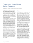 Concepts for Future Nuclear Rocket Propulsion By Robert W. Bussard, Los Alamos Scientific Laboratory Robert W. Bussard is on the sta of the Division Oce of th Nuclear Propulsion Division of the Los Alamos Scientific Laboratory. He received the B.S. and M.S. degrees in engineer ing om the University of California, Los Angeles. He entered rocket work in 1949 on the Falcon missile program at Hughes Aircra Company. Foowing this, he spent several years in high power density reactor development on the ANP Project at th Oak Ridge National Laboratory. Mr. Bussard has been activ in the nuclear rocket program since its inception and is th author of numerous classified papers in this and aied fields. H is currently at Princeton University. The fundamentals, problems and potentialities of rocket propulsion systems powered by heat exchanger nuclear reactors have often been discussed in the technical literature.1,2 ,3 In such systems, a reactor with solid fuel structure is used as an energy source to heat a working fluid which is then expelled through an exhaust nozzle, in the conventional fashion. Fission energy thus sup plants chemical energy in the rocket motor combustion chamber. This straightforward approach is in the pre sent tradition of reactor development adapting the atom to the boiler, so to speak, rather than the other way around. Unfortunately this approach places an arti ficial upper limit on estimates of potential nuclear rocket performance, since all conventional heat engines, whether chemical or nuclearpowered, are fundamen tally limited by the energy of the molecular rather than the nuclear bond. The energy available from fission of U235 is about 107 times that from chemical reaction of an equal mass of high explosive or other combustible mixture. In addi tion, fission energy appears principally as kinetic energy of the two fission fragments, each with an energy of 60 to 100 MeV, corresponding to a kinetic “temperature” of the order of 1012 R. The energy released as a result of other nuclear processes, such as fusion, beta decay and alpha emission, can also give rise to very energetic sev eral MeV particles. It is clear that nuclear interaction processes oer a tremendous potential advantage over chemical reactions, which can never yield more than a few eV per particle. Jet Propulsion, April 1958 Fusion First in interest, and certainly most speculative, is the application of fusion energy to rocket propulsion. Fusion reactions in deuterium gas yield a variety of low mass particles T, He3, He4, p and n with energies of several MeV each. If it were possible to expel the products of these fusion reactions rearward from a rocket vehicle, the eective specific impulse of the “propellant” would be about 3 x 106 lbf sec/lbm,4 some 104 larger than pres ently attainable from chemical rocket propellants. More likely, the products themselves could not practically be constrained to move unidirectionally; however large masses of nonfusioned gas could be heated to very high temperature by collisions with the energetic fusion products, resulting in high specific impulse performance even though only a small fraction of the fusionable fuel has been “burned.” For example, a gas mixture in which only one DD fusion reaction has taken place for each 104 D nuclei present will reach a bulk temperature of about 7 x 106 R neglecting all losses and will give a spe cific impulse of roughly 3 x 104 sec when expelled through a proper nozzle configuration. With this spe cific impulse, a 100ton rocket could take o from the earth, land on the moon and return, all under power, with the expenditure of only 5 tons of propellant. Of course, gases at temperatures of the order of 106 R and higher cannot be contained by solid walls, at least at present, even with use of advanced methods of liquid cooling. However, since gases are highly ionized at these temperatures it is possible, in theory, to contain them within appropriately shaped magnetic fields. This ap proach is under investigation in the current thermonu clear power program5, but no satisfactory solution to the containment problem has yet been announced. It is evident that thermonuclear fusion reactions can yield propellant temperature and performance far be yond that available conventionally today if such reac tions can be made to “go” in a controllable manner. It is equally evident that speculation on the possible forms weight, size, performance, etc. of thermonuclear powered propulsion systems is fruitless until the con trolled release of fusion energy is an accomplished fact. 1 Radioisotope Decay6 Many radioisotopes are found in nature e.g., Ra, Rd, etc., others result from the fission of uranium or pluto nium nuclei e.g., Sr90, etc. and still others can be manu factured by neutron irradiation of stable elements placed in nuclear reactors. The prime diculty in considering the use of fission product isotopes is that they do not appear singly, but are formed as part of a large group of “mixed” fission products. Chemical separation processes are necessary to isolate any one desired fission product from the mix ture. On the other hand, radioisotope production by irradiation of a stable element results in the formation of the desired isotope mixed only with the parent target element. No chemical separation plants are required as for the extraction of single fission products; however, it is necessary to utilize reactors especially designed for irradiation usage. Some characteristics of potentially useful radioisotopes of both types are shown in Table 1. The decay of a radioactive isotope is generally accompa nied by the release of fairly large amounts of energy car ried by beta particles electrons, gamma photons or alpha particles. Energetic photons are highly penetrating and must pass through large masses of material in order to lose their energy. Alpha particles and high energy electrons have mass and are charged, and lose their en ergy quickly 