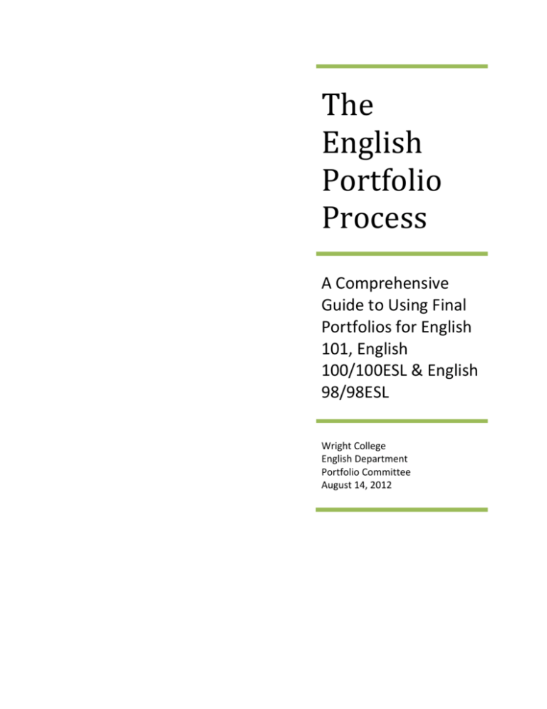 The English Portfolio Process A Comprehensive Guide to Using Final Portfolios for English 101, English 100/100ESL & English 98/98ESL Wright College English Department Portfolio Committee August 14, 2012 The English Portfolio Process Table of Contents: 1. Rationale for the Portfolio Process 2. English Courses and Course Completion 3. Cohorts/Mentoring System Designated Mentors for Adjuncts Designated Cohorts 4. Required Meetings Course Orientation Meetings for Adjuncts Initial Fall 2012 Meeting Cohort Meetings: Midterm and End-of-Term 5. Specific Components of the Portfolio for Each Course 6. Due Date of Portfolios 7. In-Class Exit Essay Component of the Portfolio Eligibility Make-Ups Time Frame Computer Labs Prompts Conditions Proctoring: Day One and Day Two 8. Reading and Evaluation of Portfolios Date and Time Eligibility for Evaluation Standard Language for Course Syllabi: English 101, English 100/100ESL, and English 98/98ESL Scoring of In-Class Exit Essay and Final Portfolio Weight of Portfolios in Final Grades Cohort Reading Process 9. Data Collection 10. Appendix: The appendix includes the following items: Portfolio Guide for English 98/98ESL Portfolio Guide for English 100/100ESL Portfolio Guide for English 101 Sample English 98/98ESL In-Class Exit Paper Prompts Sample English 100/100ESL In-Class Exit Essay Prompts Sample English 101 In-Class Exit Essay Prompts Reflective Paper Prompt for English 98/98ESL Reflective Essay Prompt for English 100/100 ESL Reflective Essay Prompt for English 101 Cover/Evaluation Sheet for English 98/98ESL Cover/Evaluation Sheet for English 100/100ESL and Cover/Evaluation Sheet for English 101 CCC English Rubric Wright Exit Essay Rubric Data Collection Sheet 1 The English Portfolio Process 1. Rationale of the Portfolio Process The English Department has voted to use portfolios with instructor cohorts because this process allows for: the demonstration of our value of and respect for students’ academic efforts and abilities as a whole. the elimination of the pressure of one measure, or exit exam, determining the success or failure of a student. several types of academic writing experiences, including revised essays, in-class essays, and a final reflective/self-assessment paper, to be part of assessment. more compatibility with the goals of a process-oriented writing course. the opportunity for students to examine their writing holistically, to reflect upon their growth as writers, and to capture this work in a concrete way. the incorporation of each instructor’s knowledge of a student’s work in determining readiness for advancement to the next level in the English sequence (because the instructor is present in the cohort), thereby eliminating the appeals process. greater communication and support among the members of instructor cohorts. clearer alignment of departmental course objectives and SLOs. the possibility of the use of course portfolios for program evaluation. 2. English Courses and Course Completion The portfolios will be used for English 98/98ESL, English 100/100ESL, and English 101. Although the weight of the portfolio in determining final grades is up to individual instructors (see section on evaluation of portfolios for more detailed information), in order to pass the above-stated English classes, students must receive a passing grade on the final portfolio. Please note that instructors are not limited to this final departmental portfolio. While the final departmental portfolio should only contain the items specified in this document, instructors are free to employ another portfolio for assessment purposes for their own classes. 3. Cohorts/Mentoring System Designated Mentors for Adjuncts: At this time (Fall 2012), Chris Leonard and Tara Whitehair will serve as mentors for all adjuncts, as mentoring is the focus of their tenure project. The English chair and co-chairs will also serve as mentors. Designated Cohorts: The designated cohorts of teachers will comprise both full-time and adjunct instructors for each course level. Every English 98/98ESL, English 100/100ESL, and English 101 adjunct instructor will be in a cohort; every full-time English Department member will be in a cohort. We are completely dependent on everyone’s cooperation for the success of this process, and we hope that all will see its significant benefits to students, faculty and the department. The specific cohorts will be determined according to the English course, section or time of day, number of sections (or portfolios), and balance. 2 The English Portfolio Process The cohorts will be co-chaired by one full-time and one adjunct faculty member. The responsibilities of the co-chairs will be to contact the members of their cohort, to arrange for and facilitate the two cohort meetings described below, and to submit the number of hours worked for each adjunct after the two meetings. 4. Required Meetings Each semester, there will be three meetings: 1) course orientation meeting (adjuncts only); 2) cohort midterm meeting to benchmark student papers (adjuncts and full-timers); and 3) cohort end-of-term meeting to evaluate portfolios (adjuncts and full-timers). Course Orientation Meeting for Adjuncts: Every semester, there will be a course orientation meeting for English 98/98ESL, English 100/100ESL and English 101 at the beginning of the term. The English 98/98ESL and English 100/100ESL instructors will meet together; the English 101 instructors will meet separately. If an instructor teaches English 101 and English 98/98ESL or 100/100ESL, then she/he should attend the English 101 meeting and simply meet with a mentor to review the English 98/98ESL or 100/100ESL materials. This meeting will be required for new adjuncts and recommended for returning adjuncts. The purpose of the meeting is to review course syllabi, books, and the portfolio process and materials. Initial Fall 2012 Meeting: Mandatory for All The initial meeting for all full-time faculty in the English Departm