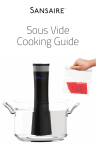 Sous Vide Cooking Guide What is sous vide? Sous vide is a cooking method that uses precise temperature control to achieve perfect, repeatable results that you just can’t replicate through any other method. Foods are cooked evenly from edge to edge, to exactly the doneness you want. And because foods won’t overcook while they hang out in the water bath, dinner is ready when you are. The world’s best chefs rely on sous vide, and now you can too. Cooked Sous Vide with the Sansaire Cooked Traditionally Why cook sous vide? FOODIES The Sansaire is used in some of the world’s best restaurants. Professional chefs rely on sous vide for precise, predictable results. Now you can too! HEALTHY EATERS Vegetables retain all of their nutrients because the bag is sealed—there’s nowhere for nutrients to escape! Also, cooking foods in a sealed environment allows you to coat proteins and vegetables with a fraction of the amount of oil or butter. FAMILIES Enjoy the same lifestyle benefits of slow-cooker cooking but without dried-out, overcooked proteins. HOLIDAY HOSTS No more dried-out turkey, overcooked prime rib, tough brisket, or lamb. Your proteins will always be perfectly juicy, even if the football game goes into overtime or your guests arrive late. BBQ & GRILLING ENTHUSIASTS Smoke for flavor, cook with the Sansaire for texture. The most succulent barbecue on the planet is cooked sous vide. NEW MOTHERS Heat milk or formula to precisely 98.6°F for worry-free feeding. APARTMENT DWELLERS Make whole meals in the Sansaire with no cookware to clean afterward. The foods in each row were heated to the same internal temperature. 1 2 Sealing your food Vacuum sealers aren’t required for most foods cooked with the Sansaire. Vegetables, fish, poultry, and other proteins that cook for less than eight hours can be sealed using zip-top bags and the water displacement method. We recommend using name-brand bags made of polyethylene or polypropylene (the material is listed in small print on the box). Always use bags labeled as BPA-free, and that do not contain PVCs. Due to their sturdier construction, freezer bags are a great choice. Setting up your Sansaire 1 Place your food in a zip-top bag. 2 Add a small amount of neutraltasting oil to the bag to help fill in air gaps. 3 While holding the top of the bag open, slowly lower it into a container of water. The pressure of the water will squeeze the air out of the bag. 4 Just before the top of the bag reaches the water, zip it closed. 1. Pick a container large enough to hold your food, and with plenty of room for water to circulate. We recommend a polycarbonate food storage container, or a large metal pot. Avoid plastic containers made with BPAs or PVC materials. 2. Attach the Sansaire to the side of the container using the clamp. Add water until the level is above the Minimum Fill line on the Sansaire, but below the Maximum Fill line. Remember that the water level will rise when you add your food. 3. Plug in the Sansaire. 4. Press the power button on the top of the unit. This turns on the display and makes the circulator heat the water to the set target temperature. Set the target temperature of the water bath by turning the silver temperature ring above the display. The Sansaire automatically keeps the water at the target temperature until you turn it off. Your water bath is now ready for cooking! 3 For cooking times longer than eight hours, we recommend sealing foods with a vacuum sealer. 4 How to cook eggs sous vide Cooking eggs sous vide is a rite of passage for every owner of the Sansaire. Whereas perfectly poaching an egg is a difficult and noteworthy achievement in traditional cooking, you can perfectly poach a dozen eggs sous vide with your eyes closed. By allowing the eggs to cook slowly over 45 minutes, their texture will become fudgy and silken. You’re about to upgrade your brunch game. TIME TO COMPLETE THINGS YOU’LL NEED 45 minutes (5 minutes hands-on) Just your Sansaire 3 4 SET UP YOUR SANSAIRE (see page 3) Pick a container that will be large enough to fit the number of eggs you want to cook, with extra room left over for water to circulate. A small pot is a great choice. 2 COOK FOR 45 MINUTES Your eggs will be ready in 45 minutes, so you’ve got some time to finish Sunday's crossword puzzle. Here’s a hint: eight letters, a two-word phrase for the perfect way to cook eggs. 5 1 ADD EGGS TO THE WATER BATH Nature was kind enough to seal eggs inside their own sous vide packaging (the shell!) so it’s not necessary to use bags when cooking whole eggs. Because the water will be hot, and because we don’t want the eggs to crack, lower them gently into the water bath using a spoon. REMOVE, RINSE & SERVE Using tongs or a slotted spoon, remove the eggs from the bath. Run the shells under cold water for a few seconds until they’re cool enough to handle. Crack the shells gently and decant perfectly cooked sous vide eggs onto the dish of your choice. PICK YOUR PERFECT EGG This is entirely a matter of personal preference. Do you like your eggs runny and soft, or thick and spreadable? Pick your doneness and set your Sansaire to the listed temperature. Runny 62°C / 143.6°F Medium Poached 68°C / 154.4°F 5 Just Set 65.5°C / 149.9°F Soft-Boiled 73°C / 163.4°F Now that you’ve violated the laws of physics by producing such an amazing egg, it’s time to share with others. Post your results to the interwebs with hashtag #sansaire, and we’ll brag on your behalf. 6 How to cook steak sous vide 3 This is going to be a little different than the way you’ve cooked steaks in the past, but you’re going to love the results. Achieving the right doneness (rare, medium-rare, medium, and so on) doesn’t require expert timing or x-ray vision. All you have to do is choose the temperature you prefer. TIME TO COMPLETE THINGS YOU’LL NEED 4 SET UP YOUR SANSAIRE (see page 3) 5 Pick a container that will be large enough to fit your food, with extra room left 