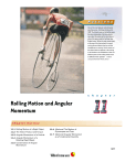 P U Z Z L E R One of the most popular early bicycles was the penny – farthing, introduced in 1870. The bicycle was so named because the size relationship of its two wheels was about the same as the size relationship of the penny and the farthing, two English coins. When the rider looks down at the top of the front wheel, he sees it moving forward faster than he and the handlebars are moving. Yet the center of the wheel does not appear to be moving at all relative to the handlebars. How can different parts of the rolling wheel move at different linear speeds? (© Steve Lovegrove/Tasmanian Photo Library) c h a p t e r Rolling Motion and Angular Momentum Chapter Outline 11.1 11.2 11.3 11.4 Rolling Motion of a Rigid Object The Vector Product and Torque Angular Momentum of a Particle Angular Momentum of a Rotating Rigid Object 11.6 (Optional) The Motion of Gyroscopes and Tops 11.7 (Optional) Angular Momentum as a Fundamental Quantity 11.5 Conservation of Angular Momentum 327 328 CHAPTER 11 Rolling Motion and Angular Momentum I n the preceding chapter we learned how to treat a rigid body rotating about a fixed axis; in the present chapter, we move on to the more general case in which the axis of rotation is not fixed in space. We begin by describing such motion, which is called rolling motion. The central topic of this chapter is, however, angular momentum, a quantity that plays a key role in rotational dynamics. In analogy to the conservation of linear momentum, we find that the angular momentum of a rigid object is always conserved if no external torques act on the object. Like the law of conservation of linear momentum, the law of conservation of angular momentum is a fundamental law of physics, equally valid for relativistic and quantum systems. 11.1 7.7 ROLLING MOTION OF A RIGID OBJECT In this section we treat the motion of a rigid object rotating about a moving axis. In general, such motion is very complex. However, we can simplify matters by restricting our discussion to a homogeneous rigid object having a high degree of symmetry, such as a cylinder, sphere, or hoop. Furthermore, we assume that the object undergoes rolling motion along a flat surface. We shall see that if an object such as a cylinder rolls without slipping on the surface (we call this pure rolling motion), a simple relationship exists between its rotational and translational motions. Suppose a cylinder is rolling on a straight path. As Figure 11.1 shows, the center of mass moves in a straight line, but a point on the rim moves in a more complex path called a cycloid. This means that the axis of rotation remains parallel to its initial orientation in space. Consider a uniform cylinder of radius R rolling without slipping on a horizontal surface (Fig. 11.2). As the cylinder rotates through an angle , its center of mass moves a linear distance s R (see Eq. 10.1a). Therefore, the linear speed of the center of mass for pure rolling motion is given by v CM d ds R R dt dt (11.1) where is the angular velocity of the cylinder. Equation 11.1 holds whenever a cylinder or sphere rolls without slipping and is the condition for pure rolling Figure 11.1 One light source at the center of a rolling cylinder and another at one point on the rim illustrate the different paths these two points take. The center moves in a straight line (green line), whereas the point on the rim moves in the path called a cycloid (red curve). (Henry Leap and Jim Lehman) 329 11.1 Rolling Motion of a Rigid Object θ R s Figure 11.2 In pure rolling motion, as the cylinder rotates through an angle , its center of mass moves a linear distance s R. s = Rθ motion. The magnitude of the linear acceleration of the center of mass for pure rolling motion is a CM d dv CM R R dt dt (11.2) where is the angular acceleration of the cylinder. The linear velocities of the center of mass and of various points on and within the cylinder are illustrated in Figure 11.3. A short time after the moment shown in the drawing, the rim point labeled P will have rotated from the six o’clock position to, say, the seven o’clock position, the point Q will have rotated from the ten o’clock position to the eleven o’clock position, and so on. Note that the linear velocity of any point is in a direction perpendicular to the line from that point to the contact point P. At any instant, the part of the rim that is at point P is at rest relative to the surface because slipping does not occur. All points on the cylinder have the same angular speed. Therefore, because the distance from P to P is twice the distance from P to the center of mass, P has a speed 2v CM 2R. To see why this is so, let us model the rolling motion of the cylinder in Figure 11.4 as a combination of translational (linear) motion and rotational motion. For the pure translational motion shown in Figure 11.4a, imagine that the cylinder does not rotate, so that each point on it moves to the right with speed v CM . For the pure rotational motion shown in Figure 11.4b, imagine that a rotation axis through the center of mass is stationary, so that each point on the cylinder has the same rotational speed . The combination of these two motions represents the rolling motion shown in Figure 11.4c. Note in Figure 11.4c that the top of the cylinder has linear speed v CM R v CM v CM 2v CM , which is greater than the linear speed of any other point on the cylinder. As noted earlier, the center of mass moves with linear speed v CM while the contact point between the surface and cylinder has a linear speed of zero. We can express the total kinetic energy of the rolling cylinder as 7.2 K 12I P 2 (11.3) where IP is the moment of inertia about a rotation axis through P. Applying the parallel-axis theorem, we can substitute I P I CM MR 2 into Equation 11.3 to obtain K 12 I CM 2 12MR 2 2 P′ Q 2vCM vCM CM P Figure 11.3 All points on a rolling object move in a direction perpendicular to an axis through the instantaneous point of contact P. I