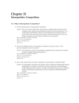 Chapter 15 Monopolistic Competition 15.1 What Is Monopolistic Competition? 1) List four characteristics of monopolistic competition. Answer: There are a large number firms; each produces a slightly different product; firms compete on price, quality and marketing; and firms are free to enter and exit. As a result of these characteristics, there are no dominant firms and each firms have a small market share. Because the firms produce differentiated products, firms can charge a markup and, in the long run, firms have excess capacity. Topic: Monopolistic competition, definition Skill: Level 2: Using definitions Objective: Checkpoint 15.1 Author: CD 2) "One of the defining features of monopolistic competition is product variety." Is the previous statement correct or incorrect? Answer: The statement is correct. In monopolistic competition firms compete by producing similar but slightly differentiated products. Topic: Monopolistic competition, definition Skill: Level 2: Using definitions Objective: Checkpoint 15.1 Author: WM 3) How do the characteristics of perfect competition and monopolistic competition differ? Answer: In monopolistic competition, the products sold are similar but differentiated, thereby enabling firms to compete on the basis of product development and marketing to further differentiate their products. In perfect competition the products are identical, thereby eliminating the opportunity for firms to compete by differentiating their product. Topic: Monopolistic competition, definition Skill: Level 1: Definition Objective: Checkpoint 15.1 Author: TS 316 Bade/Parkin œ Foundations of Economics, Third Edition 4) Why is collusion about the price and amount of output impossible in monopolistic competition? Answer: The smaller the number of firms, the more likely collusion is to occur. Monopolistic competition has too many firms for collusion to be successful. Topic: Monopolistic competition, definition Skill: Level 2: Using definitions Objective: Checkpoint 15.1 Author: PH 5) What do demand and marginal revenue curves look like in monopolistic competition? How do they compare to the demand and marginal revenue curves in perfect competition and monopoly? Answer: In monopolistic competition, the product is differentiated. This fact gives each firm some control over price, so each firm's demand curve is downward sloping. Because there are many close substitutes for these firms' goods, demand is elastic. These firms must lower their price to sell more; therefore the marginal revenue curve is beneath the demand curve. In perfect competition, the product is homogeneous, which makes firms price-takers, able to sell as much as they wish at the market price. Therefore, marginal revenue equals price, and the marginal revenue curve and the demand curve are the same and are horizontal. In monopoly, there is only one firm. The firm faces the market demand, which is steep, because there are no close substitutes for the good. The firm must lower its price to sell more, so for a single-price monopoly, the marginal revenue curve is beneath the demand curve. Topic: Monopolistic competition, definition Skill: Level 5: Critical thinking Objective: Checkpoint 15.1 Author: SB 6) How would a merger between Coca-Cola and Pepsi Cola affect the four-firm concentration ratio for the soft drink market? How would it affect the Herfindahl-Hirschman Index for the soft drink market? Answer: Both Coca-Cola and Pepsi Cola are among the four largest firms in the soft drink market, so a merger between the two firms would (drastically) raise the four-firm concentration ratio and (drastically) raise the Herfindahl-Hirschman Index. Topic: Four-firm concentration ratio Skill: Level 3: Using models Objective: Checkpoint 15.1 Author: JC Chapter 15 Monopolistic Competition 317 7) What is the Herfindahl-Hirschman Index and what does it measure? Answer: The Herfindahl-Hirschman Index, or HHI, is an index used to measure the extent to which a market is dominated by a small number of firms. The HHI equals the sum of the squared percentage market shares of each of the 50 largest firms in the market. A monopoly will have a HHI of 10,000 whereas perfect competition will have a small HHI. Topic: Herfindahl-Hirschman Index Skill: Level 1: Definition Objective: Checkpoint 15.1 Author: SA 8) If the Herfindahl-Hirschman Index for an industry is 8,528, is the industry competitive or concentrated? Answer: With a Herfindahl-Hirschman Index of 8,528, the industry is quite concentrated or, in other words, the industry is not very competitive. Topic: Herfindahl-Hirschman Index Skill: Level 2: Using definitions Objective: Checkpoint 15.1 Author: JC 9) What is the difference between a four-firm concentration ratio and a Herfindahl-Hirschman Index? Answer: A four-firm concentration ratio is the percentage of the total revenue in an industry accounted for by the four largest firms in the industry. The Herfindahl-Hirschman Index sums the squares of the market shares of the 50 largest firms. Topic: Herfindahl-Hirschman Index Skill: Level 1: Definition Objective: Checkpoint 15.1 Author: TS 10) The four largest firms in an industry account for the following value of industry revenues: 12 percent, 8 percent, 5 percent and 4 percent. Calculate the four-firm concentration ratio. Would this industry be regarded as competitive or concentrated? Answer: The four-firm concentration ratio is 29 percent. The four-firm concentration ratio is less than 40 percent, so the industry would be regarded as competitive. Topic: Four-firm concentration ratio Skill: Level 3: Using models Objective: Checkpoint 15.1 Author: WM 318 Bade/Parkin œ Foundations of Economics, Third Edition Total revenue Firm (millions of dollars) A 12 B 10 C 5 D 3 11) An industry's total revenue is $100 million. The above table shows the total revenue of the four largest firms in an industry. a. Calculate this industry's four-firm concentration ratio. b. Is this industry competitive? c. What m