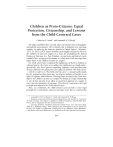 Children as Proto-Citizens: Equal Protection, Citizenship, and Lessons from the Child-Centered Cases Catherine E. Smith†* and Susannah W. Pollvogt** The rights of children have recently taken a prominent role in the popular and judicial consciousness. This is largely due to litigation over marriage equality. In authoring the majority opinion in United States v. Windsor, 133 S. Ct. 2675 (2013), Justice Kennedy cited tangible and psychic harm to the children of same-sex couples as a basis for invalidating the federal Defense of Marriage Act. Post-Windsor, myriad state and federal courts similarly have recognized the manner in which state-level marriage bans inflict harm on the children of same-sex couples. Yet, while courts have recognized the significance of harm to children as a factual matter, they have yet to address its significance as a legal matter. Specifically, they have ignored compelling Supreme Court precedent that directly addresses the equal protection rights of children. This body of law — which we refer to as “the child-centered cases” — unequivocally stands for the proposition that states may not deprive children of benefits in an effort to regulate adult behavior. Marriage bans do exactly this. Such laws deprive the children of same-sex couples the benefit of a legal relationship to one of their parents in an effort to incentivize opposite-sex couples to enter into the institution of marriage. This directly contravenes the legal principle articulated in the child-centered cases. Thus, at a minimum, the child-centered cases provide a clear legal principle for resolving the same-sex marriage issue. But we contend that Copyright © 2014 Catherine E. Smith and Susannah W. Pollvogt. Professor, University of Denver Sturm College of Law. J.D. and M.P.A., University of South Carolina. The author is indebted to Kaelyn Gustafson, Anni-Michelle JeanPierre, and Ty Nagamatsu for their research assistance. ** Associate Professor, Washburn University School of Law. J.D., Yale Law School, 1998; B.A., Williams College, 1994. Thanks to the participants in the UC Davis Law Review’s Not Equal Yet Symposium. Thanks also to my colleagues Alex Glashausser, Craig Martin, and David Rubenstein, for feedback on the ideas presented in this essay. † * 655 656 University of California, Davis [Vol. 48:655 these cases offer much more. In particular, in the child-centered cases we see the Court giving greater meaning to equal protection guarantees because it views children as proto-citizens. In this context, the Court recognizes certain substantive rights — namely, public education, family formation, and the right to transfer economic benefits from one generation to the next — as foundational to citizenship, and therefore worthy of special judicial solicitude. The Court recognizes that depriving children of these rights at the beginning of life sets a pattern of marginalization and deprivation that has lasting effects on their ability to develop into full-fledged citizens. The citizenship theme running through the child-centered cases is significant for several reasons. First, it connects equal protection jurisprudence to the concept of citizenship. Second, it draws attention to the substantive rights associated with citizenship-formation. Third, while the special concerns articulated in these cases are inspired by the fact that the plaintiffs are children, recognizing the interference with the individual’s ability to develop as a citizen can and should be extended to adults as well. In this sense, we are all proto-citizens — citizens in progress — entitled to basic civil rights necessary to thrive in our democracy. TABLE OF CONTENTS INTRODUCTION ................................................................................... 657 I. THE IMPLICATIONS OF THE CHILD-CENTERED CASES BEYOND THE SAME-SEX MARRIAGE CONTEXT ......................................... 660 A. A Brief History of Citizenship and the Fourteenth Amendment ....................................................................... 661 B. Connecting the Child-Centered Cases to Themes of Citizenship ........................................................................ 663 II. CHILDREN AS PROTO-CITIZENS ................................................. 664 A. The Right to Public Education: Black Children as ProtoCitizens ............................................................................. 665 B. The Right to the Benefits of Family Formation: NonMarital Children as Proto-Citizens .................................... 668 C. The Right to Public Education Revisited: Undocumented Immigrant Children as Proto-Citizens ............................... 671 CONCLUSION....................................................................................... 674 2014] Children as Proto-Citizens 657 INTRODUCTION The rights of children have recently taken a prominent role in the popular and judicial consciousness. This is largely due to litigation over marriage equality. While the marriage equality movement — and opposition to it — initially centered on the rights of adults, the rhetoric has shifted. Now, defenders of marriage bans cite the benefits of marriage for children.1 Likewise, proponents of marriage equality point out that same-sex couples also have children, and that those children are equally entitled to whatever benefits the institution of marriage bestows.2 Judicial concern for the rights of children surfaced in United States v. Windsor, where Justice Kennedy cited tangible and psychic harm to the children of same-sex couples as a basis for invalidating the federal Defense of Marriage Act (“DOMA”): [DOMA] humiliates tens of thousands of children now being raised by same-sex couples. The law in question makes it even more difficult for the children to understand the integrity and closeness of their own family and its concord with other families in their community and in their daily lives. . . . .... DOMA al