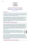 Page 1 Department of Lifelong Learning: Study Skills Series Referencing - The Harvard System (Download pdf version) Introduction As a student, it is important that you identify in your assessment when you are using the words or ideas of another author. The most accepted way of acknowledging the work of another author is to use a referencing system. At the Department of Lifelong Learning you are required to use the Harvard referencing system. The following guide tells you why you need to use a referencing system, shows you how to insert references in the text of your assignments, and shows you how to compile a reference list. While there are many variations on the ‘Harvard’ system, the one presented in this guide is the most simple. It does away with most usages of ‘p’ and ‘pp’ to signify page numbers and it replaces some of the commas with colons. Also, this guide is by no means an exhaustive list of all the referencing conventions that you will require in your academic life. Why you should use a referencing system As a part of an academic community, it is important that you show the reader where you have used someone else’s ideas or words. Failure to properly reference using the Harvard system may make the reader think that you are cheating by claiming someone else’s work as your own. In the academic environment, we call this plagiarism and it is seen as a very serious offence. Please remember that plagiarism is not just when you directly copy words from another student’s or expert’s work. Plagiarism also occurs when you re-word someone else’s ideas in your own work and you do not give credit to the original source. Plagiarism can have disastrous consequences for students. If you are suspected of plagiarism you may find that your assignment receives a grade of zero. In extreme or repeated cases, you may find that your enrolment at the university is reviewed. For further information, please consult section 3 of the student handbook. On a more positive note, referencing is important for reasons other than avoiding plagiarism. When you reference correctly you are demonstrating that you have read widely on a topic. You are also supporting your hypothesis with comments from expert authors. This lends credibility to your own work. Also, by correctly referencing, you allow the marker or reader to follow-up your references and to check the validity of your arguments for themselves. This is an important part of the academic process as it leads to student accountability. Collecting all the details: Accurate referencing Page 2 In order to have an accurate record of what you have researched and therefore an accurate reference, it is important that you write down the details of your sources as you study. When taking notes, use a separate page for each new book, journal article, or electronic source. At the top of each page, clearly record the following information for future reference. For books, record: l l l l l l The author’s or editor’s name (or names) The year the book was published The title of the book If it is an edition other than the first The city the book was published in The name of the publisher For journal articles record: l l l l l l The author’s name or names The year in which the journal was published The title of the article The title of the journal The page number/s of the article in the journal As much other information as you can find about the journal, for example the volume and issue numbers For electronic resources, try to collect the information on the left if it is available, but also record: l l l The date you accessed the source The electronic address or email The type of electronic resource (email, discussion forum, WWW page, etc) In addition to these details, when you are taking notes, if you copy direct quotations or if you put the author’s ideas in your own words, write down the page numbers you got the information from. Writing the assessment: What do I need to reference? When you are writing your assessment, be sure to type in reference information as you add in the ideas of other authors. This will save you time and will ensure that you reference all sources properly. Whenever you use someone else’s ideas or words, you must put in a reference. The only exception to this rule is when the information you have read somewhere is common knowledge or ‘public domain’ information. For example, you would not need to include a reference if you stated in an assignment that Shakespeare wrote plays and sonnets in Elizabethan times. Always reference: l Direct quotations – this is when you copy another author’s material word-for-word. You should show the reader that it is a direct quote by placing the material in inverted commas. Traditionally, double inverted commas have been used (“) but it is now acceptable, and preferable to use single inverted commas (‘). Sometimes it is difficult to avoid the direct quotation as the author’s words may precisely describe the point you are trying to make. However, do try to avoid the Page 3 l overuse of direct quotations; try to paraphrase the author’s work where possible. Please note that when you use direct quotations, you must reproduce the author’s words exactly , including all spelling, capitalisation, punctuation, and errors. You may show the reader that you recognise an error and that you are correctly quoting the author by placing the term ‘sic’ in brackets after the error. Paraphrasing – this is when you take another author’s ideas and put them into your own words. You are still copying someone else’s work, so you must reference it. You do not need to use inverted commas when you paraphrase, but you must clearly show the reader the original source of your information. Referencing in the text of your assessment The following section shows you a number of different examples when quoting and paraphrasing in the text of your assessment. In all references, you will need to list 