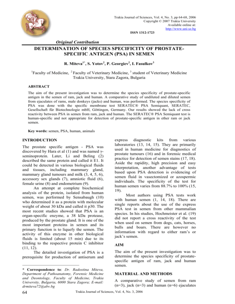 Trakia Journal of Sciences, Vol. 4, No. 3, pp 64-68, 2006 Copyright © 2007 Trakia University Available online at: http://www.uni-sz.bg ISSN 1312-1723 Original Contribution DETERMINATION OF SPECIES SPECIFICITY OF PROSTATESPECIFIC ANTIGEN (PSA) IN SEMEN R. Miteva1*, S. Yotov2, P. Georgiev2, I. Fasulkov3 1 Faculty of Medicine, 2 Faculty of Veterinary Medicine, 3 student of Veterinary Medicine Trakia University, Stara Zagora, Bulgaria ABSTRACT The aim of the present investigation was to determine the species specificity of prostate-specific antigen in the semen of ram, jack and human. A comparative study of undiluted and diluted semen from ejaculates of rams, male donkeys (jacks) and human, was performed. The species specificity of PSA was done with the specific membrane test SERATEC® PSA Semiquant, SERATEC, Gesellschaft für Biotechnologie mbH, Göttingen, Germany. Our results showed the lack of cross reactivity between PSA in semen from ram, jack and human. The SERATEC® PSA Semiquant test is human-specific and not appropriate for detection of prostate-specific antigen in ether ram or jack semen. Key words: semen, PSA, human, animals INTRODUCTION The prostate specific antigen - PSA was discovered by Hara et al (1) and was named γseminoprotein. Later, Li and Beling (2) described the same protein and called it Е1. It could be detected in various biological fluids and tissues, including mammary gland, mammary gland tumours and milk (3, 4, 5, 6), accessory sex glands (7), amniotic fluid (6), female urine (8) and endometrium (9). An attempt at complete biochemical analysis of the protein, isolated from human semen, was performed by Sensabaugh (10) who determined it as a protein with molecular weight of about 30 kDa and called it p30. The most recent studies showed that PSA is an organ-specific enzyme, a 38 kDa protease, produced by the prostate gland. It is one of the most important proteins in semen and its primary function is to liquefy the semen. The activity of this enzyme in other biological fluids is limited (about 15 min) due to its binding to the respective protein С inhibitor (11, 12). The detailed investigation of PSA is a prerequisite for production of antiserum and 1 * Correspondence to: Dr. Radostina Miteva, Department of Pathoanatomy, Forensic Medicine and Deontology, Faculty of Medicine, Trakia University, Bulgaria, 6000 Stara Zagora; E-mail: drmiteva72@abv.bg 64 express diagnostic kits from various laboratories (13, 14, 15). They are primarily used in human medicine for diagnostics of prostate tumours (16) and in forensic medical practice for detection of semen stains (17, 18). Aside the rapidity, high precision and easy interpretation, another advantage of tests based upon PSA detection is evidencing of semen fluid in vasectomized or azospermic individuals. The specificity of the test for human semen varies from 88.7% to 100% (15, 19). Most authors using PSA tests work with human semen (1, 14, 18). There are single reports about the use of the express PSA test in semen from other mammalian species. In his studies, Hochmeister et al. (19) did not report a cross reactivity of the test when used on semen from dogs, cats, horses, bulls and boars. There are however no information with regard to either ram’s or jack’s semen. AIM The aim of the present investigation was to determine the species specificity of prostatespecific antigen of ram, jack and human semen. MATERIAL AND METHODS A comparative study of semen from ram (n=3), jack (n=3) and human (n=6) ejaculates Trakia Journal of Sciences, Vol. 4, No. 3, 2006 MITEVA R.., et al. was performed. Immediately after obtaining the semen, it was evaluated and placed in a water bath at 350 С. The volume of ejaculate (ml), spermatozoa concentration (109 or 106 depending on the species), spermatozoa motility (%) and dead spermatozoa (%) were determined. Spermatozoa counts were counted in a chamber, the motility – in a native preparation and dead spermatozoa were quantified by the method of supravital staining of spermatozoa (20). For determination of the species specificity of PSA, a specific membrane test SERATEC® PSA Semiquant, SERATEC, Gesellschaft für Biotechnologie mbH, Göttingen, Germany, was used. The Seratec PSA test is a chromatographic immunoassay (CIA) for the rapid determination of PSA. Anti-PSA antibodies, immobilized at the test region on a membrane, are used. The prostate-specific antigen in samples is bound to the antibody and forms a PSA-anti-PSAantibody-complex. In this case, the complex binds to anti-mouse antibody, and thus, two red lines develop. These lines are independent of the presence of PSA in the sample and indicate only the correct performance of the test. The positive sample is manifested by the formation of an additional line (21). Analyses of buffer, undiluted semen and semen, diluted 1:500 and 1:1000, were made. For this purpose, a standard buffer solution with neutral pH, recommended by the manufacturer, was used. The detection of results was done according to the instructions and procedures given by the manufacturer (http://www.seratec.com). The negative results were based upon detection of the control line (C) of the test and the internal standard line in the result window. Results, where the control line of the test (C), the internal standard line and the test line (T) were detected, were accepted as positive. Incorrectly analysed samples were present when there was no line in the result window. The time for appearance of the test line was determined. The results from the analysis of seminal fluid in the different species were photographed and compared. RESULTS The data obtained from the analysis of semen in the different species are presented on Tables 1 and 2 and Figs. 1-4. The biological parameters of semen in the different species (Table 1) were within the reference range. Таble 1. Biological parameters of semen (Mean±SEM) Biological parameters of semen Volume, ml Concentration 109 / 