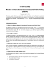 STUDY GUIDE: Master in International Economics and Public Policy (MIEPP) This version: April 14, 2015 This study guide informs you about the rules and policies for the Master’s program in International Economics and Public Policy (MIEPP). It is based on the official examination regulations (the German “Prüfungsordnung” or “PO”). Only the Prüfungsordnung is legally binding. 1) General Information 1.1) What is the Master’s degree in International Economics and Public Policy? The Master’s program in International Economics and Public Policy is a consecutive academic degree program which aims to build upon the knowledge you gained during your first professional degree. By the end of the program, you will have gained a further professional academic degree. 1.2) Is it taught in English? The Master’s program in International Economics and Public Policy is an English-speaking program, meaning that classes (of Economics) will be conducted in English as well as all of the corresponding assessments. You can choose modules taught in German offered by other subject areas (e.g. Management, etc.) for any of your optional modules. If you decide to do this, you should be aware that any assessments or examinations have to be conducted in German. 1.3) What type of degree will I have when I have finished? Once you have successfully completed the study program and passed all of your exams, you will be awarded a “Master of Science” degree in International Economics and Public Policy by the Department of Law, Management and Economics at Johannes Gutenberg University Mainz. 1.4) What will my final grade be made up of? Your final grade for the Master’s degree will be made of your grades from the three following components: The modules which you will take throughout the course of the program The written Master’s thesis The research colloquium 1 2) Basic Program Structure 2.1) What is the basic structure of the Master’s program? The Master’s degree in International Economics and Public Policy is made up of a total of 120 credits. These credits must be broken down as follows: The core modules make up The elective modules make up The Master’s thesis makes up The research colloquium makes up 30 credits, 60 credits, 25 credits, 5 credits. 2.2) What exactly is a “module”? The various courses that form the Master’s program are offered as part of modules. A module is made up of one course or of several individual courses which cover similar topics and are coordinated within the timetable. Each module is worth a certain number of credits (known as Leistungspunkte or LP in German). A module’s credit number roughly reflects the amount of time you need to spend in order to complete the module; this includes time spent going to all of the classes, preparing and revising the course materials, completing any performance-related assessments, preparing for the exam and completing the module exam. 2.3) Do I have to register for modules and courses? In order to attend courses and complete modules, you have to register for the modules and the courses within the set registration period. Furthermore, you are not allowed to take part in a module exam, unless you are registered for the module and the courses of the module. 2.4) How do I complete a module? When will I be awarded the credits? You will only be awarded the credits for a module once you have successfully passed the module exam and have attended and “actively participated” in the courses that make up the module. Your lecturer will inform you of how “active participation” is defined at the beginning of the course. See section 4 for more information on the module exams. 3) Duration of the Program 3.1) How long will it take me to complete the Master’s in International Economics and Public Policy? Including the time needed to complete the Master’s thesis and research colloquium, it should take you two years (four semesters) to successfully complete the Master’s program. 3.2) Is there a timeline that I should follow? So that you can complete your Master’s degree within two years, the program follows a strict timeline. On average, you should strive to achieve 30 credits per semester. 3.3) When should I register for my thesis? 2 You have to register for your Master’s thesis by the end of your fourth academic year at the latest. If you fail to do so, your first attempt for writing the Master’s thesis will be recorded as failed. See section 5 for more information on the Master’s thesis. 4) Module Exams 4.1) What is a module exam and what does it take to pass it? You will take module exams throughout the entire course of your degree. Completing a module exam means that you have completed the whole module. The aim of a module exam is to assess your understanding of the contents and methods covered within the module as well as your ability to apply the skills you have learnt. A module exam can be conducted as a “Final module exam” (“Modulabschlussprüfung”) or as a sequence of “Module part-exams” (“Modulteilprüfungen”). In the case of a “Final module exam” (“Modulabschlussprüfung”), you will be examined about all courses of a module in one exam. You will therefore have to register for all courses in the module. You will be awarded the credits for successfully completing a “Final module exam” if you receive a “pass” or are given a grade of at least “sufficient / 4,0” (see section 7 for information on the German grading system) for the performance-related assessment. If you fail the performance-related assessment, you have the chance to retake the whole module a further two more times. If you do not successfully complete an exam, you should repeat it as soon as possible. In the case of “Module part-exams” (“Modulteilprüfungen”), you will write a separate exam for every course of the module and you are allowed to write these part-exams in different semesters. You will be awarded the 