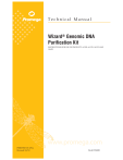 Technical Manual Wizard® Genomic DNA Purification Kit INSTRUCTIONS FOR USE OF PRODUCTS A1120, A1123, A1125 AND A1620. PRINTED IN USA. Revised 12/10 Part# TM050 Wizard® Genomic DNA Purification Kit All technical literature is available on the Internet at: www.promega.com/tbs/ Please visit the web site to verify that you are using the most current version of this Technical Manual. Please contact Promega Technical Services if you have questions on use of this system. E-mail: techserv@promega.com. 1. Description..........................................................................................................1 2. Product Components and Storage Conditions ............................................2 3. Protocols for Genomic DNA Isolation ..........................................................5 A. Isolating Genomic DNA from Whole Blood (300µl or 3ml Sample Volume)...........................................................................5 B. Isolating Genomic DNA from Whole Blood (10ml Sample Volume) ........................................................................................7 C. Isolating Genomic DNA from Whole Blood (96-Well Plate).......................................................................................................9 D. Isolating Genomic DNA from Tissue Culture Cells and Animal Tissue .....................................................................................................11 E. Isolating Genomic DNA from Plant Tissue ...................................................13 F. Isolating Genomic DNA from Yeast................................................................14 G. Isolating Genomic DNA from Gram Positive and Gram Negative Bacteria ....................................................................................16 4. Troubleshooting...............................................................................................17 5. References .........................................................................................................18 6. Appendix ...........................................................................................................19 A. Composition of Buffers and Solutions ............................................................19 B. Related Products.................................................................................................19 1. Description The Wizard® Genomic DNA Purification Kit is designed for isolation of DNA from white blood cells (Sections 3.A, B and C), tissue culture cells and animal tissue (Section 3.D), plant tissue (Section 3.E), yeast (Section 3.F), and Gram positive and Gram negative bacteria (Section 3.G). Table 1 lists the typical yield for DNA purified from each of these sources. The Wizard® Genomic DNA Purification Kit is based on a four-step process (1). The first step in the purification procedure lyses the cells and the nuclei. For isolation of DNA from white blood cells, this step involves lysis of the red blood cells in the Cell Lysis Solution, followed by lysis of the white blood cells and their nuclei in the Nuclei Lysis Solution. An RNase digestion step may be Promega Corporation · 2800 Woods Hollow Road · Madison, WI 53711-5399 USA Toll Free in USA 800-356-9526 · Phone 608-274-4330 · Fax 608-277-2516 · www.promega.com Printed in USA. Revised 12/10 Part# TM050 Page 1 included at this time; it is optional for some applications. The cellular proteins are then removed by a salt precipitation step, which precipitates the proteins but leaves the high molecular weight genomic DNA in solution. Finally, the genomic DNA is concentrated and desalted by isopropanol precipitation. DNA purified with this system is suitable for a variety of applications, including amplification, digestion with restriction endonucleases and membrane hybridizations (e.g., Southern and dot/slot blots). 2. Product Components and Storage Conditions Small-Scale Isolation (minipreps) Product Size Cat.# ® Wizard Genomic DNA Purification Kit 100 isolations A1120 Each system contains sufficient reagents for 100 isolations of genomic DNA from 300µl of whole blood samples. Includes: • • • • • 100ml 50ml 25ml 50ml 250µl Cell Lysis Solution Nuclei Lysis Solution Protein Precipitation Solution DNA Rehydration Solution RNase Solution Product Size Cat.# ® Wizard Genomic DNA Purification Kit 500 isolations A1125 Each system contains sufficient reagents for 500 isolations of genomic DNA from 300µl of whole blood samples. Includes: • • • • • 500ml 250ml 125ml 100ml 1.25ml Cell Lysis Solution Nuclei Lysis Solution Protein Precipitation Solution DNA Rehydration Solution RNase Solution Promega Corporation · 2800 Woods Hollow Road · Madison, WI 53711-5399 USA Toll Free in USA 800-356-9526 · Phone 608-274-4330 · Fax 608-277-2516 · www.promega.com Part# TM050 Page 2 Printed in USA. Revised 12/10 Large-Scale Isolation (maxiprep) Product Size Cat.# Wizard® Genomic DNA Purification Kit 100 isolations A1620 Each system contains sufficient reagents for 100 isolations of genomic DNA from 10ml of whole blood samples. Includes: • • • • 3L 1L 350ml 150ml Cell Lysis Solution Nuclei Lysis Solution Protein Precipitation Solution DNA Rehydration Solution Note: Cat.# A1620 does not include RNase Solution. Items Available Separately Product Cell Lysis Solution Nuclei Lysis Solution Protein Precipitation Solution DNA Rehydration Solution RNase A (4mg/ml) Size 1L 1L 350ml 50ml 1ml Cat.# A7933 A7943 A7953 A7963 A7973 Storage Conditions: Store the Wizard® Genomic DNA Purification Kit at room temperature (22–25°C). See product label for expiration date. Promega Corporation · 2800 Woods Hollow Road · Madison, WI 53711-5399 USA Toll Free in USA 800-356-9526 · Phone 608-274-4330 · Fax 608-277-2516 · www.promega.com Printed in USA. Revised 12/10 Part# TM050 Page 3 Table 1. DNA Yields from Various Starting Materials. Amount of Starting Material Typical DNA Yield RNase T