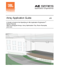 Array Application Guide A Guide to Assist in the Specifying of JBL Application Engineered TM Series Products With Pre-Designed Arrays, Array Optimization Tips, Room Examples, and more v06 Table of Contents Introduction Suspending Loudspeaker Arrays Array Applications: Speech Systems Combination Speech & Music Systems High-Impact Music Systems Gymnasium Systems Array Tips: Modeling Arrays in Rooms Optimizing Long-Throw/Downfill Systems Signal Processing Low Frequency Pattern Control Subwoofer Directional Control Planar Array Frames Array Types: – Two-Element Vertical Array Examples with Vertical Orientation – Two-Element Horizontal Spherical Array Examples – Three-Element Low-Profile Horizontal Planar Array Examples – Two-Element Horizontal Planar Array Example with Subwoofer – Single-Element with Subwoofer Vertical Array Example – Two-Element Horizontal Array with Single Downfill – Two-Element Vertical Array with Rotated Enclosure Examples WRC and WRX Weather Resistant Configurations Painting AE & PD Enclosures AE & PD Series Connector Pin-out Guide Page 3 4-5 6-10 11-15 16-17 18-19 20-21 22 23 24-25 26-28 29 30-31 32 Introduction This edition of the Array Application Guide focuses on how Application Engineered TM Series loudspeakers can provide the building blocks to construct arrays that will offer exceptional coverage in a wide range of room sizes and applications. The arrays in this guide, as in earlier editions, are categorized by configuration and orientation. These configurations help emphasize the versatility of the AE Series loudspeakers as the arrays are upgraded in terms of power handling and pattern control. General performance information including frequency range, nominal coverage, SPL capability, size, and weight are provided for each array. Several of the arrays utilize the available PAF Planar Array Frame hardware for use when applications call for overhead suspension. A further description of this hardware can be found in the JBL publication: AE Series Bracket and Array Frame Handbook available on the JBL Professional website. The AM4212, AM4215 and AM6212 and 6215 mid and high-power models have been replaced by the new AM5212, AM5215 and AM7212 and AM7215 Series models. These new models feature identical enclosure dimensions but offer two additional horn patterns – 60o x 60o and 120o x 60o – for additional flexibility in addressing your design challenges. With the addition of ® the newer generation Differential Drive woofers additional weight reductions are also realized; up to 33lbs (15kgs) on some of the larger arrays. The AM4315/64, AM4315/95, AM6315/64 and AM6315/95 have been replaced by the AM7315/64 and AM7315/95. The AM4200/64, AM4200/95, AM6200/64 and AM6200/95 have been replaced by the AM7200/64 and AM7200/95. The AM6340/64 and AM6340/95 have been discontinued. The AL6115 is replaced by the AL7115 and the AL6125 has been discontinued. The AE Compact Series products, new to the JBL Pro line since the last edition, can easily be integrated into larger AE Series system designs to address areas such as under balcony, front stage lip fill, rear delay zones and other audience zones where a larger AE Series enclosure is not required. Additional information can be found on the JBL Professional website under Installed Sound Products. Also new to the AE family are five additional AE Series subwoofer enclosures. These models include ultra compact 12” and 15” models, a dual 15” model, and two high-output 18” models in both single and dual component models. These new enclosures feature side rigging points at both the front and rear of the enclosure to facilitate easy enclosure suspension when configuring vertical arrays or rear firing elements in a flown cardioid subwoofer arrangement. Additional notes on cardioid subwoofer set-up can be found in the ‘Array Tips’ section. This easy and proven method of arranging subwoofer enclosures will assist the designer in minimizing rear projected on-stage levels and controlling low frequencies throughout the room. Although each room and project has its own demanding set of circumstances, we hope this Array Guide provides an outline for understanding the wide variety of effective solutions that are possible with the AE Series of JBL Professional loudspeakers. 3 Suspending Loudspeaker Arrays IMPORTANT SAFETY WARNING! The information in this section has been assembled from recognized engineering data and is intended for informational purposes only. None of the information in this section should be used without first obtaining competent advice with respect to applicability to a given circumstance. None of the information presented herein is intended as a representation or warranty on the part of JBL. Anyone making use of this information assumes all liability arising from such use. All information presented herein is based upon materials and practices common to North America and may not directly apply to other countries because of differing material dimensions, specifications, and/or local regulations. Users in other countries should consult with appropriate engineering and regulatory authorities for specific guidelines. Correct use of all rigging hardware is required for secure system suspension. Careful calculations should always be performed to ensure that all components are used within their working load limits before the array is suspended. Never exceed the maximum recommended load ratings. Before suspending any speaker system always inspect all components (enclosure, rigging frames, pins, eyebolts, track fittings, etc.) for cracks, deformations, corrosion, missing, loose or damaged parts that could reduce strength and safety of the array. Do not suspend the speaker until the proper corrective action has been taken. Use only load-rated hardware when suspending Application Engineered™ Series and Precision Directivity® Series loudspeakers. Are You New to Loudspeaker Suspension? If so, you should do th