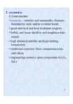2. ceramics (1) introduction • ceramics – metallic and nonmetallic elements bounded by ionic and/or covalent bonds • good electrical and heat insulation property • brittle, and lesser ductility and toughness than metals • high chemical stability and high melting temperature • traditional ceramics: basic components (clay and silica) • engineering ceramics: pure compounds (Al2O3, SiC) 1 (2) ceramic crystal structures (a) ionic and covalent bonding in simple ceramics mixture of ionic and covalent types depends on electronegativity difference 2 (b) simple ionic arrangements • packing of ions depends upon (i) relative size of ions (ii) need to balance electron charges • if the anion does not touch the cation, then the arrangement is unstable coordination number – the number of anions that surround a central cation in an ionic solid radius ratio = rcation/ranion critical radius ratio for stability ex. calculate the critical radius r/R for the triangular coordination (CN = 3) R cos = ——— = 0.866 R+r 0.866R + 0.866r = R 0.866r = 0.134R r/R = 0.134/0.866 = 0.155 30o 3 ex. predict the coordination number for the ionic solids CsCl and NaCl r(Cs+) 0.170 nm ———— = ———— = 0.94 r(Cl ) 0.181 nm cubic coordination CN = 8 for CsCl r(Na+) 0.102 nm ———— = ———— = 0.56 r(Cl ) 0.181 nm octahedral coordination CN = 6 for NaCl 4 (c) cesium chloride crystal structure • CsCl is ionically bonded with radius ratio = 0.94 and CN = 8 • 8 Cl- ion surround a central Cs+ ion at the ( ½ , ½ , ½ ) position • CsBr, TlCl and TlBr have similar structure ex. calculate the ionic packing factor for CsCl (r(Cs+) = 0.170 nm, r(Cl-) = 0.181 nm) √3a = 2r + 2R = 2(0.170 + 0.181) = 0.502 nm a = 0.405 nm 4/3π [(0.170)3+(0.181)3] packing factor = ———————— (0.405)3 = 0.68 5 (d) sodium chloride crystal structure • highly ionically bonded with Na+ ions occupying octahedral sites between FCC Cl- ions and radius ratio = 0.56, CN = 6 • MgO, CaO, NiO and FeO have similar structures ex. calculate the density of NaCl from the crystal structure (r(Na+) = 0.102 nm, r(Cl-) = 0.181 nm) 4 Na+ and 4 Cl- ions per unit cell mass of a NaCl unit cell = 4 × (22.99 + 35.45) × 1.67 × 10-24 = 3.88 × 10-22 g 6 lattice constant a = 2 (R + r) = 2 (0.102 + 0.181) = 0.566 nm volume of unit cell = a3 = (0.566 × 10-7 cm)3 = 1.81 × 10-22 cm3 density = 3.88 × 10-22 g/1.81 × 10-22 cm = 2.16 g/cm3 ex. calculate the linear density of Ca2+ and O2in ions/nm in the [110] direction of CaO (r(Ca2+) = 0.106 nm, r(O2-) = 0.132 nm) a = 2(R + r) = 2(0.106 + 0.132) = 0.476 nm in [110] direction ρL = 2 O2- ions/ √2a = 2 O2- ions/ √2(0.476 nm) = 2.97 O2- ions/nm (2.97 Ca2+ ions/nm) ex. calculate the planar density of Ca2+ and O2- in ions/nm2 on (111) plane (111) plane contains 2 O2- (or 2 Ca2+) ions 1 √3 A = — (√2a)(—— a) 2 √2 = √3 a2/2 = 0.196 nm2 ρplanar = 2 O2- ions/ 0.196 nm2 = 10.2 O2- ions/nm72 (e) interstitial sites in FCC and HCP crystal lattices • octahedral interstitial sites – 6 nearest atoms or ions equidistant from central void • tetrahedral interstitial sites – 4 nearest atoms or ions equidistant from central void • there are 4 octahedral sites and 8 tetrahedral sites per unit cell of FCC 8 • location of interstitial sites octahedral sites tetrahedral sites • there is also the same number of octahedral interstitial sites as atoms in HCP unit cell and twice as many tetrahedral sites as atoms (f) zinc blende (ZnS) crystal structue • 4 zinc and 4 sulfur atoms • one type (Zn or S) occupies lattice points and another occupies interstitial sites of FCC unit cell. • S atoms (0,0,0) ( ½ ,½ ,0) ( ½ , 0, ½ ) (0, ½ , ½ ) Zn atoms ( ¾ ,¼ ,¼ ) ( ¼ ,¼ ,¾ ) 9 ( ¼ ,¾,¼ ) ( ¾ ,¾ ,¾ ) • tetrahedrally covalently bonded (87% covalent character) with CN = 8 • CdS, InAs, InSb and ZnSe have similar structures ex. calculate the density of zinc blende (r(Zn2+) = 0.060 nm, r(S2-) = 0.174 nm) 4 Zn2+ and 4 S2- ions per unit cell mass of unit cell = 4 (65.37 + 32.06) × 1.67 × 10-24 = 6.47 × 10-22 g lattice constant √3 a/4 = (R + r) a = 4 (R + r)/ √3 = 4(0.06 + 0.174)/√3 = 0.540 nm volume of unit cell = (5.40 × 10-8 cm)3 = 1.57 × 10-22 cm3 3 density = 6.47 × 10-22 g/1.57 × 10-22 cm3 = 4.12 g/cm 10 (g) calcium fluoride (CaF2) crystal structure • Ca2+ ions occupy the FCC lattice sites while F- ions are located at 8 tetrahedral sites • UO2, BaF2, PbMg2 have similar structures large number of unoccupied octahedral sites in UO2 allow it to be used as nuclear fuel fission products are accommodated in these vacant positions ex. calculate the density of UO2 (r(U4+) = 0.105 nm, r(O2-) = 0.132 nm) 4 U4+ and 8 O2- ions per unit cell mass of the unit cell = (4 × 238 + 8 × 16) × 1.67 × 10-24 = 1.794 × 10-21 g lattice constant √3a = 2 (2R + 2r) a= 4(R + r)/√3 = 4(0.105 + 0.132)/√3 = 0.5474 nm 11 -21 -8 3 3 density = 1.794 × 10 /(5.474 × 10 ) = 10.9 g/cm (h) antifluoride • anions occupy lattice points and cations occupy eight tetrahedral sites of FCC • examples – Li2O, Na2O, K2O, Mg2Si (i) corundum (Al2O3) crystal structure • oxygen ions in lattice points of HCP unit cell, 2 Al3+ ions in 2/3 octahedral sites for every 3 O2- ions • it leads to some distortion of structure (j) spinel (MgAl2O4) crystal structure • O2- ions form FCC lattice and Mg2+ and Al3+ ions occupy interstitial sites • these are nonmetallic magnetic materials 12 (k) perovskite (CaTiO3) crystal structure • Ca2+ and O2- ions form FCC unit cell Ca2+ ions occupy corners and O2- ions occupy face centers Ti4+ ions are at octahedral sites • other examples: BaTiO3, SrTiO3, CaZrO3, SrZrO3, LaAlO3 13 (l) carbon and its allotropes (i) graphite • layered structure with carbon atoms in hexagonal arrays • layers are bonded together by weak secondary bonds • free electrons can easily travel from one side to the other in the same layer • good lubric