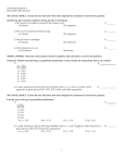 STATISTICS/GRACEY PRACTICE TEST/EXAM 2 MULTIPLE CHOICE. Choose the one alternative that best completes the statement or answers the question. Identify the given random variable as being discrete or continuous. 1) The number of oil spills occurring off the Alaskan coast A) Discrete B) Continuous 2) The cost of a randomly selected orange A) Discrete 1) 2) B) Continuous 3) The pH level in a shampoo A) Discrete 3) B) Continuous 4) The braking time of a car A) Continuous B) Discrete 4) SHORT ANSWER. Write the word or phrase that best completes each statement or answers the question. Determine whether the following is a probability distribution. If not, identify the requirement that is not satisfied. 5) 5) x P(x) 0 0.079 1 0.173 2 -0.030 3 0.170 4 0.075 5 0.533 6) A police department reports that the probabilities that 0, 1, 2, 3, and 4 car thefts will be reported in a given day are 0.135, 0.271, 0.271, 0.180, and 0.090, respectively. 6) MULTIPLE CHOICE. Choose the one alternative that best completes the statement or answers the question. Find the mean of the given probability distribution. 7) x P(x) 0 0.14 1 0.10 2 0.25 3 0.25 4 0.26 A) μ = 2.29 B) μ = 2.53 7) C) μ = 2.39 D) μ = 2.43 8) A police department reports that the probabilities that 0, 1, 2, and 3 burglaries will be reported in a given day are 0.48, 0.39, 0.12, and 0.01, respectively. A) μ = 0.66 B) μ = 0.25 C) μ = 1.50 D) μ = 1.14 1 8) Provide an appropriate response. Round to the nearest hundredth. 9) Find the standard deviation for the given probability distribution. x P(x) 0 0.12 1 0.17 2 0.09 3 0.28 4 0.34 A) σ = 2.91 B) σ = 1.45 C) σ = 1.99 9) D) σ = 1.41 10) The probabilities that a batch of 4 computers will contain 0, 1, 2, 3, and 4 defective computers are 0.4979, 0.3793, 0.1084, 0.0138, and 0.0007, respectively. Find the standard deviation for the probability distribution. A) σ = 0.54 B) σ = 0.73 C) σ = 0.97 D) σ = 0.68 Answer the question. 11) Focus groups of 14 people are randomly selected to discuss products of the Yummy Company. It is determined that the mean number (per group) who recognize the Yummy brand name is 10.9, and the standard deviation is 0.98. Would it be unusual to randomly select 14 people and find that fewer than 7 recognize the Yummy brand name? A) Yes B) No 10) 11) 12) Assume that there is a 0.05 probability that a sports playoff series will last four games, a 0.45 probability that it will last five games, a 0.45 probability that it will last six games, and a 0.05 probability that it will last seven games. Is it unusual for a team to win a series in 4 games? A) Yes B) No 12) 13) Suppose that a law enforcement group studying traffic violations determines that the accompanying table describes the probability distribution for five randomly selected people, where x is the number that have received a speeding ticket in the last 2 years. Is it unusual to find five speeders among five randomly selected people? x P(x) 0 0.08 1 0.18 2 0.25 3 0.22 4 0.19 5 0.08 A) Yes B) No 13) 2 Assume that a researcher randomly selects 14 newborn babies and counts the number of girls selected, x. The probabilities corresponding to the 14 possible values of x are summarized in the given table. Answer the question using the table. Probabilities of Girls x(girls) P(x) x(girls) P(x) x(girls) P(x) 0 0.000 5 0.122 10 0.061 1 0.001 6 0.183 11 0.022 2 0.006 7 0.209 12 0.006 3 0.022 8 0.183 13 0.001 4 0.061 9 0.122 14 0.000 14) Find the probability of selecting exactly 8 girls. A) 0.000 B) 0.122 C) 0.183 D) 0.022 14) 15) Find the probability of selecting 9 or more girls. A) 0.001 B) 0.061 C) 0.212 D) 0.122 16) Find the probability of selecting 2 or more girls. A) 0.999 B) 0.006 C) 0.001 D) 0.994 15) 16) SHORT ANSWER. Write the word or phrase that best completes each statement or answers the question. Provide an appropriate response. 17) Let the random variable x represent the number of girls in a family of three children. Construct a table describing the probability distribution, then find the mean and standard deviation. 18) Ten apples, four of which are rotten, are in a refrigerator. Three apples are randomly selected without replacement. Let the random variable x represent the number chosen that are rotten. Construct a table describing the probability distribution, then find the mean and standard deviation for the random variable x. 17) 18) MULTIPLE CHOICE. Choose the one alternative that best completes the statement or answers the question. 19) In a game, you have a 1/27 probability of winning $100 and a 26/27 probability of losing $4. What is your expected value? A) -$0.15 B) -$3.85 C) $3.70 D) $7.56 19) 20) Suppose you pay $2.00 to roll a fair die with the understanding that you will get back $4.00 for rolling a 2 or a 4, nothing otherwise. What is your expected value? A) -$0.67 B) $2.00 C) -$2.00 D) $4.00 20) 21) A 28-year-old man pays $200 for a one-year life insurance policy with coverage of $120,000. If the probability that he will live through the year is 0.9994, what is the expected value for the insurance policy? A) -$199.88 B) $119,928.00 C) -$128.00 D) $72.00 21) 3 22) The prizes that can be won in a sweepstakes are listed below together with the chances of winning each one: $3800 (1 chance in 8600); $1700 (1 chance in 5400); $700 (1 chance in 4600); $200 (1 chance in 2600). Find the expected value of the amount won for one entry if the cost of entering is 55 cents. A) $200 B) $0.44 C) $0.47 D) $0.91 Determine whether the given procedure results in a binomial distribution. If not, state the reason why. 23) Rolling a single die 37 times, keeping track of the numbers that are rolled. A) Not binomial: there are too many trials. B) Not binomial: there are more than two outcomes for each trial. C) Procedure results in a binomial distribution. D) Not binomial: the trials are not independent. 22) 23) 24) Rolling a single die 19 times, keeping track of the "fives" rolled. A) Procedure results in a binomial distrib