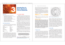 This sample chapter is for review purposes only. Copyright © The Goodheart-Willcox Co., Inc. All rights reserved. 54 3 Introduction to Basic Electrical Circuit Materials transfer of electrical energy occurs at an amazing speed. The speed has been accurately measured, and it approaches the speed of light: 186,000 miles per second! In metric terms, this speed is 300,000 kilometers (or 300,000,000 meters) per second. The unit for measuring conductance is the siemens. This unit was named after the German inventor Ernst von Siemens, who did a great deal of work in the development of telegraphy use. The abbreviation for the siemens is the capital letter S. The unit formula for computing electrical conductance is as follows: Objectives 3.1 CONDUCTORS After studying this chapter, you will be able to: J Identify different conductor types. J Determine the cross-sectional area of a conductor. J List the factors affecting resistance. J Identify various insulation materials. J List three special conductor pathways. J Explain the manufacture of printed circuit boards. J Identify various switching devices. J Identify various lighting devices. J Identify different types of resistors. J Determine the value of color-coded resistors. Conductors are the pathways that allow electrons to flow through an electrical circuit. Conductors can be made in various shapes and sizes. They can be made from a number of different materials. The most common conductor you will encounter is copper wiring. Copper is an excellent conductor and can be formed into many different shapes. Copper comes in round, square, stranded, solid, flat ribbon, and bar shapes. Each shape has its own unique qualities that make it best for use in some specific application. Conductors vary depending on the type of material from which they are made. Copper is an excellent conductor. Silver is an even better conductor. However, silver is too expensive to be used in common circuits. Many high-voltage lines are made from aluminum because of its light weight, and they have a center core made of stranded steel for added strength. Brass is used for electricalmechanical equipment such as switch parts because of its strength and conductive properties. The actual conduction of electricity is done by transferring electrons from one atom to the next atom in the conductor. Assume that a piece of copper wire is neutral. If an electron is forced into one end of the wire, then an electron will also be forced out from the other end, Figure 3-1. The original electron did not flow through the conductor. Yet the energy was transferred by the interaction between the electrons in the conductor. The actual Key Words and Terms The following words and terms will become important pieces of your electricity and electronics vocabulary. Look for them as you read this chapter. actuator ambient temperature branch circuit candela chassis circuit breaker circular mil (cmil) fuse lumen lumens per watt (lpw) mil potentiometer resistor siemens single-pole single-throw superconductor thermistor tolerance All of electricity and electronics is based on the fundamental concept of moving electrons through some type of material and then applying the electrons at a load. At the load, the electrical energy is transformed into another form of energy such as heat, light, or magnetism. In this chapter, we shall explore methods to control the flow of electrons using common devices and materials. In addition, we will explore the conversion of electrical energy for some common uses, such as lighting. Electron enters Fundamentals of Electricity and Electronics G= Electron exits Conductor atoms in a wire Figure 3-1. When an electron enters one end of a conductor, another electron is forced out the other end. This all happens at approximately the speed of light. 53 1 R where G is conductance (in siemens) and R is resistance (in ohms). The conductance of a material is the reciprocal of the resistance of the material. LESSON IN SAFETY: Your body is a good conductor of electricity. Never touch a circuit conductor or component unless you are sure that it is not energized. An electric current flowing in one hand, across your chest and heart, and out your other hand, is dangerous and can be fatal. The smart technician uses only one hand when working on high-voltage circuits. The other hand is kept in a pocket. Technicians who work on high voltage lines work in insulated bucket trucks or on insulated platforms. Standing on a rubber mat while working on electrical systems is a standard safety (and a wise) practice. While the technician is standing on an insulated material, there is no direct path to ground in case of accidental contact with conductors. Conductor Sizes Conductors are sized by their cross-sectional area. The amount of cross-sectional area a conductor has determines how much current it can handle without overheating. Circular conductors are arranged according to size by the American Wire Gauge System. The larger the gauge number, the smaller the cross-sectional area a wire will have. For example, a No. 14 wire is larger in diameter than a No. 20 wire. See Figure 3-2. This system of wire sizes was developed over a hundred years ago. At that time, no one could foresee that the demand for electrical products would make this system obsolete. Some wire sizes are now larger than the No. 1 Figure 3-2. A gauge is used to find wire size. conductor. A temporary solution to this problem created the next set of larger sizes. The next four sizes that were developed are 0 (pronounced “ought”), 00, 000, and 0000–or one through four ought (1/0 through 4/0). When it became apparent that even larger sizes would be needed, the final solution to the sizing problem, a third set of sizes, was developed. The final system of sizing is the circular mil system. The circular mil system is based on the diameter of the conductor measured in mils (1/1000 of an inch). Typical conductors larger than four ought are fr