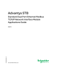 EIO0000000051 6/2010 Advantys STB Standard Dual Port Ethernet Modbus TCP/IP Network Interface Module Applications Guide EIO0000000051.01 6/2010 www.schneider-electric.com The information provided in this documentation contains general descriptions and/or technical characteristics of the performance of the products contained herein. This documentation is not intended as a substitute for and is not to be used for determining suitability or reliability of these products for specific user applications. It is the duty of any such user or integrator to perform the appropriate and complete risk analysis, evaluation and testing of the products with respect to the relevant specific application or use thereof. Neither Schneider Electric nor any of its affiliates or subsidiaries shall be responsible or liable for misuse of the information contained herein. If you have any suggestions for improvements or amendments or have found errors in this publication, please notify us. No part of this document may be reproduced in any form or by any means, electronic or mechanical, including photocopying, without express written permission of Schneider Electric. All pertinent state, regional, and local safety regulations must be observed when installing and using this product. For reasons of safety and to help ensure compliance with documented system data, only the manufacturer should perform repairs to components. When devices are used for applications with technical safety requirements, the relevant instructions must be followed. Failure to use Schneider Electric software or approved software with our hardware products may result in injury, harm, or improper operating results. Failure to observe this information can result in injury or equipment damage. © 2010 Schneider Electric. All rights reserved. 2 EIO0000000051 6/2010 Table of Contents Safety Information . . . . . . . . . . . . . . . . . . . . . . . . . . . . . . About the Book . . . . . . . . . . . . . . . . . . . . . . . . . . . . . . . . . Chapter 1 Introduction. . . . . . . . . . . . . . . . . . . . . . . . . . . . . . . . . . . . What Is a Network Interface Module? . . . . . . . . . . . . . . . . . . . . . . . . . . . . What Is Advantys STB? . . . . . . . . . . . . . . . . . . . . . . . . . . . . . . . . . . . . . . Overview of the STB NIP 2311 Product . . . . . . . . . . . . . . . . . . . . . . . . . . Introduction to Ethernet Connectivity . . . . . . . . . . . . . . . . . . . . . . . . . . . . Chapter 2 Physical Description of the STB NIP 2311 NIM Module External Features of the STB NIP 2311 NIM . . . . . . . . . . . . . . . . . . . . . . STB NIP 2311 Ethernet Interfaces . . . . . . . . . . . . . . . . . . . . . . . . . . . . . . STB NIP 2311 Rotary Switches . . . . . . . . . . . . . . . . . . . . . . . . . . . . . . . . STB NIP 2311 LED Indicators. . . . . . . . . . . . . . . . . . . . . . . . . . . . . . . . . . Advantys STB Island Status LEDs . . . . . . . . . . . . . . . . . . . . . . . . . . . . . . The CFG Interface. . . . . . . . . . . . . . . . . . . . . . . . . . . . . . . . . . . . . . . . . . . The Power Supply Interface . . . . . . . . . . . . . . . . . . . . . . . . . . . . . . . . . . . Logic Power. . . . . . . . . . . . . . . . . . . . . . . . . . . . . . . . . . . . . . . . . . . . . . . . Selecting a Source Power Supply for the Island’s Logic Power Bus. . . . . STB NIP 2311 Module Specifications . . . . . . . . . . . . . . . . . . . . . . . . . . . . Chapter 3 How to Configure the Island . . . . . . . . . . . . . . . . . . . . . . 3.1 Understanding Island Bus Addresses . . . . . . . . . . . . . . . . . . . . . . . . . . . . How Do Modules Automatically Get Island Bus Addresses? . . . . . . . . . . 3.2 Autoconfiguring Island Parameters . . . . . . . . . . . . . . . . . . . . . . . . . . . . . . How to Auto-Configure Default Parameters for Island Modules . . . . . . . . What is the RST Button?. . . . . . . . . . . . . . . . . . . . . . . . . . . . . . . . . . . . . . How to Overwrite Flash Memory with the RST Button . . . . . . . . . . . . . . . 3.3 Using a Removable Memory Card to Configure the Island . . . . . . . . . . . . How to Install the STB XMP 4440 Optional Removable Memory Card. . . Using the STB XMP 4440 Optional Removable Memory Card to Configure the Island . . . . . . . . . . . . . . . . . . . . . . . . . . . . . . . . . . . . . . . . . EIO0000000051 6/2010 7 9 13 14 16 20 22 23 24 25 27 29 31 33 35 36 38 41 43 44 44 47 48 49 50 52 53 56 3 4 3.4 Configuring the STB NIP 2311 NIM with the Advantys Configuration Software. . . . . . . . . . . . . . . . . . . . . . . . . . . . . . . . . . . . . . . . . . . . . . . . . . Setting the Size and Display Format of HMI-to-PLC and PLC-to-HMI Tables . . . . . . . . . . . . . . . . . . . . . . . . . . . . . . . . . . . . . . . . . . . . . . . . . . . Ethernet Parameters - The IP Address Tab. . . . . . . . . . . . . . . . . . . . . . . Ethernet Parameters - Master IP Configuration. . . . . . . . . . . . . . . . . . . . Ethernet Parameters - SNMP Agent Functionality. . . . . . . . . . . . . . . . . . RSTP and Redundancy . . . . . . . . . . . . . . . . . . . . . . . . . . . . . . . . . . . . . . Configuring Module Options . . . . . . . . . . . . . . . . . . . . . . . . . . . . . . . . . . 60 62 64 66 68 70 Chapter 4 How to Obtain IP Parameters for the STB NIP 2311 . . . . 73 How Does the STB NIP 2311 Obtain IP Parameters?. . . . . . . . . . . . . . . The IP Address Assignment Flowchart . . . . . . . . . . . . . . . . . . . . . . . . . . 74 76 Chapter 5 Optimizing Performance . . . . . . . . . . . . . . . . . . . . . . . . . . 79 5.1 Selecting a Switch . . . . . . . . . . . . . . . . . . . . . . . . . . . . . . . . . . . . . . . . . . Role of a Switch in an Ethernet Network . . . . . . . . . . . . . . . . . . . . . . . . . Transmission Speed, Duplex and Auto-Negotiation . . . . . . . . . . . . . . . . Quality of Service (QoS) . . . . . . . . . . . . . . . . . . . . . . . . . . . . . . 