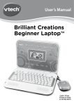 User’s Manual Brilliant Creations Beginner LaptopTM c 2011 VTech Printed in China 91-001622-000 美 Dear Parent, At VTech®, we know that in order to effectively reach kids, today’s learning tools have to be plugged into the fast-paced world around them. That’s why we created the Grade School Learning Series – an engaging set of stylized, interactive computers specially designed to get grade-school kids up to speed with their fast-paced, techsavvy world. Every product in the Grade School Learning Series covers a wide range of school basics – math, language, social studies, science, and even an intro to basic Spanish. Activities are presented in a fast-paced, arcade-game style that kids will recognize and enjoy. Each learning machine is loaded with hi-tech features such as word processors, electronic address books – tools that go hand-in-hand with the way kids learn, play and use information. With the Grade School Learning Series, kids can access a way to learn that closely matches the way they already live and play. We thank you for trusting VTech® with the important job of helping your child learn and succeed. We hope to help your child discover that “It’s Cool to Be Smart!” Sincerely, Your friends at VTech® _______________ To learn more about the Grade School Learning Series™ and other VTech® toys, visit www.vtechkids.com INTRODUCTION Thank you for purchasing the VTech® Brilliant Creations Beginner LaptopTM. The Brilliant Creations Beginner LaptopTM is a high-tech laptop that is filled with amazing activities! It features a bright, LCD color screen and focuses on stimulating and expanding your imagination and creativity. There are 80 activities that cover letters, phonics, syllables, vocabulary, math, science, art, logic and more! Explore and learn together with Perry the Penguin and his friends! Are you ready? Let’s go! Color LCD Screen 5 Category Keys Volume/Contrast Control Paints Key Progress Report Key My Creative Collection QWERTY Keyboard On/Off Key Help Key Scratch Key INTRODUCTION Challenge Level Key Built-in Speaker Answer Key Repeat Key Fun Key Music On/Off Key Nickname Arrow Keys Cursor Mouse & Cursor Enter Key INCLUDED IN THIS PACKAGE • VTech® Brilliant Creations Beginner LaptopTM console and cursor mouse • VTech® Brilliant Creations Beginner LaptopTM instruction manual WARNING: All packing materials such as tape, plastic sheets, wire ties and tags are not part of this toy and should be discarded for your child’s safety ATTENTION: Pour la sécurité de votre enfant, débarrassez-vous de tous les produits d’emballage tels que rubans adhésifs, feuilles de plastique, attaches et étiquettes. Ils ne font pas partie du jouet. 2 NOTE: Please keep the user’s manual as it contains important information. Unlock the packaging locks: 1. Rotate the packaging locks 90 degrees counterclockwise 2. Pull out the packaging lock Demo strip removal: When the product is taken out of the packaging, please remove the demo strip from the unit to activate normal play mode. GETTING STARTED GETTING STARTED POWER SOURCE The VTech® Brilliant Creations Beginner LaptopTM operates on 4 “AA” sized batteries (AM-3/LR6) or a VTech® 7.5V 400mA or 9V 300mA (sold separately). The “AA” sized batteries included in the unit are for demo purposes only and are not long-life batteries. If you are using a power supply adaptor, please remember to empty the battery slot first. Before playing, please make sure the plastic strip is removed from the bottom of the unit. BATTERY INSTALLATION NOTE: For best performance, remove all factory-installed batteries and use new, alkaline batteries. 1. Make sure the unit is turned OFF. 2. Locate the battery cover on the bottom of the unit and open it. 3. Insert 4 “AA” sized batteries as illustrated. 4. Close the battery cover. BATTERY NOTICE • The use of new alkaline batteries is recommended for maximum performance. • Non-rechargeable batteries are not to be recharged. • Rechargeable batteries are to be removed from the toy before being charged (if removable). • Rechargeable batteries are only to be charged under adult supervision (if removable). • Do not mix old and new batteries. • Do not mix batteries of different types: alkaline, standard (carbon-zinc) or rechargeable (nickel-cadmium). 3 • • • • • Only batteries of the same or equivalent type as recommended are to be used. Batteries are to be inserted with the correct polarity. Exhausted batteries are to be removed from the toy. The supply terminals are not to be short-circuited. The toy is not to be connected to more than the recommended number of power supplies. • Do not dispose of batteries in fire. WE DO NOT RECOMMEND THE USE OF RECHARGEABLE BATTERIES. AC/DC ADAPTOR Use a VTech® adaptor or any other standard adaptor that complies with EN61558 DC 400mA or 9V 300mA center-positive adaptor. CONNECTING THE ADAPTOR 1. Make sure the unit is OFF. 2. Locate the adaptor jack on the left side of the unit. 3. Insert the adaptor plug into the unit’s adaptor jack. 4. Plug the adaptor into a wall outlet. 5. Turn the unit ON. NOTE: When the toy is not going to be in use for an extended period of time, unplug the adaptor. ADAPTOR NOTICE • The toy is not intended for use by children under 3 years old. • Only use the recommended adaptor with the toy. • The adaptor is not a toy. • Never clean a plugged-in toy with liquid. • Never use more than 1 adaptor. • Do not leave toy or adaptor plugged in for extended periods of time. BATTERY INSTALLATION 7.5V NOTICE TO PARENTS Regularly examine the adaptor, checking for damage to the cord, plug, transformer or other parts. Do not use the adaptor if there is any damage to it. USING THE MOUSE Press the cursor key to select an activity from the activity menu or to answer questions in individual activities. Press the Cursor Enter key to confirm. 4 PRODUCT FEATURES NICKNAME FEATURE You can enter your name when you firs