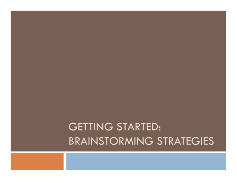 GETTING STARTED: BRAINSTORMING STRATEGIES Purposes of Brainstorming Get ideas on the page Explore topics Find a topic that interests you Think through a topic Make a subject matter relevant to you Get the bad ideas out Common Brainstorming Strategies Freewriting Columns Clustering Questioning (who, what, when, where, why and how) Listing Invisible writing idea idea (computer screen off) topic idea idea idea Types of Writing Assignments BROAD You pick a subject that fits the assignment guidelines Purpose is usually predetermined Audience is usually unfamiliar with the topic PARTICULAR You pick a specific topic within the assigned subject Purpose is usually to inform or persuade Audience has background knowledge on subject BRAINSTORMING FOR BROAD TOPICS STRATEGY Observation EX: Write a compare/ contrast essay. TRY IT: Think of a classroom you have this semester and describe it. Then, describe this classroom. How are the classrooms similar? How are they different? BRAINSTORMING FOR BROAD TOPICS 1. Determine categories 2. Chart your findings to organize your information Location Your Classroom This Classroom Appearance Technology BRAINSTORMING FOR BROAD TOPICS STRATEGY Ask questions EX: Write an argumentative research paper. Topic must have two sides Must be able to find evidence for both sides _____Pro Con___ BRAINSTORMING FOR BROAD TOPICS TRY IT: What topics do you want to know more about? Where can you find information on these topics? Topics that interest me Who? What? When? Where? Why? How? BRAINSTORMING FOR BROAD TOPICS STRATEGY Go to an event (concert, museum, play, presentation) TRY IT: Describe this workshop or a performance you’ve seen recently. Sights EX: Write a descriptive narrative essay. Sounds Use Taste senses to create an image for your reader. Smells Feel BRAINSTORMING FOR PARTICULAR TOPICS STRATEGY Read biographies about people who have made a difference – EX: Explore a branch of the US Government. Why is it important to the governance of our Country? Check-out and read the biographies Thurgood Marshall: American Revolutionary or A Justice For All: William A. Brennan, Jr. and the Decisions That Transformed America. Justice William A. Brennan BRAINSTORMING FOR PARTICULAR TOPICS TRY IT: By the time he retired in July 1990, Brennan had ruled in 1,360 opinions, surpassing all but one justice in the court’s history. His vital cases included New York Times v. Sullivan, which established the actual malice standard of which press reports could be considered to be defamation and libel (allowing free reporting of civil rights campaigns in the southern U.S.), and Furman v. Georgia, which ruled application of the death penalty required consistency (resulting in the suspension of the death penalty from 1973 to 1976). Emphasis would be: _________________________________ _________________________________ _________________________________ _________________________________ _________________________________ BRAINSTORMING FOR PARTICULAR TOPICS Strategy Read a poem about your subject EX: Write a paper describing life in a Southern mill village. Check out Eureka Mill. Author Ron Rash BRAINSTORMING FOR PARTICULAR TOPICS Try it: Mill houses lined both sides of every road like boxcars on a track. They were so close a man could spit off of his own front porch, hit four houses if he had the wind. Sometimes at night if I was feeling low, I’d stuff my ears with cotton. Then I’d stare up at that picture like it was a window, and I was back home listening to the farm. But what was done was done. Before too long the weave room jarred the hearing from my ears, and I got used to living with a crowd. Before too long I took the picture of the barn down. Would wish to discover information about: _________________________________ _________________________________ _________________________________ _________________________________ _________________________________ BRAINSTORMING FOR PARTICULAR TOPICS Strategy Read a general interest article EX: Describe a management theory conceptualized in the last ten years. – Find “Human Potential Untangled” BRAINSTORMING FOR PARTICULAR TOPICS Try It: Neither too lockstep nor too loose, such an approach might be called the “value model” of development because its goal is to get the best value each person has to offer. It combines methodical key steps people can follow to advance in their careers, with learning organization concepts that respect individual differences. One of the first steps in developing each person’s full potential is knowing why people don’t perform and what to do about it. How might the theory be described: _________________________________ _________________________________ _________________________________ _________________________________ _________________________________ _________________________________ BRAINSTORMING FOR PARTICULAR TOPICS Strategy Watch a documentary Ex: Choose an international food which immigrated to a specific region within the US and detail the history and composition of the dish. - Find International Food Festival 2008 BRAINSTORMING FOR PARTICULAR TOPICS Try It: http://www.youtube.com/ watch?v=JkwclqDa7s4 What food and/or region piqued your interest? What did you initially learn? _____________________ _____________________ _____________________ _____________________ _____________________ _____________________ BRAINSTORMING FOR PARTICULAR TOPICS Strategy Find a famous quote EX: Write an opinion paper regarding the proposed governmental health care act. BRAINSTORMING FOR PARTICULAR TOPICS Try It “There have been some medical schools in which somewhere along the assembly line, a faculty member has informed the students, not so much by what he said but by what he did, that there is an intimate relation between curing and caring.” Ashley Montagu Possible opinions: _____________________________ __________________________ __________________________ __________________________ __________________________ BRAINST