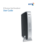 BT Business Total Broadband User Guide Learn about… Contents To install your BT Business Hub, follow your handy Quick Start guide. This User Guide contains more detailed set-up and service information, including troubleshooting. 4 Set-up 6 Your BT Business Hub and BT Business Total Broadband service. Setting up your broadband service and BT Business Hub. 17 Help 29 Index 59 Setting up extra features once you’re online – security, email, networking, domain names, content screening, internet access control, email, Static IP, BT Openzone, BT Business Broadband Voice (VoIP). How to get help, if you need it. Help We can set it all up for you For a small charge, a BT Business IT Support engineer can visit and set up your broadband, email and security – and give you a brief introduction to the service. Making sure you get the most out of your broadband whilst freeing up time so you can focus on running your business. Call us on 0800 400 400*. Extra features Extra features Set-up Learn about… * Calls to 0800 numbers are free from UK landlines. Mobile costs may vary. See www.bt.com/pricing for details. All calls made to BT or from BT may be recorded to help us give you a better service. 1 Learn about… Set-up Extra features Help Learn about… Welcome to BT Business Total Broadband Your fast broadband is nearly here Use this guide to find out all about your BT Business Total Broadband service and your new Business Hub, including more detailed set-up and how to get support and advice, should you have any problems. Set-up What to do next Please wait until your activation day (date advised in your ‘welcome’ letter or email). Your service may not be activated until 8pm on your activation day. Please do not try to set up your service before it is activated. As you move through the set-up, we’ll explain how the Hub shows if your service is active, or whether you need to wait a little longer. What else you need to know Your broadband service will give you the fastest speed your phone line can support. Line speeds may vary depending on a number of factors, such as line quality, distance from the exchange or usage on the network. Extra features Your line needs time to establish its best broadband speed. To make sure you receive the fastest, most reliable service possible on your line, we’ll remotely test it for up to ten days after your broadband is activated. This may occasionally interrupt your service and cause your speed to vary. This is normal, and your speed will settle down after ten days. Please note: if you use an online speed checker to test your broadband speed during these ten days, it may give you an inaccurate and misleading result. If you have any problems, see Help on page 29. Help We hope your new service boosts your business. Best wishes, BT Business Total Broadband team 3 Learn about… Learn about… Your complete broadband package includes lots of great features to help you get the most out of the internet. Use this section to learn about your service Page Set-up BT Business Total Broadband features and services 4 BT Business Hub 5 Broadband speed 5 BT Business Total Broadband features and services BT Business Total Broadband includes lots of great features and services, including email, security, web space and more. Extra features Once your BT Business Hub is set up and you’re online, find out about all the great things BT Business Total Broadband has to offer at www.bt.com/business/help Desktop Help Desktop Help is a tool that identifies problems with your broadband, email or Wi-Fi connection, suggests quick fixes or fixes problems remotely. It’s installed automatically when the CD included in your Welcome Pack is used to set up your BT Business Total Broadband service. Once Desktop Help is installed, you’ll see the icon on your desktop. Help To help you make the most of Desktop Help, we recommend that you install it on each computer connected to your BT Business Total Broadband service. To find out more about Desktop Help or to download it if it’s not already installed, go to www.bt.com/business/help/desktopdownload 4 Learn about… Learn about… BT Business Hub Your BT Business Hub is a broadband router that can connect computers to the internet using wired or wireless connections. Your Hub can share the broadband service across separate computers and devices (e.g. printers) and BT services such as BT Business Broadband Voice and BT Office Anywhere. Broadband speed Set-up Your broadband service will give you the fastest speed your phone line can support. Line speeds may vary depending on a number of factors, such as line quality, distance from your exchange or usage on the network. For accurate information about your broadband speed, see our speed checker at http://speedtester.bt.com Note: to make sure you receive the fastest, most reliable service possible on your line, we’ll remotely test it for up to ten days after your broadband is activated. This may occasionally interrupt your service and cause your speed to vary. This is normal, and your speed will settle down after ten days. If you use an online speed checker to test your broadband speed during these ten days, it may give you an inaccurate and misleading result. Extra features > More information on BT Business Total Broadband – go to www.bt.com/business > Set-up – see page 6 > Extra features – see page 17 > Help – see page 29 Help Learn about… 5 Learn about… Set-up Getting set up with BT Business Total Broadband is easy. Simply follow the separate Quick Start guide or use this section for more detailed set-up information. Set-up Use this section to get set up and online Page 1 When to start 6 2 Check contents 7 3 Unplug existing modem, router or Hub 8 4 Fit ADSL filters 9 Extra features 5 Plug in Hub 10 6 Check Hub lights 11 7 Connect computer 11 8 Connect extra computers 16 1 When to start Important: you can only set up your broadband on or after your activation date. If it isn’