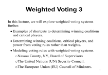 In this lecture, we will explore weighted voting systems