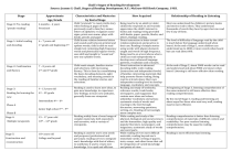 Chall’s Stages of Reading Development Source: Jeanne S. Chall, Stages of Reading Development. N.Y.: McGraw-­Hill Book Company, 1983. Stage Approximate Age/Grade Stage 0: Pre-­‐reading 6 months – 6 years “pseudo reading” Preschool Stage 1: Initial reading 6 – 7 years old and decoding 1st grade and beginning 2nd Stage 2: Confirmation 7 – 8 years old and fluency 2nd and 3rd grade Stage 3: 9 -­‐ 13 years old Reading for learning the 4th – 8th grade new Intermediate 4th – 6th Phase A Junior high school 7th – 9th Characteristics and Masteries 15 – 17 years old Multiple viewpoints 10th – 12th grade Stage 5: 18+ years old Construction and College and beyond reconstruction Relationship of Reading to Listening Being read to by an adult (or older child) who responds to and warmly appreciates the child’s interest in books and reading; being provided with books, paper, pencils, blocks, and letters. Dialogic reading. Direct instruction in letter-­‐sound relations (phonics) and practice in their use. Reading of simple stories using words with phonic elements taught and words of high frequency. Being read to on a level above what a child can read independently to develop more advanced language patterns, vocabulary and concepts. Direct instruction in advanced decoding skills; wide reading (instruction and independent levels) of familiar, interesting materials that help promote fluent reading. Being read to at levels above their own independent reading level to develop language, vocabulary and concepts. Reading and study of textbooks, reference works, trade books, newspapers, and magazines that contain new ideas and values, unfamiliar vocabulary and syntax; systematic study of words and reacting to the text through discussion, answering questions, writing, etc. Reading of increasingly more complex text. Wide reading and study of the physical, biological and social sciences and the humanities, high quality and popular literature, newspapers, and magazines; systematic study of words and word parts. Wide reading of ever more difficult materials, reading beyond one’s immediate needs; writing of papers, tests, essays, and other forms that call for integration of varied knowledge and points of view. Most can understand the children’s picture books and stories read to them. They understand thousands of words they hear by age 6 but can read few if any of them. by End of Stage Child “pretends” to read, retells story when looking at pages of book previously read to him/her, names letters of alphabet; recognizes some signs; prints own name; plays with books, pencils and paper. Child learns relation between letters and sounds and between printed and spoken words; child is able to read simple text containing high frequency words and phonically regular words; uses skill and insight to “sound out” new one syllable words. Child reads simple, familiar stories and selections with increasing fluency. This is done by consolidating the basic decoding elements, sight vocabulary, and meaning context in the reading of familiar stories and selections. Reading is used to learn new ideas, to gain new knowledge, to experience new feelings, to learn new attitudes, generally from one viewpoint. Phase B ge 4: Stage 4: How Acquired Reading widely from a broad range of complex materials, both expository and narrative, with a variety of viewpoints. Reading is used for one’s own needs and purposes (professional and personal); reading serves to integrate one’s knowledge with that of others, to synthesize it and to create new knowledge. It is rapid and efficient. The level of difficulty of language read by the child is much below the language understood when heard. At the end of Stage 1, most children can understand up to 4000 or more words when heard but can read about 600. At the end of Stage 2, about 3000 words can be read and understood and about 9000 are known when heard. Listening is still more effective than reading. At beginning of Stage 3, listening comprehension of the same material is still more effective than reading comprehension. By the end of Stage 3, reading and listening are about equal for those who read very well, reading may be more efficient. Reading comprehension is better than listening comprehension of materials of difficult content and readability. For poor readers listening comprehension may be equal to reading comprehension. Reading is more efficient than listening.