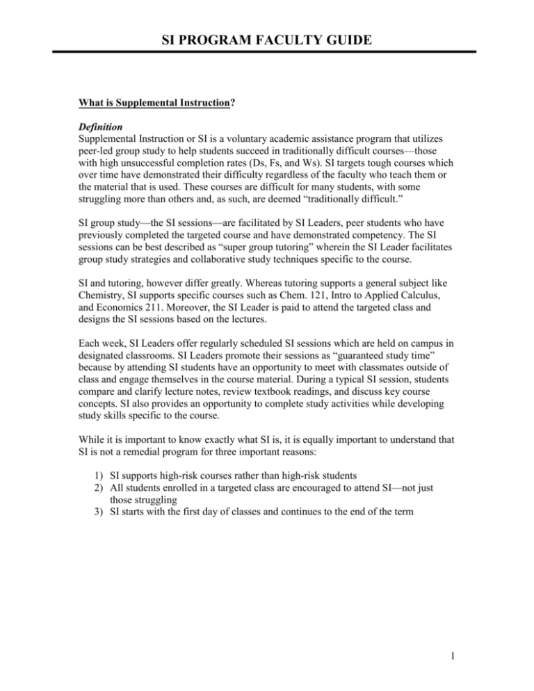 SI PROGRAM FACULTY GUIDE What is Supplemental Instruction? Definition Supplemental Instruction or SI is a voluntary academic assistance program that utilizes peer-led group study to help students succeed in traditionally difficult courses—those with high unsuccessful completion rates (Ds, Fs, and Ws). SI targets tough courses which over time have demonstrated their difficulty regardless of the faculty who teach them or the material that is used. These courses are difficult for many students, with some struggling more than others and, as such, are deemed “traditionally difficult.” SI group study—the SI sessions—are facilitated by SI Leaders, peer students who have previously completed the targeted course and have demonstrated competency. The SI sessions can be best described as “super group tutoring” wherein the SI Leader facilitates group study strategies and collaborative study techniques specific to the course. SI and tutoring, however differ greatly. Whereas tutoring supports a general subject like Chemistry, SI supports specific courses such as Chem. 121, Intro to Applied Calculus, and Economics 211. Moreover, the SI Leader is paid to attend the targeted class and designs the SI sessions based on the lectures. Each week, SI Leaders offer regularly scheduled SI sessions which are held on campus in designated classrooms. SI Leaders promote their sessions as “guaranteed study time” because by attending SI students have an opportunity to meet with classmates outside of class and engage themselves in the course material. During a typical SI session, students compare and clarify lecture notes, review textbook readings, and discuss key course concepts. SI also provides an opportunity to complete study activities while developing study skills specific to the course. While it is important to know exactly what SI is, it is equally important to understand that SI is not a remedial program for three important reasons: 1) SI supports high-risk courses rather than high-risk students 2) All students enrolled in a targeted class are encouraged to attend SI—not just those struggling 3) SI starts with the first day of classes and continues to the end of the term 1 SI PROGRAM FACULTY GUIDE Purpose SI has a threefold purpose to: 1) Reduce rates of attrition within targeted historically difficult courses 2) Improve student grades in targeted historically difficult courses 3) Increase the graduation rates of students Goal and Objectives The goal of SI is to help students become independent learners; objectives of such are to: Increase the As, Bs, and Cs within targeted historically difficult classes Reduce the Ds, Fs, and Ws within targeted historically difficult classes Ultimately improve the graduation rates at SU With regular attendance, SI aims to help students improve their class standing by one-half to one full letter grade. To accomplish this, SI helps students to: Understand and plan for the demand of college-level courses Gain problem-solving experience through trial and error Become more actively involved in the course Develop more effective study skills Understand what to learn and how to learn Develop transferable study skills SI History Supplemental Instruction is the brainchild of Dr. Deanna Martin from the University of Missouri Kansas City (UMKC). In 1973 Dr. Martin developed the SI Model in response to her university’s concern regarding the high failure rate among minorities in medical school. Initial SI evaluation results were so impressive, the program quickly spread to UMKC’s health and professional schools and soon after that throughout the entire university. Other schools started their own SI programs and by 1981 the U.S. Department of Education named Supplemental Instruction an Exemplary Education Program. Very few post-secondary programs hold such a distinction. Today, over 1800 institutions in the United States and 27 countries have implemented SI on their campuses. 2 SI PROGRAM FACULTY GUIDE The SI Model and Basic Design The SI Model involves the following key personnel: 1) SI Administration—trained professionals responsible for identifying targeted courses, gaining faculty support, selecting and training SI Leaders, and evaluating not only the SI Leaders but the overall program as well. 2) Faculty—instructors from identified targeted courses invite and approve of SI support for their classes. SI faculty screen SI Leaders for course competency and approve candidate selections. Faculty members also reinforce SI Program support, advocating this academic assistance to all students. 3) SI Leaders—students deemed course competent, approved by the instructor, and trained in proactive learning and study skills strategies. A key component of the SI Model is utilization of peer students (as opposed to TAs or GAs) for this position; doing so negates possible inference linking SI with final course grading 4) Students—the voluntary and anonymous participants in the SI sessions and— although mentioned last—the most crucial component of SI. Role of the SI Leader SI Leaders serve as peer facilitators for SI session group study. This role requires SI Leaders to attend the targeted course (similar to auditing) to ensure constant and consistent knowledge of the lecture and classroom expectations. The SI Leader’s role in the classroom is to model effective classroom behavior and then transfer that knowledge to the SI session. To form the basis of their SI sessions, SI Leaders combine specific study skills with key course content, integrating what to learn with how to learn. 5 SI PROGRAM FACULTY GUIDE The SI Leader is not in the classroom to answer questions or serve any official capacity such as proctoring tests; however, he/she does have the following responsibilities: 1. Attend all lectures 2. Be a visible presence to the students in the class 3. Act as a model student during lectures—listen and take notes 4. Read assigned texts and supplementary materials 