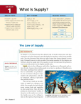 SECTION 1 What Is Supply? OBJECTIVES KEY TERMS TA K I N G N O T E S In Section 1, you will supply, p. 130 • define supply and outline what the law of supply says law of supply, p. 131 • explain how to create and interpret supply schedules market supply schedule, p. 132 • explain how to create and interpret supply curves As you read Section 1, complete a cluster diagram like the one shown using the key concepts and other helpful words and phrases. Use the Graphic Organizer at Interactive Review @ ClassZone.com market supply curve, p. 134 supply schedule, p. 132 supply curve, p. 134 Supply supply schedule law of supply The Law of Supply KE Y CON CE P T S QUICK REFERENCE Supply is the desire and ability to produce and sell a product. 130 Chapter 5 In Chapter 4, you learned about the demand side of market interactions and how consumers serve their interests by purchasing the best products at the lowest possible price. You also discovered that there are other factors that change demand at every price. Demand, however, is only one side of the market equation. In this chapter, you will learn about the supply side of the equation in order to understand why producers want to provide products at the highest possible price. Supply refers to the willingness and ability of producers to offer goods and services for sale. Anyone who provides goods or services is a producer. Manufacturers who make anything from nutrition bars to automobiles are producers. So, too, are farmers who grow crops, retailers who sell products, and utility companies, airlines, or pet sitters who provide services. The two key words in the definition of supply are willingness and ability. For example, the Smith family grows various fruits and vegetables on their small farm. They sell their produce at a local farmers’ market. If the prices at the market are too low, the Smiths may not be willing to Supplying a Service Service providers, such as utility companies, are producers too. take on the expense of growing and transporting their produce. Also, if the weather is bad and the Smiths’ crops of fruits and vegetables are ruined, they will not be able to supply anything for the market. In other words, they will not offer produce for sale if they do not have both the willingness and the ability to do so. As is true with demand, price is a major factor that influences supply. The law of supply states that producers are willing to sell more of a good or service at a higher price than they are at a lower price. Producers want to earn a profit, so when the price of a good or service rises they are willing to supply more of it. When the price falls, they want to supply less of it. In other words, price and quantity supplied have a direct relationship. This relationship is illustrated in Figure 5.1. FIGURE 5.1 The law of supply states that when prices decrease, quantity supplied decreases, and when prices increase, quantity supplied increases. LAW OF SUPPLY As prices fall… E XAM P L E QUICK REFERENCE quantity supplied falls. As prices rise… quantity supplied rises. Price and Supply Let’s take a closer look at how price and quantity supplied are related by returning to the Smiths and their produce business. The Smiths travel to the Montclair Farmers’ Market every Wednesday and Saturday to sell a variety of fruits and vegetables— blueberries, peaches, nectarines, sweet corn, peppers, and cucumbers. However, their specialty crop is the tomato. How should the Smiths decide on the quantity of tomatoes to supply to the farmers’ market? The price they can get for their crop is a major consideration. The Smiths know that the standard price for tomatoes is $1 per pound. What quantity of tomatoes will the Smiths offer for sale at that price? They decide that they are willing to offer 24 pounds. What if the price of tomatoes doubled to $2 per pound? The Smiths might decide that the price is so attractive that they are willing to offer 50 pounds of tomatoes for sale on the market. In contrast, if the price fell to 50 cents, the Smiths might decide to supply only 10 pounds. Furthermore, at prices under 50 cents per pound, they may not be willing to supply any tomatoes. Look again at the definition of the law of supply. As you can see, it provides a concise description of how producers behave. AP P LIC AT ION Find an update on farmers’ markets at ClassZone.com Analyzing Effects A. You sell peppers at the Montclair Farmers’ Market. If the price of peppers increased from 40 cents to 60 cents each, how would your quantity supplied of peppers change? How would your quantity supplied change if the price decreased to 25 cents? Supply 131 Supply Schedules KE Y CON CE P T S QUICK REFERENCE A supply schedule lists how much of a good or service an individual producer is willing and able to offer for sale at each price. A market supply schedule lists how much of a good or service all producers in a market are willing and able to offer for sale at each price. A supply schedule is a table that shows how much of a good or service an individual producer is willing and able to offer for sale at each price in a market. In other words, a supply schedule shows the law of supply in table form. A market supply schedule is a table that shows how much of a good or service all producers in a market are willing and able to offer for sale at each price. E X A MP L E Individual Supply Schedule A supply schedule is a two-column table that is similar in format to a demand schedule. The left-hand column of the table lists various prices of a good or service, and the right-hand column shows the quantity supplied at each price. The Smiths’ supply of tomatoes can be expressed in a supply schedule (Figure 5.2). How many pounds of tomatoes are the Smiths willing to sell when the price is $1.25 per pound? What if the price is $0.50 per pound? Or $2.00 per pound? Your answers to these questions show that the Smiths’ quantity supplied of tomatoes depends on th