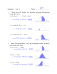 Statistics 1. Test 3 Name: KEY Find the area under the standard normal distribution curve for each. (a) Between z = −0.19 and z = 1.23. . normalCdf (−0.19, 1.23) = 0.4660 (b) To the left of z = −1.56. . normalCdf (−100, −1.56) = 0.0594 (c) To the right of z = −0.38. . normalCdf (−0.38, 100) = 0.6480 2. Find each probability using the standard normal distribution curve for each. (a) P (−0.09 < z < 2.42) . = normalCdf (−0.09, 2.42) = 0.5281 (b) P (z > −1.68) . = normalCdf (−1.68, 100) = 0.9535 (c) P (z < 0.23) . = normalCdf (−100, 0.23) = 0.5910 3. Find the indicated z score. The graph depicts the standard normal distribution with mean 0 and standard deviation 1. (a) . z = invnorm(0.8980) = 1.27 (b) . z = invnorm(1 − 0.2873) = 0.56 4. Find the critical value of z. (a) . z0.12 = invorm(1 − 0.12) = 1.17 (b) . z0.08 = invorm(1 − 0.08) = 1.41 5. Find the critical value of z that represents the 45th percentile. . z = invnorm(0.45) = -0.13 6. The waiting time in line at a Starschmuchs Coffee is normally distributed with a mean of 3.2 minutes and a standard deviation of 1.3 minutes. Find the probability that a randomly selected customer has to wait (a) Less than 1 minute. µ = 3.2 and σ = 1.3. Let X = the continuous random variable (CRV) representing a randomly selected wait time. We convert the distribution of X values over to its distribution of z scores, and find the corresponding area under the standard(ized) normal curve. Normal Distribution of Wait Times X −µ P (X < 1) = P z < σ X 1 − 3.2 =P z< 1.3 . = P (z < −1.69) Standard Normal Distribution = normalCdf (−100, −1.69) z . = 0.0455 Alternatively, we could just find the area under the distribution of wait times, X, with . P (X < 1) = normalCdf (−∞, X, µ, σ) = normalCdf (−1010 , 1, 3.2, 1.3) = 0.0453 (b) more than 2 minutes. X −µ P (X > 2) = P z > σ 2 − 3.2 =P z> 1.3 . = P (z > −0.92) = normalCdf (−0.92, 100) . = 0.8212 Normal Distribution of Wait Times X Standard Normal Distribution z Alternatively, we could just find the area under the distribution of wait times, X, with . P (X > 2) = normalCdf (X, ∞, µ, σ) = normalCdf (2, 1010 , 3.2, 1.3) = 0.8220 (c) between 0.75 minutes and 2 minutes. Normal Distribution of Wait Times P (0.75 < X < 2) 2 − 3.2 0.75 − 3.2 <z< =P 1.3 1.3 . = P (−1.88 < z < −0.92) X Standard Normal Distribution = normalCdf (−1.88, −0.92) z . = 0.1487 7. . P (0.75 < X < 2) = normalCdf (0.75, 2, 3.2, 1.3) = 0.1482 The average yearly precipitation in San Diego is 9.62 inches with a standard deviation of 4.42 inches and precipitation amounts are normally distributed. (a) Find the probability that a randomly selected year will have precipitation greater than 12 inches. µ = 9.62 in. and σ = 4.42 in. Let X = the continuous random variable (CRV) representing a randomly selected yearly precipitation amount. Normal Distribution of Precipitations X −µ P (X > 12) = P z > σ 12 − 9.62 =P z> 4.42 X Standard Normal Distribution . = P (z > 0.54) = normalCdf (0.54, 100) z . = 0.2946 Alternatively, we could just find the area under the distribution of precipitations, X, with . P (X > 12) = normalCdf (X, ∞, µ, σ) = normalCdf (12, 1010 , 9.62, 4.42) = 0.2951 (b) Find the probability that five randomly selected years will have an average precipitation greater than 8 inches. Let X = the continuous random variable (CRV) representing a randomly selected sample mean yearly precipitation amount. X −µ √ P (X > 8) = P z > σ/ n Sampling Distn. of Sample Means 8 − 9.62 √ =P z> 4.42/ 5 X √ . µX = 9.62 and σX = 4.42/ 5 = 1.98 = P (z > −0.82) = normalCdf (−0.82, 100) Standard Normal Distribution z . = 0.7939 Alternatively, we could just find the area under the sampling distribution of sample mean precipitations, X, with √ . P (X > 8) = normalCdf (X, ∞, µX , σX ) = normalCdf (8, 1010 , 9.62, 4.42/ 5) = 0.7938 (7c cont.) Find the precipitation amount from the distribution of precipitations that represents the 75th percentile. precipitation, X . X = invnorm(percentile, µ, σ) = invnorm(0.75, 9.62, 4.42) = 12.6 in Alternatively, we first find the z value from the standard normal distribution that corresponds to the 75th percentile. Second, we solve z = X −µ for X to get σ X =µ+z·σ Afterwards, replace µ with 9.62, z with 0.6744897495 and σ with 4.42 so that . X = 9.62+(0.6744897495)·(4.42) = 12.6 in. z = invnorm(0.75) . = 0.6744897495 8. Some passengers died when a water taxi sank in Baltimore’s inner harbor. Men are typically heavier than women and children, so when loading a water taxi, let’s assume a worst-case scenario in which all passengers are men. Based on data from the National Health and Nutrition Survey, assume that weights of men are normally distributed with a mean of 172 lb. and a standard deviation of 29 lb. (a) Find the probability that if an individual man is randomly selected, his weight will be greater than 175 lb. µ = 172 lb. and σ = 29 lb. Let X = the continuous random variable (CRV) representing the weight of a randomly selected man. Distn. of Men’s Weights, X X −µ P (X > 175) = P z > σ 175 − 172 =P z> 29 . = P (z > 0.10) Standard Normal Distribution z = normalCdf (0.10, 100) . = 0.4602 Alternatively, we could just find the area under the distribution of weights, X, with . P (X > 175) = normalCdf (X, ∞, µ, σ) = normalCdf (175, 1010 , 172, 29) = 0.4588 (b) Find the probability that 20 men will have a mean weight that is greater than 175 lb. (so that their total weight exceeds the safe capacity of 3500 lb. Let X = the continuous random variable (CRV) representing a randomly selected sample mean weight. X −µ √ P (X > 175) = P z > σ/ n 175 − 172 √ =P z> 29/ 20 Sampling Distn. of Sample Means µX = 172 and √ . σX = 29/ 20 = 6.5 . = P (z > 0.46) = normalCdf (0.46, 100) . = 0.3228 Alternatively, we could just find the area under the sampling distribution of sample mean weights, X, with X P (X > 
