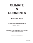 CLIMATE & CURRENTS Lesson Plan A CURRICULUM IN MARINE SCIENCES FOR GRADES 4 - 8 UNIVERSITY OF CALIFORNIA, LOS ANGELES MARINE SCIENCE CENTER revised for UCLA OceanGLOBE, 4/04 Climate and Currents - 1 CLIMATE AND CURRENTS LESSONS Introduction to Climate and Currents...........................................4 A four page written summary of how the Earth’s climate works, and how ocean currents play a major role in shaping climate. Includes a full page illustration of global atmospheric circulation and wind patterns. May be duplicated for student reading material or as a subject content background for teachers. National and LAUSD Standards.....................................................8 A page that lists the National Science Standards that apply to these Climate and Currents activities. Vocabulary....................................................................................9 A single page that lists and defines 23 of the most important terms that relate to student understanding of climate and currents. Activity #1 - Wind Circulation, Surface Currents & Climate.......10 A five page activity that uses three detailed maps of the world (included): global surface currents, global wind patterns and ocean surface life zones, to make the connection between wind, currents and climate. Requires student use of colored pencils and markers. Activity #2 - Major Ocean Surface Currents...............................15 Students glue together the frontside descriptive information and the backside maps for a learning activity that is based upon 16 cards, one for each of 16 major ocean surface currents. Requires scrap cardboard (or card stock) and glue). All maps and information are included in this twelve page activity. Activity #3 - Wind and Currents..................................................27 A two page activity in which students observe how wind generates currents, and what happens to currents as they encouter islands or submerged banks. Requires a shallow pan or plastic container, food coloring, water, and various objects (small rocks or glass bowls). Activity #4 - Water Cycle: Mobius Strip......................................29 Students color printed strips (included) representing the water cycle. The strips are taped together end to end forming a Mobius Strip. This three page activity requires scissors and colored pencils or crayons. Activity#5 - Temperature Changes: Atmosphere & Ocean........32 This two page activity uses two jars, each with a thermometer inside to demonstrate how ocean and atmosphere have different heat capacities (gain and release heat at different rates). Climate and Currents - 2 Activity #6 - Deep Ocean Currents..............................................35 Ice cubes with food coloring, tap water and hot water with food coloring are used in an ordinary glass, with a thermometer, to demonstrate how currents at different depths of the sea are formed. This three page activity includes a student data sheet for observations. Activity #7 - Density Currents.....................................................38 A clear rectangular container of water, with 4 thermometers taped to the bottom, along with ice and food coloring, are used to show the formation and movement patterns of deep ocean currents. A bit more elaborate and detailed than Activity #6 (Deep Ocean Currents). This three page activity includes a student data sheet. Activity #8 - Finding the Deep Water Masses of the Atlantic Ocean.....................................41 A six page activity that explores the temperature, density, salinity and location (depth and geography) of the major water masses of the Atlantic Ocean. All maps, conversion graphs, student data charts, and a foldable 3-D model are included in this package. Climate and Currents - 3 Introduction to Climate and Currents Wind is air moving across the surface of the Earth. Ultimately all winds are generated by unequal heating of the Earth by the sun. Because the sun is millions of miles away from the earth, the rays of light and heat from the sun that reach the surface of the Earth are parallel to one another. But the Earth is round, and only at the equator does energy from the sun fall on a flat surface at a right angle to the sun. At the poles solar radiation fall on surfaces that curve sharply away from the sun. To demonstrate this, shine a flashlight on a flat surface so that the beam of light is perpendicular (at a right angle) to the surface. Draw a circle around the spot of light. Now tilt the flat surface so that it is at a 45o angle to the flashlight. Now the spot of light shining on the surface is oblong, not round, and it is now almost two times larger that the first spot. The spot of light is also dimmer now because the light of the flashlight beam is spread over a larger area than before. This same principle applies to the Earth and sun. The equator will always receive more energy from the sun than will comparable areas north or south of the equator. Also, the surface of the Earth directly beneath the sun at high noon also receives more energy than do areas to the east or west. Thus the Earth’s surface along the equator is always warmer than are the polar regions, and it is always warmer at noon than at dawn and dusk. The result is that the heat budgets of different regions of the Earth are always unequal because the Earth is always tilted at an angle to the sun and because it spins around 24 hours a day, 365 days a year. Nonetheless, averaged over each day/night period, approximately twice as much heat reaches the equator than the poles each year. At the equator, radiation from the sun is particularly intense, and the air above the tropical oceans warms rapidly each day. When this air is heated, it expands and becomes less dense, with the result that moist, hot air rises far above the equator. But expanding air cools and cannot retain moisture. Instead, water vapor condenses to liquid water, clouds form and rains fall in the tr
