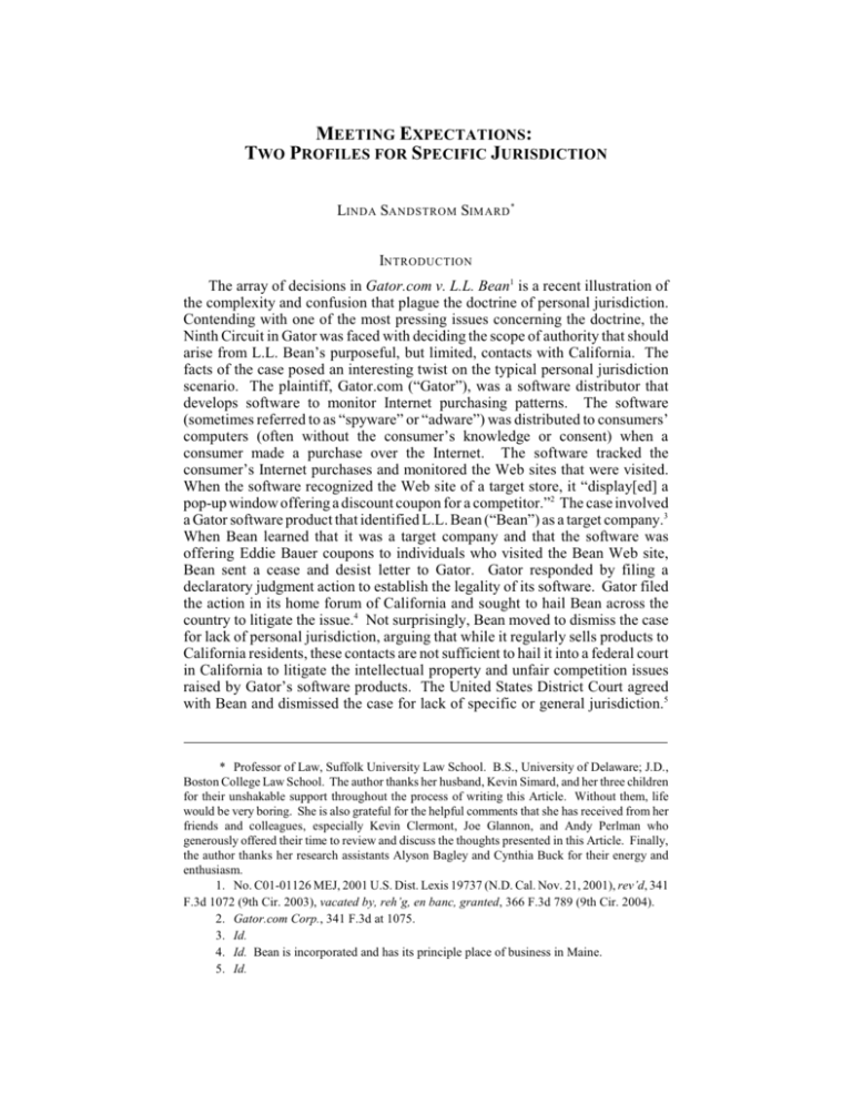 MEETING EXPECTATIONS: TWO PROFILES FOR SPECIFIC JURISDICTION LINDA SANDSTROM SIM ARD * INTRODUCTION The array of decisions in Gator.com v. L.L. Bean1 is a recent illustration of the complexity and confusion that plague the doctrine of personal jurisdiction. Contending with one of the most pressing issues concerning the doctrine, the Ninth Circuit in Gator was faced with deciding the scope of authority that should arise from L.L. Bean’s purposeful, but limited, contacts with California. The facts of the case posed an interesting twist on the typical personal jurisdiction scenario. The plaintiff, Gator.com (“Gator”), was a software distributor that develops software to monitor Internet purchasing patterns. The software (sometimes referred to as “spyware” or “adware”) was distributed to consumers’ computers (often without the consumer’s knowledge or consent) when a consumer made a purchase over the Internet. The software tracked the consumer’s Internet purchases and monitored the Web sites that were visited. When the software recognized the Web site of a target store, it “display[ed] a pop-up window offering a discount coupon for a competitor.”2 The case involved a Gator software product that identified L.L. Bean (“Bean”) as a target company.3 When Bean learned that it was a target company and that the software was offering Eddie Bauer coupons to individuals who visited the Bean Web site, Bean sent a cease and desist letter to Gator. Gator responded by filing a declaratory judgment action to establish the legality of its software. Gator filed the action in its home forum of California and sought to hail Bean across the country to litigate the issue.4 Not surprisingly, Bean moved to dismiss the case for lack of personal jurisdiction, arguing that while it regularly sells products to California residents, these contacts are not sufficient to hail it into a federal court in California to litigate the intellectual property and unfair competition issues raised by Gator’s software products. The United States District Court agreed with Bean and dismissed the case for lack of specific or general jurisdiction.5 * Professor of Law, Suffolk University Law School. B.S., University of Delaware; J.D., Boston College Law School. The author thanks her husband, Kevin Simard, and her three children for their unshakable support throughout the process of writing this Article. Without them, life would be very boring. She is also grateful for the helpful comments that she has received from her friends and colleagues, especially Kevin Clermont, Joe Glannon, and Andy Perlman who generously offered their time to review and discuss the thoughts presented in this Article. Finally, the author thanks her research assistants Alyson Bagley and Cynthia Buck for their energy and enthusiasm. 1. No. C01-01126 MEJ, 2001 U.S. Dist. Lexis 19737 (N.D. Cal. Nov. 21, 2001), rev’d, 341 F.3d 1072 (9th Cir. 2003), vacated by, reh’g, en banc, granted, 366 F.3d 789 (9th Cir. 2004). 2. Gator.com Corp., 341 F.3d at 1075. 3. Id. 4. Id. Bean is incorporated and has its principle place of business in Maine. 5. Id. 344 INDIANA LAW REVIEW [Vol. 38:343 The Ninth Circuit reversed the district court decision, holding that Bean was subject to general jurisdiction in California, largely on the basis of a finding that it maintained a “virtual store” in California through its interactive Web site.6 Several months later, however, the Ninth Circuit vacated its decision and ordered a rehearing enbanc.7 After the parties briefed the issue and the en banc court heard oral argument, the parties reached a settlement agreement and the court dismissed the appeal as moot, leaving the parties and legal community without an answer to this pressing issue.8 While the Bean case represents one of the most recent examples of the inconsistency found in personal jurisdiction cases, it is not the only such example.9 These cases, and many others, illustrate that the doctrine of personal jurisdiction is largely in a state of disarray. Notwithstanding the murkiness of the minimum contacts doctrine,10 the Supreme Court has signaled no major changes in the basic structure of personal jurisdiction doctrine.11 As noted by Professor Moore, “[t]he dictates of minimum contacts are so deeply imbedded in the jurisprudence of personal jurisdiction as to make their abandonment 6. Id. at 1079. Other factors included non-Internet sales to California residents, soliciting business in California and serving the market in California. Id. at 1078. 7. Gator.com Corp. v. L.L. Bean, Inc., 366 F.3d 789 (9th Cir. 2004). 8. Gator.com Corp. v. L.L. Bean, Inc., 398 F.3d 1125 (9th Cir. 2005) (en banc). 9. See Lakin v. Prudential Secs., Inc., 348 F.3d 704, 706, 708 n.7 (8th Cir. 2003) (holding that general jurisdiction may be present where the defendant maintains 1% of its loan portfolio with citizens of the forum state); Nichols v. G.D. Searle & Co., 991 F.2d 1195, 1200 (4th Cir. 1993) (rejecting general jurisdiction where 2% of total sales were in forum; rejecting specific jurisdiction because product liability suit did not “arise out of the defendant’s activities in the forum”); Dalton v. R & W Marine, Inc., 897 F.2d 1359, 1362 (5th Cir. 1990) (rejecting general jurisdiction where 13% of total revenues occurred in the forum; specific jurisdiction not argued); Mich. Nat’l Bank v. Quality Dinette, Inc., 888 F.2d 462, 465-66 (6th Cir. 1989) (holding defendant subject to general jurisdiction in Michigan where 3% of its total sales were in Michigan); Provident Nat’l Bank v. Cal. Fed. Sav. & Loan Assoc., 819 F.2d 434, 437-38 (3d Cir. 1987) (holding that loans to Pennsylvania citizens which amounted to .083 of its total loan portfolio, plus other contacts, was sufficient to give rise to general jurisdiction in Pennsylvania; specific jurisdiction not argued); Stairmaster Sports/Med. Prods., Inc. v. Pac. Fitness Corp., 916 F. Supp. 1049, 1052-53 (W.D. Was