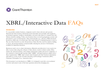 NEXT XBRL/Interactive Data FAQs Introduction To successfully conduct business, companies need to share relevant and accurate financial and other business information both internally and externally with regulators, government agencies, creditors, shareholders, investors and others in a manner that will enhance decision making. Today, most business data is stored in proprietary systems and presented to users in fixed reports, either electronically (e.g., a Word or PDF document posted on a Web site) or in hard copy. This static format is of limited benefit to users as they are often forced to re-enter the portions of data that they need for analysis, leading to errors, decreasing timeliness and potentially reducing the amount of information available for important decisions. Businesses need a way to share information efficiently and effectively. Users need to be able to access data using the software of their choice, search it without undue effort, analyze the selected portions, and compare information within and across companies. A new method to electronically tag data called “XBRL” will help businesses address all of these requirements. XBRL takes current static financial and other business information and makes it, in the words of former Securities and Exchange Commission (SEC) Chairman Christopher Cox, “interactive data.” This document is an introduction to XBRL. It is designed to provide a non-technical overview and answer some of the basic questions about this emerging area. PREVIOUS Frequently Asked Questions Introduction 1 Frequently Asked Questions 2 1. What is XBRL? 3 2. What are the benefits of XBRL? 3 3. Who is developing XBRL? 5 4. What do I need to know about XBRL implementation? 5 5. Does XBRL have any other features that will enhance the communication of financial information? 7 6. What is the SEC doing with regard to XBRL? 7 7. What is Grant Thornton LLP doing with regard to XBRL? 8 8. Is XBRL of interest to or important for public companies only? 8 9. What business processes can be improved through the use of XBRL? 8 10. Will XBRL change or alter accounting standards? 9 11. Will the use of XBRL change the financial reporting process and the role of data intermediaries? 9 12. Can a company decide to add XBRL tags any way it wishes? 13. My company is unique and has some unusual reporting needs. How can these be communicated through XBRL? 10 14. Where in the process should the financial information be tagged? 10 15. Is XBRL used by any regulatory bodies in the United States? 11 16. Is XBRL accepted internationally? 11 17. Is anyone already using XBRL successfully? 12 18. What should companies do now that XBRL is mandatory? 12 19. What will it cost for a company to implement XBRL? 12 20. Will users of XBRL-tagged information need to learn new technologies? 13 21. What can Grant Thornton LLP do to help with the XBRL process? 13 22. How can I find out more about XBRL? 14 9 FAQ List NEXT 2 PREVIOUS 1. FAQ List NEXT 3 What is XBRL? XBRL stands for eXtensible Business Reporting Language. XBRL is an international, market-driven reporting format that “tags” data so the computer will be able to identify, read and use it in other programs and analyses. XBRL tags convert static financial information into interactive data. It might help to think of the tag as being similar to a barcode on an item in a store. The barcode contains product information (i.e., brand, price, size, etc.) that can be read by the computer in the same way that the computer reads the tag and finds information about the financial statement item (e.g., it is monetary, it is a current asset, it is in U.S. dollars, it has a debit balance, etc.). XBRL can be used to tag data in financial statements (numbers, narrative text, dates and other facts). XBRL can also be used to tag data when it is entered into the general ledger of the company, in other words, at the point of transaction. XBRL takes the existing Internet language, XML, and adapts it specifically for financial information. XBRL has the potential to do for business reporting what XML has done for Web pages on the Internet. Because XML is used in the development of Web pages and the tagging of information on those pages, you can access a Web page with different browsers (e.g., Firefox, Safari, Explorer) and different computers (e.g, Lenovo, Dell, Apple, H-P). In the same way, you will be able to access financial information using Web and Web-based technologies using XBRL. 2. What are the benefits of XBRL? XBRL makes financial data interactive, reusable and timely. All companies provide financial information to various constituent groups. Currently, they generate this information and present it to users in a static document, either computerized or hard copy. Anyone wanting to analyze, compare or aggregate the financial information, either within or between companies, is forced to re-enter the data into a spreadsheet or other program, or to run specialized parsing programs that need to be rewritten whenever document formats or content formats change. These specialized programs are expensive to write, and are typically only used by large data aggregators and banks. Analyzing company financial information without XBRL tags is costly, resource intensive, error prone and slow. Once data is tagged with XBRL, financial information can be easily accessed with existing software, read, stored and analyzed without the need for re-entering data. The user can access it as needed, using a variety of software applications, including spreadsheets and database packages. The table presented below identifies the steps involved in the current system versus those with XBRL tags, which highlights where the efficiencies occur. Steps in Analyzing Published Financial Information Current System Using XBRL Report published on Web using HTML, as a PDF or as a text file Report published with XBRL tags Manual extraction of data either by re-entering or cutting and pasting. Often r