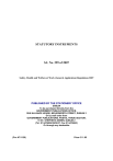 STATUTORY INSTRUMENTS S.I. No. 299 of 2007 Safety, Health and Welfare at Work (General Application) Regulations 2007 PUBLISHED BY THE STATIONERY OFFICE DUBLIN To be purchased directly from the GOVERNMENT PUBLICATIONS OFFICE, SUN ALLIANCE HOUSE, MOLESWORTH STREET, DUBLIN 2 Or by mail order from GOVERNMENT PUBLICATIONS, POSTAL TRADE SECTION, 51 ST. STEPHEN’S GREEN, DUBLIN 2 (Tel: 01 6476834/35/36/37; Fax 01 6476843) Or through any bookseller (Prn A7/1129) Price € 11.95 STATUTORY INSTRUMENTS S.I. No. 299 of 2007 Safety, Health and Welfare at Work (General Application) Regulations 2007 Arrangement of Regulations PART 1 INTERPRETATION AND GENERAL 1 Citation and commencement. 2 Interpretation. 3 Revocations and savings. PART 2 WORKPLACE AND WORK EQUIPMENT Chapter 1 — Workplace 4 Interpretation for Chapter 1. 5 Stability and solidity. 6 Ventilation of enclosed places of work. 7 Room temperature. 8 Natural and artificial lighting. 9 Floors, walls, ceilings and roofs of rooms. 10 Windows and skylights. 11 Doors and gates. 12 Emergency routes and exits. 13 Fire detection and fire fighting. 14 Movement of pedestrians and vehicles in danger areas. 15 Specific measures for escalators and travelators. 16 Loading bays and ramps. 17 Room dimensions and air space in rooms and freedom of movement at the workstation. 18 General welfare requirements. 19 Rest rooms and rest areas. 20 Sanitary and washing facilities. 21 Changing rooms and lockers. 22 Accommodation areas at a place of work. 23 Outdoor places of work, special provisions. 24 Pregnant, postnatal and breastfeeding employees. 25 Employees with disabilities. 26 Agreements as to a premises used as a place of work. Chapter 2 — Use of Work Equipment 27 Interpretation for Chapter 2. 28 Duties of employer, use of work equipment. 29 Information and instruction. 30 Inspection of work equipment. 31 Maintenance. 32 Control devices. 33 Guards and protection devices. 34 Connection to energy sources. 35 Contact with wheels or tracks of mobile work equipment. 36 Drive systems of mobile work equipment. 2 37 Combustion engines of mobile work equipment. 38 Roll-over of mobile work equipment. 39 Fork-lift trucks. 40 Safety of self-propelled work equipment. 41 Traffic rules for mobile work equipment. 42 Work equipment for lifting loads. 43 Cranes. 44 Support of lifting equipment. 45 Work equipment for lifting goods or persons. 46 Hoists and lifts. 47 Winch-operated hoists and lifts. 48 Conditions regarding lifting of persons. 49 Lifting accessories. 50 Work equipment for lifting non-guided loads. 51 Lifting equipment—signalling and operation. 52 Examination and testing of lifting equipment. 53 Reports by competent persons. 54 Keeping of records and registers of lifting equipment. 55 Safe working loads for excavators, draglines, telehandlers, loaders or combined excavators and loaders when used as cranes. 56 Specific requirements for scotch and guy derrick cranes. 57 Construction, testing, examination and safe working load of lifting accessories. 58 Delivery of loads with lifting accessories attached. 59 Duty of persons who hire lifting equipment to others. 60 Duty of the master of a ship in respect of examination of lifting equipment. 61 Duty of the owner of a fishing vessel in respect of examination of lifting equipment. Chapter 3 — Personal Protective Equipment 62 Provision of personal protective equipment. 63 Assessment of personal protective equipment. 64 Conditions of use and compatibility. 65 Personal use. 66 Maintenance and replacement. 67 Information, training and instruction. Chapter 4 — Manual Handling of Loads 68 Interpretation for Chapter 4. 69 Duties of employer. Chapter 5 — Display Screen Equipment 70 Interpretation for Chapter 5. 71 Non-application of Chapter 5. 72 Duties of employer. 73 Provision of eye tests and corrective appliances. PART 3 ELECTRICITY 74 Interpretation for Part 3. 75 Application of Part 3. 76 Suitability of electrical equipment and installations. 77 Adverse or hazardous environments. 78 Identification and marking. 79 Protection against electric shock in normal conditions. 80 Protection against electric shock in fault conditions. 81 Portable equipment. 82 Connections and cables. 83 Overcurrent protection. 84 Auxiliary generator and battery supply. 85 Switching and isolation for work on equipment made dead. 3 86 Precautions for work on electrical equipment. 87 Working space, access and lighting. 88 Persons to be competent to prevent danger. 89 Testing and inspection. 90 Earth leakage protection for higher voltage. 91 Substation and main switch room. 92 Fencing of outdoor equipment. 93 Overhead lines and underground cables. PART 4 WORK AT HEIGHT 94 Interpretation for Part 4. 95 Organisation, planning and risk assessment. 96 Checking of places of work at height. 97 Weather conditions. 98 Avoidance of risks from work at height. 99 Protection of places of work at height. 100 Selection of work equipment for work at height. 101 Condition of surfaces for supporting structures. 102 Stability of supporting structure. 103 Guard-rails, toe-boards, barriers, etc. 104 Stability of working platforms. 105 Safety on working platforms. 106 Loading of working platform and supporting structures. 107 Scaffolding, additional requirements. 108 Collective safeguards for arresting falls. 109 Personal fall protection systems. 110 Work positioning systems. 111 Rope access or positioning technique. 112 Fall arrest systems. 113 Work restraint systems. 114 Ladders. 115 Fragile surfaces. 116 Falling objects. 117 Danger areas. 118 Interpretation for Regulation 119 119 Inspection of work equipment. PART 5 PHYSICAL AGENTS Chapter 1 — Control of Noise at Work 120 Interpretation. 121 Application. 122 Transitional periods. 123 Exposure limit values and exposure action values. 124 Determination and assessment of risks above a lower exposure action value. 125 Provisions aimed at avoiding or reducing exposure. 126 Application of upper exposure action val