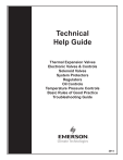 Technical Help Guide Thermal Expansion Valves Electronic Valves & Controls Solenoid Valves System Protectors Regulators Oil Controls Temperature Pressure Controls Basic Rules of Good Practice Troubleshooting Guide 2014 Introduction This Technical Guide from Emerson Climate Technologies provides a detailed explanation on the operation of common refrigeration system components such as thermal expansion valves, solenoid valves, system protectors, regulators, oil controls and temperature pressure controls. Also included in this guide is a listing of the basic rules of good practice and a detailed troubleshooting guide. This guide is designed to fill a need which exists for a concise, elementary text to aid servicemen, salesmen, students and others interested in refrigeration and air conditioning. It is intended to cover only the fundamentals of refrigeration and air conditioning theory and practice. Detailed information for specific products is available from manufacturers of complete units and accessories. Used to supplement such literature, and to improve general knowledge of refrigeration and air conditioning, this guide should prove to be very helpful. Emerson Climate Technologies, a business of Emerson, is the world’s leading provider of heating, ventilation, air conditioning and refrigeration solutions for residential, industrial and commercial applications. The group combines best-inclass technology with proven engineering, design, distribution, educational and monitoring services to provide customized, integrated climate-control solutions for customers worldwide. Emerson Climate Technologies’ innovative solutions, which include industry-leading brands such as Copeland Scroll® and White-Rodgers®, improve human comfort, safeguard food and protect the environment. Emerson Climate Technologies - Flow Controls Division is a leading manufacturer of valves, controls and system protectors commonly applied in air conditioning and refrigeration systems worldwide. The company continues to pioneer the control of refrigerant flow through innovative, high performance components, such as thermal expansion valves and filter driers. Table of Contents Thermal Expansion Valves . . . . . . . . . . . . . . . . . . . . . . . . . . . . . . . . . . . . . . . 1 Internal Equalizer . . . . . . . . . . . . . . . . . . . . . . . . . . . . . . . . . . . . . . . . . . . . 2 Factory Setting of TXVs . . . . . . . . . . . . . . . . . . . . . . . . . . . . . . . . . . . . . . 3 External Equalizer . . . . . . . . . . . . . . . . . . . . . . . . . . . . . . . . . . . . . . . . . . . 3 Superheat . . . . . . . . . . . . . . . . . . . . . . . . . . . . . . . . . . . . . . . . . . . . . . . . . . 5 TXV Selection . . . . . . . . . . . . . . . . . . . . . . . . . . . . . . . . . . . . . . . . . . . . . . . 6 Application Tips . . . . . . . . . . . . . . . . . . . . . . . . . . . . . . . . . . . . . . . . . . . . . 7 Balanced Port TXVs . . . . . . . . . . . . . . . . . . . . . . . . . . . . . . . . . . . . . . . . . . 9 M.O.P. . . . . . . . . . . . . . . . . . . . . . . . . . . . . . . . . . . . . . . . . . . . . . . . . . . . . . 9 Other TXV Considerations . . . . . . . . . . . . . . . . . . . . . . . . . . . . . . . . . . . 11 Emerson TXVs . . . . . . . . . . . . . . . . . . . . . . . . . . . . . . . . . . . . . . . . . . . . . 11 Electronic Valves & Controls . . . . . . . . . . . . . . . . . . . . . . . . . . . . . . . . . . . . . 14 Electronic Valve Introduction . . . . . . . . . . . . . . . . . . . . . . . . . . . . . . . . . 15 Parts Required for Electronic Valves . . . . . . . . . . . . . . . . . . . . . . . . . . . 16 Pressure Transmitter – PT4 . . . . . . . . . . . . . . . . . . . . . . . . . . . . . . . . . . 17 TXV Controller – EC3-X32 . . . . . . . . . . . . . . . . . . . . . . . . . . . . . . . . . . . . 17 TXV Controller – EC3-X33 . . . . . . . . . . . . . . . . . . . . . . . . . . . . . . . . . . . . 18 Universal Driver – EXD-U00 . . . . . . . . . . . . . . . . . . . . . . . . . . . . . . . . . . 18 Electrical Control Valve – EX . . . . . . . . . . . . . . . . . . . . . . . . . . . . . . . . . 19 Component Selection Table . . . . . . . . . . . . . . . . . . . . . . . . . . . . . . . . . . 20 Solenoid Valves . . . . . . . . . . . . . . . . . . . . . . . . . . . . . . . . . . . . . . . . . . . . . . . 21 What are Solenoid Valves? . . . . . . . . . . . . . . . . . . . . . . . . . . . . . . . . . . . 22 Principles of Solenoid Operation . . . . . . . . . . . . . . . . . . . . . . . . . . . . . . 22 Types of Solenoids . . . . . . . . . . . . . . . . . . . . . . . . . . . . . . . . . . . . . . . . . 23 Installation . . . . . . . . . . . . . . . . . . . . . . . . . . . . . . . . . . . . . . . . . . . . . . . . 25 Emerson Solenoid Valves . . . . . . . . . . . . . . . . . . . . . . . . . . . . . . . . . . . . 25 System Protectors . . . . . . . . . . . . . . . . . . . . . . . . . . . . . . . . . . . . . . . . . . . . . 26 Filter driers . . . . . . . . . . . . . . . . . . . . . . . . . . . . . . . . . . . . . . . . . . . . . . . . 28 HFC Refrigerants and POE Lubricants . . . . . . . . . . . . . . . . . . . . . . . . . 29 Clean-up Procedure for Compressor Motor Burnout . . . . . . . . . . . . . . 32 Emerson System Protectors . . . . . . . . . . . . . . . . . . . . . . . . . . . . . . . . . . 34 Regulators . . . . . . . . . . . . . . . . . . . . . . . . . . . . . . . . . . . . . . . . . . . . . . . . . . . . 35 Suction Line Regulators . . . . . . . . . . . . . . . . . . . . . . . . . . . . . . . . . . . . . 36 Applications of EPRs . . . . . . . . . . . . . . . . . . . . . . . . . . . . . . . . . . . . . . . . 36 Crankcase Regulators . . . . . . . . . . . . . . . . . . . . . . . . . . . . . . . . . . . . . . . 38 Headmaster Pressure Control . . . . . . . . . . . . . . . . . . . . . . . . . . . . . . . . 39 Hot Gas Bypass . . . . . . . . . . . . . . . . . . . . . . . . . . . . . . . . . . . . . . . . . . . . 41 L