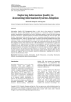 IBIMA Publishing Communications of the IBIMA http://www.ibimapublishing.com/journals/CIBIMA/cibima.html Vol. 2011 (2011), Article ID 683574, 12 pages DOI: 10.5171/2011.683574 Exploring Information Quality in Accounting Information Systems Adoption Manirath Wongsim and Jing Gao School of Computer and Information Science, University of South Australia, Mawson Lakes, Australia ______________________________________________________________________________________________________________ Abstract Information Quality (IQ) Management plays a vital role in the process of Accounting Information Systems (AIS) adoption. IQ is emerging as a well-known business problem in modern organisations. Specifically, the level of information quality is critical for all accounting processes, and has a significant impact on business decision-making. It must be noted that modern organisations rely heavily on the use of accounting information systems for their accounting processes. There is a growing need for research to provide insights into issues and solutions related to IQ in AIS adoption. This research aims to explore ways of managing information quality and AIS adoption to investigate the relationship between the IQ issues and AIS adoption process. This study has led to the development of a framework to guide the organisations on implementing an adequate IQ management approach during the system adoption process. This research was done on 44 respondents at ten organisations within manufacturing firms in Thailand. The findings of the research’s empirical evidence suggest that IQ dimensions in AIS adoption provide assistance in all processes of decision making. This research provides empirical evidence that information quality of AIS adoption affect decision making and suggests that these variables should be considered in adopting AIS in order to improve the effectiveness of AIS. Keywords: Information Quality, Information Quality Dimensions, Accounting Information Systems, Accounting Information System Adoption. __________________________________________________________________________ Introduction Nowadays, information is one of the main resources used and applied in organisations. Information development is essential for improving or developing new contexts to support management, strategy, and decision making (Lee, Strong et al. 2002; Michnik and Lo 2009; Salaün and Flores 2001). Furthermore, management information is important in organisations as it requires quality information, to improve the efficiency and effectiveness of their operations for higher profitability and increased productivity. For significant business decision-making, Information Quality (IQ) has become an important consideration for any organisation that wants to perform a variety of tasks well. Information Quality refers to the capability of data to be fit for use. There is a strong evidence that IQ issues have become a critical concern for organisations (Lee, Strong et al. 2002; Michnik and Lo 2009). Salaun and Flores (2001) indicate that, currently, customers require good quality information which is basic to the requirements of business activity and lead to high quality work performance in the partnership between supplier and consumer. According to Lee, Copyright © 2011 Manirath Wongsim and Jing Gao. This is an open access article distributed under the Creative Commons Attribution License unported 3.0, which permits unrestricted use, distribution, and reproduction in any medium, provided that original work is properly cited. Contact author: Manirath Wongsim e-maill: Manirath.Wongsim@postgrads.unisa.edu.au. Communications of the IBIMA 2 Strong et al (2002), the growth of data warehouses has increased the need for quality data in order for organisations to perform well, obtain competitive advantage, and survive in today’s global economy. Thus, data management is important in organisations, in order to support and develop different departments in corporations by enabling work processes of all sorts, as well as decisionmaking. In particular, accounting is essential in making economic decisions. Furthermore, accounting and management decisionmaking is dependent on the fit of the Accounting Information Systems (AIS) with the organisation’s requirements. Therefore, organisations must pay attention to the efficiency of their accounting information systems. In order to implement AIS successfully, it is important to address the quality of information adoption, to manage all the processes of accounting systems. Thus, this research intends to study this perspective of IQ management in AIS adoption. Background Information quality problems can impact on operations, increase costs and lower worker job-satisfaction, while increasing customer dissatisfaction (Redman 1998). In a modern world, information quality is potent in that it directs the business’s future. This is because good information quality can lead to success while poor information quality can lead to failure of the business (Bovee 2004; Redman 1998; Redman 2008). Consequently, information quality criteria have become important considerations for any organisation that wants to carry out a variety of processes well. In particular, accounting and management decision-making are concerned with the appropriateness of the AIS for the organisation’s requirements for information communication and control (Gordon and Miller 1976; McLaney and Atrill 2005). The argument behind this finding is that accounting information systems often lack high-quality data. Likewise, Ismail and King (2005) find that organisations may lack knowledge and the vision to incorporate accounting information systems; additionally, there are still problems in the process of accounting implementation. However, business needs to be seen as a system using accounting information well, requiring quality data in organisations to perform well, obtain competitive advantage, and survive in today’s global economy. These ar