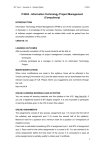 BIT Year 2 – Semester 4 – Detailed Syllabi IT4204 IT4204 - Information Technology Project Management (Compulsory) INTRODUCTION Information Technology Project Management (ITPM) is one of the compulsory courses in Semester 4. A knowledge of the concepts, theories, methodologies and techniques of software project management as well as related skills could be gained from the successful completion of this course. CREDITS: 04 LEARNING OUTCOMES After successful completion of this course students will be able to: • Demonstrate knowledge of project management concepts, methodologies and techniques • Actively participate as a manager or member of an Information Technology Project MINOR MODIFICATIONS When minor modifications are made to this syllabus, those will be reflected in the Virtual Learning Environment (VLE) and the latest version can be downloaded from the relevant course page of VLE. Please inform your suggestions and comments through the VLE. http://vle.bit.lk ONLINE LEARNING MATERIALS AND ACTIVITIES You can access all learning materials and this syllabus in the VLE: http://vle.bit.lk, if you are a registered student of BIT degree program. It is very important to participate in learning activities given in the VLE to learn this subject. ONLINE ASSIGNMENTS The assignments consist of two quizzes, assignment quiz 1 (It covers the first half of the syllabus) and assignment quiz 2 (It covers the second half of the syllabus). Maximum mark for a question is10, minimum mark for a question is 0 (irrespective of negative scores). Final mark is calculated considering 40% of assignment quiz 1 and 60% of assignment quiz 2. Pass mark for the online assignments in a course is 50. You are advised to do online assignments before the final exam of the course. It is compulsory to pass all online assignments to partially qualify to obtain year 2 certificate. 1 BIT Year 2 – Semester 4 – Detailed Syllabi IT4204 FINAL EXAMINATION Final exam of the course will be held at the end of the semester. Examination Paper will consist of two parts. • Part 1 : 1 Hour paper consisting of Multiple Choice Questions • Part 2 : 1 Hour paper consisting of Structured Questions OUTLINE OF SYLLABUS Topic Hours 1- Introduction to Project Management 05 2-Information Technology Context and Process Groups in Project Management 06 3-Project Integration Management 08 4-Project Scope Management 05 5-Project Time Management 07 6-Project Cost Management 06 7-Project Quality Management 06 8-Project Human Resource Management 05 9-Project Communications Management 04 10-Project Risk Management 05 11-Project Procurement Management 03 Total 60 REQUIRED MATERIALS Main Reading Ref 1: “Information Technology Project Management” Kathy Schwalbe, Fourth Edition, THOMSON Course Technology, 2007 (ISBN 81-315-0123-X). Supplementary Reading Ref 2: “Software Project Management” Bob Hughes and Mike Cotterell, Fourth Edition, Tata McGraw-Hill Ref 3: http://en.wikipedia.org/wiki/List_of_project_management_software Ref 4: http://www.niwotridge.com/PDFs/PM%20Chapter%20%28short%20no%20email%2 9%20Update%202.pdf 2 BIT Year 2 – Semester 4 – Detailed Syllabi IT4204 DETAILED SYLLABUS: Section 1: Introduction to Project Management (05 hrs) Instructional Objectives: • Explain what a project is, provide examples of information technology projects, list various attributes of projects, and describe the triple constraint of projects • Describe project management and discuss key elements of the project management framework, including project stakeholders, the project management knowledge areas, common tools and techniques, and project success factors • Describe the role of the project manager by describing what project managers do, and the skills they need • Describe the importance of ethics in project management • Identify different project management software • State challenges and trends in IT Project Management Material /Sub Topics 1.1 What is a Project [Ref 1: pg. 4] 1.1.1 Advantages of project management [Ref 1: pg. 4] 1.1.2 Examples of information technology projects [Ref 1: pg. 5] 1.1.3 Project attributes [Ref 1: pg. 5 - 6] 1.1.4 The triple constraint [Ref 1: pg. 7] 1.2 What is Project Management? [Ref 1: pg. 9] 1.2.1 Project stakeholders [Ref 1: pg. 10 - 11] 1.2.2 Project management knowledge areas [Ref 1:pg.11-12] 1.2.3 Project management tools and techniques [Ref1: pg.12-13] 1.2.4 Project success factors [Ref 1: pg. 14 - 15] 1.3 The Role of the Project Manager [Ref 1: pg. 16] 1.3.1 Job description [Ref 1: pg. 16 - 17] 1.3.2 Skills for project manager [Ref 1:pg. 17 - 22] 1.3.3 Project management profession [Ref 1: pg 24] 1.3.4 The Project Management Institute [Ref 1: pg 28-30] 3 BIT Year 2 – Semester 4 – Detailed Syllabi IT4204 1.4 Ethics in Project Management [Ref 1: pg. 30 - 31] 1.5 Project Management Software [Ref 1: pg. 31 - 32] [Ref 3] 1.6 New Trends in IT Project Management [Ref 4] 1.6.1 Heavy weight and lightweight software processes [Ref 4] 1.6.2 Managing agile IT projects [Ref 4] Section 2 : Information Technology Context and Process Groups in Project Management (06 hrs) Instructional Objectives: • Describe the systems view of project management and how it applies to information technology projects • Explain why stakeholder management and top management commitment are critical for a project’s success • Describe the concept of a project phase and the project life cycle • Discuss the unique attributes and diverse nature of information technology projects • Describe the five project management (PM) process groups • Describe how the PM process groups relate to the PM knowledge areas 2.1 A Systems View of Project Management [Ref 1: pg. 40] 2.1.1 What is a systems approach? [Ref 1: pg: 40] 2.1.2 The three-sphere model for systems management [Ref 1:pg.41 - 42] 2.1.3 Stakeholder management [Ref 1: pg. 49 - 50] 2.1.4 The importance of top management commitment [Ref 1: pg. 51] 2.1.5 The need for organizat