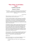What Makes Serial Killers Tick? by Shirley Lynn Scott Monsters or Victims? "It was an urge. . . . . A strong urge, and the longer I let it go the stronger it got, to where I was taking risks to go out and kill people--risks that normally, according to my little rules of operation, I wouldn't take because they could lead to arrest." -- Edmund Kemper Where does this urge come from, and why is so powerful? If we all experienced this urge, would we be able to resist? Is it genetic, hormonal, biological, or cultural conditioning? Do serial killers have any control over their desires? We all experience rage and inappropriate sexual instincts, yet we have some sort of internal cage that keeps our inner monsters locked up. Call it morality or social programming, these internal blockades have long since been trampled down in the psychopathic killer. Not only have they let loose the monster within, they are virtual slaves to its beastly appetites. What sets them apart? Serial killers have tested out a number of excuses for their behavior. Henry Lee Lucas blamed his upbringing; others like Jeffrey Dahmer say that they were born with a "part" of them missing. Ted Bundy claimed pornography made him do it. Herbert Mullin, Santa Cruz killer of thirteen, blamed the voices in his head that told him it was time to "sing the die song." The ruthless Carl Panzram swore that prison turned him into a monster, while Bobby Joe Long said a motorcycle accident made him hypersexual and eventually a serial lust killer. The most psychopathic, like John Wayne Gacy, turn the blame around and boast that the victims deserved to die. They must be insane -- what normal person could slaughter another human, for the sheer pleasure of it? Yet the most chilling fact about serial killers is that they are rational and calculating. As the "British Jeffrey Dahmer" Dennis Nilsen put it, "a mind can be evil without being abnormal." What They Are Before we look at who they are, we must first describe what they are. In his book The Killers Among Us, Steven Egger defines serial murder: • A minimum of three to four victims, with a "cooling off" period in between; • The killer is usually a stranger to the victim -- the murders appear unconnected or random; • The murders reflect a need to sadistically dominate the victim; • The murder is rarely "for profit"; the motive is psychological, not material; • The victim may have "symbolic" value for the killer; method of killing may reveal this meaning; • Killers often choose victims who are vulnerable (prostitutes, runaways, etc.) Statistically, the average serial killer is a white male from a lower to middle class background, usually in his twenties or thirties. Many were physically or emotionally abused by parents. Some were adopted. As children, fledgling serial killers often set fires, torture animals, and wet their beds (these red-flag behaviors are known as the "triad" of symptoms.) Brain injuries are common. Some are very intelligent and have shown great promise as successful professionals. They are also fascinated with the police and authority in general. They will either have attempted to become police themselves but were rejected, or worked as security guards, or had served in the military. Many, including John Gacy, the Hillside Stranglers, and Ted Bundy, will disguise themselves as law enforcement officials to gain access to their victims. Who They Kill Serial killers choose victims weaker than themselves. Often their victims will fit a certain stereotype which has symbolic meaning for the killer. Bundy brutally murdered college-age women with long brown hair. Was he killing, over and over again, the upper-class fiancee who broke off her engagement with him? David Berkowitz, aka "Son of Sam," was not so particular -- he hated all women: "I blame them for everything. Everything evil that's happened in the world--somehow goes back to them." Gacy savagely strangled young men, some of them his own employees, calling them "worthless little queers and punks." Some believe that Gacy's homicidal rage was projected onto the boys who represented his own inadequacy in the eyes of his own domineering father. With rare exception, serial killers objectify and humiliate their victims. Bundy deliberately kept the conversation brief -- if he got to know the victim and saw her as a real person, it would destroy the fantasy. Serial killers are sadists, seeking perverse pleasure in torturing the victim, even resuscitating them at the brink of death so they can torture them some more. ("How's it feel, knowing you're going to die?" Gacy asked his victims as he strangled them, even reciting the 23rd Psalm, urging them to be brave in the face of death.) They need to dominate, control, and "own" the person. Yet when the victim dies, they are abandoned again, left alone with their unfathomable rage and self-hatred. This hellish cycle continues until they are caught or killed. Why Are They So Difficult to Spot - Getting Away with Murder We think we can spot lunacy, that a maniac with uncontrollable urges to kill will be unable to contain himself. On the bus, in the street, it is the mentally ill we avoid, sidestepping the disheveled, unshaven man who rants on over some private outrage. Yet if you intend to avoid the path of a serial killer, your best strategy is to sidestep the charming, the impeccably dressed, polite individual. They blend in, camouflaged in contemporary anonymity. They lurk in churches, malls, and prowl the freeways and streets. "Dress him in a suit and he looks like ten other men," said one attorney in describing Dahmer. Like all evolved predators, they know how to stalk their victims by gaining their trust. Serial killers don't wear their hearts on their sleeves. Instead, they hide behind a carefully constructed facade of normalcy. Mask of Sanity Because of their psychopathic nature, serial killers do not know how to feel sympathy for others, or even how to have a relationship