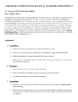 STUDENTS COMING INTO LATIN B: SUMMER ASSIGNMENT To: Next year’s (2013-2014) Latin B Students From: Magistra Drown Included below are the instructions and handouts that you will need for your Latin summer assignment. Do not be frightened by the length of this document – it is not as “scary” as it looks. Much of the material here is information and guidelines, plus the long list of review vocabulary. Moreover, this assignment should be done in several sittings spread throughout the summer (not all at once and ideally not at the very beginning or the very end of summer). The goal is for you to be looking at and thinking „Latin‟ at least a few times throughout the summer to help keep your knowledge fresh. The written assignments (ER Vocabulary: Chapter 10 sheet, Grammar Review Worksheet, and Ecce Romani Chapter 10 translation) should take 2-3 hours and are due on the first day of class. In addition, spend some time studying the new and review vocabulary and reviewing the forms which have been challenging for you. Assignment: 1. Vocabulary: Read the Vocabulary Learning Guide (attached) and follow the steps. Using your Ecce Romani book, complete the ER Vocabulary: Chapter 10 sheet (attached). Study this vocabulary for a quiz within the first few days of school. Study the Latin A Vocabulary Review List (attached). This long list contains the words that you have studied over this year. 2. Grammar: Review the forms for 1st, 2nd, and 3rd declension nouns. Review the formation of regular verbs and esse & posse in the present tense. Complete the Grammar Review Worksheet (attached). 3. Translation: Translate Ecce Romani Chapter 10. Please do the translation on lined paper and SKIP LINES when translating. Remember that translation requires you to combine your knowledge of vocabulary and grammar and to consider many factors at the same time. Be sure to pay careful attention to both noun and verb endings. Guidelines: 1. Though it is great to add helpful information (such as forgotten vocabulary) in your books, do NOT write any English between the lines or next to the Latin text when translating Chapter 10. 2. Feel free to consult your grammar notes, glossary, and grammar charts at the back of the book. Make note of what concepts are challenging and add them to your list of things to review. 3. You may NOT work on any part of the written assignment with anyone else. You must complete the entire assignment on your own. 4. You absolutely may get help from someone else (a classmate, parent, sibling, kind friend) when doing your study and review. If you have any questions about the assignment or my guidelines, please feel free to get in touch with me over the summer at ldrown@nya.org. Good luck and enjoy your summer! Vale, Magistra Drown VOCABULARY LEARNING GUIDE For most people, truly learning vocabulary takes time, effort, and hard work. If you want to master vocabulary, remember it forever, and do well on vocabulary quizzes and tests, follow the steps below. I. DEFINE: Look up the definition of each word in your book and write the definition on your vocabulary sheet. Make sure that you understand the definition. If there are multiple definitions, find out which ones you need to know. II. USE DERIVATIVES: Go down the vocabulary list and write a derivative(s) for every word that you can. You do not need to look in a dictionary. Try to think about the Latin word and its meaning, and make connections to English. These can help you to recognize the Latin words later. It also gets you thinking about the relationship between Latin and English which can help you break down and better understand more complex English vocabulary. III. MAKE FLASHCARDS: Make a flashcard for each vocabulary word. 3x5 index cards are ideal. On the front of each card, write out all of the Latin forms and information (e.g. gender of noun); on the back, write the English definition(s). It is useful to put the chapter number in the upper right hand corner. If you have difficulty figuring out different parts of speech, you may want to indicate this on the back under the definition. Simply writing out the flashcards can help you to learn the forms, but you will also use these flashcards later. IV. WRITE OUT THE FORMS: On a separate piece(s) of paper (scrap paper is fine), write out the words and definitions a minimum of three times each. Be sure to write out all the forms and necessary definitions. Pay careful attention to the spelling and long marks (macrons). Writing these forms can help to cement each in your brain and is especially useful for learning the correct spelling and long marks. V. SAY THE FORMS ALOUD: As you write out the forms and definitions (step IV), say each aloud. The combination of writing, reading, speaking, and listening is golden for learning vocabulary. VI. USE THE FLASHCARDS: Go through the Latin side of the flashcards, quizzing yourself on the definition(s). Read the Latin forms aloud. Say your answer aloud and then flip the card to check your response. Read the answer aloud. If your answer is correct, put the card facedown in a pile on your right. If your answer is incorrect or you had no guess at all, put the card facedown in a pile on your left. Go through the entire deck in this manner. Now go through the pile on your right (the ones you know) again to be sure that you have really mastered those forms. Go through the pile on your left (the ones you don‟t know yet) again and again until all of the cards are in the right side “the ones you know” pile. VII. USE THE FLASHCARDS AGAIN: Repeat all of the steps from step VI (above) going through the English definition side of the flashcards. Be sure that you know how to spell each of the Latin forms, including long marks. VIII. QUIZ YOURSELF: Make three quizzes for yourself, following my vocabulary quiz format (five Latin to English and five English to Latin). Take the quiz and grade it. If you had difficulty with the quiz, figure out where your proble