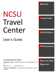 MyTravel NCSU Travel Center Page 1 Travel Center Authorizations User’s Guide Reimbursements University Controller’s Office Kimberly H. Kelley - Assistant Controller- Accounts Payables & Travel 919.515.7132 khkelley@ncsu.edu Terressa R. Yeakle Best -Travel & Small Purchases Manager, Training Manager Dept. Use Only/ Approvers NCSU TRAVEL CENTER Page 2 Message December 16, 2013 The New NCSU Travel Center is now available for processing. Please refer to the following information when processing documents from the old travel system. Authorizations Any approved travel authorizations currently in the system will be available for use within the new Travel Center. To access them, go to MyPack Portal → Employee Self Service → Travel Center → Recent Travel Requests Reimbursements All Travel Reimbursements (TR) will be displayed in the new look. Travel Reimbursements entered and vouchered will be processed using the old approval workflow process. The approval workflow process will occur on the voucher. Travel Reimbursements entered and not vouchered prior to 12/14/2013 will be converted into the new look; however, the voucher will be created through the TR. You will see a new Create Reimbursement button at the top of the Travel Reimbursement. To voucher, click on the Create Reimbursement button. The approval workflow process will occur on the voucher. Approvals The Travel Approval Setup page has changed. This page includes the Campus Approver (formally Final Approver) and Supervisor Approver. This page can be used to verify the campus approver and supervisor for your traveler. The Campus Approver is an optional approval in the Travel System. The Final Approvers available prior to the travel enhancements will convert over to Campus Approvers. If the Campus Approver is not needed for your business process, you can remove the approver on the Travel Approval Setup page. The approvers can be changed individually or in groups. The Administrative Reviewer and Approver roles have been removed. The Travel System has multiple approvers for travel authorizations and reimbursements. The Traveler Certification, Dept./College Funding, College Research Funding, Supervisor and Campus Approver. The Traveler Certification is required when the traveler does not enter their own travel reimbursement. The Dept./College Funding and College Research funding approvers are setup under Workflow Administration. The Supervisor is defaulted from the HR System and can be changed on travel authorizations and reimbursements. The Campus Approver is required if listed on the Travel Approval Setup page. NCSU TRAVEL CENTER User’s Guide Table of Contents MyTravel Setting Up the MyTravel Pagelet Page 4 Travel Center Exploring the Travel Center Page Page 5-6 Updating Traveler Profile Page 6 Establish a Default Funding Source Page 7 Begin a Travel Authorization Page 8 1 Basic Travel Details Page 9-10 2 My Estimated Expenses Page 11-15 List of Available Expenses Page 12 3 Document Upload Page 16 4 Funding Source Page17 5 Approval Routing Page 18 Begin a Travel Reimbursement from an Authorization Page 19-20 1 Basic Travel Details Page 21 2 My Estimated Expenses Page 22-24 3 My Receipt Page 25 4 Funding Source Page25 5 Approval Routing Page 26 Reimbursement Without an Authorization Page 27 Reimbursement for a Non Employee Page 28-29 Accounting Information Page 30 University Pre-Paid Expenses Page 30 Approving a Document Page 31 Denying a Document Page 31 Correcting a Warning Page 32 Authorizations Reimbursements Dept. Use Only Approvals Page 3 NCSU TRAVEL CENTER Page 4 User’s Guide Welcome to the new NCSU Travel Center. This guide will provide you with step-by-step instructions on Setting-up the MyTravel Pagelet, Entering an Authorization, Entering a Reimbursement from an Authorization, and Entering a Reimbursement without an Authorization. If you have additional questions, which this guide does not satisfy, please contact Travel Audit. MyTravel The MyTravel pagelet provides the traveler with status information regarding their travel, including the status of an authorization or reimbursement status, as well as payment dates and payment amounts. The pagelet can be inserted on the MyPack Home page, For Faculty and Staff page, or the For Researchers page. Setting-up the Pagelet 1. Login into MyPack Portal 2. Go to the portal location where you would like the pagelet inserted: MyPack Home, For Faculty & Staff, or For Researchers. 3. Select Content located in the right hand corner of the page. All pagelets will display. 4. Under Financial Systems, check the box for MyTravel. 5. Click Save & Return to Home. 6. Click and drag the pagelet to wherever you would like it placed on your portal page. NCSU Travel Center Page 5 User’s Guide Travel Center The Travel Center is the hub of all travel activities. Authorizations, reimbursements, approvals ,and inquiries all take place within the Travel Center. To access the Travel Center, login to MyPack portal. Go to Employee Self Service and select the Travel Center link. Exploring the Travel Center b a c d e f g h i a. Traveler: Traveler’s name will display. b. Travel Inquiry: Users can search travel documents by the traveler’s name, vendor ID, date entered, document status, project, or department. c. Update My Profile: Only the traveler can update their profile. Travelers can establish a default project to use for their travel. Proxy users, those that submit travel on behalf of others, can add travelers. d. Approval Worklist: Provides a listing of documents that require your approval. NCSU Travel Center Page 6 User’s Guide Travel Center e. New Authorizations: Start here when creating a new travel authorization for an employee. f. Recent Requests: Provides 60 days of travel history. If you are a proxy user and need to access a traveler’s recent requests, change the traveler within the Change Traveler dropdown listing located in the top left corner of the Travel Center page. g. Create Re
