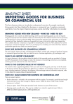 JBMS FACT SHEET: IMPORTING GOODS FOR BUSINESS OR COMMERCIAL USE This fact sheet provides an introduction and general overview for people wanting to bring goods into New Zealand for business or commercial use. It explains commonly used terms, how the import clearance process works and other information to consider. BRINGING GOODS INTO NEW ZEALAND – WHAT DO I NEED TO DO? Bringing goods into a country is called importing, and if you are importing goods, you are an importer. All goods imported into New Zealand need to be cleared by the New Zealand Customs Service (Customs) and the Ministry for Primary Industries (MPI). These government agencies check information on all goods imported into New Zealand to make sure the goods don’t pose a risk and to collect any charges due. This is called ‘clearance’. Clearance is required for everything that comes into New Zealand, from online shopping to commercial shipments. Even if you are flying in for a holiday you’ll notice that New Zealand government agencies may check your personal goods. WHAT ARE BUSINESS OR COMMERCIAL GOODS? The word ‘goods’ means any item, including personal effects, animals and commercial products. Business or commercial goods are items that you intend to use in a business application, gift, exchange or sell. WHAT IS AN IMPORT CLEARANCE? An import clearance is the procedure where the details of the imported goods are provided to Customs and MPI, the payment of any charges is made, the necessary risk screening and actions are completed, and the goods are authorised to enter New Zealand. WHAT IS THE CUSTOMS VALUE OF MY GOODS? The Customs value is applied regardless of how you came to own the goods, and may not be the same as the amount paid for the goods because deductions or additions are sometimes necessary. To find out more, including methods of valuation, the influence of the exchange rate and information required, refer to Fact Sheet 15: Customs Value of Imported Goods. HOW DO I CLEAR GOODS FOR BUSINESS OR COMMERCIAL USE? There are several options. • Border clearance is included in the arrangement with the supplier. For example, goods that are bought online and sent to your door through an express courier. Check the terms of sale to see if border clearance is included. • Using an agent. Check if the agent provides border clearance as part of their service. • Clearing goods yourself online. This may be suitable if you intend to regularly import. Refer to JBMS Fact Sheet: Applying to be a TSW registered user. ISSUE DATE: JULY 2015 Either way, details of imported goods for business or commercial use are submitted electronically and screened by New Zealand government agencies. The clearance process will depend on the value, the type of goods and whether they have been sent to you after purchase, or you are bringing them back. The most common are detailed below. IMPORTING GOODS WITH A CUSTOMS VALUE OF MORE THAN NZ$1,000 Importing goods with a Customs value of more than NZ$1,000 requires an import declaration to be entered electronically. Only Trade Single Window (TSW) registered users can submit an import declaration electronically, as they have the necessary knowledge and understanding of requirements. To find out about becoming a TSW registered user refer to JBMS Fact Sheet: Applying to be a TSW registered user. If you are importing goods with a Customs value over NZ$1,000 you also need a client code, which you can apply for by completing a current NZCS Form 224. If you are using an agent they usually provide all the necessary documentation, including this form. IMPORTING GOODS WITH A CUSTOMS VALUE OF NZ$1,000 OR LESS You will need to submit details of any goods that attract charges in an electronic declaration, either yourself or through an agent. Goods are screened at mail centres and Customs ports, and if they attract charges of more than NZ$60 they are held aside to determine the value, and you or your agent contacted to arrange clearance. If your goods do not attract charges of NZ$60 then no Customs charges are collected, though MPI charges may still apply – refer here. In this case, the goods are screened, appropriate actions undertaken, and released. However, if there is any doubt about the value, the goods will be held and proof of the value required before they are released. Delivery of the goods once cleared will depend on the terms of carriage you have arranged. WHO IS INVOLVED IN GOODS CLEARANCE? The importer Importers may be able to clear goods themselves, or need to provide accurate information to an agent. Agents The New Zealand government has rules and regulations regarding what can and can’t come into our country. Agents are people and organisations who know these requirements, and have the expertise and software needed to clear imported goods with government agencies. You can engage them to do this on your behalf. Customs and MPI These are the two main government agencies involved in allowing your goods into New Zealand. All people, goods and craft entering and leaving New Zealand must be reported to and screened by Customs, who will also collect any charges due as part of the entry or exit. MPI manage New Zealand’s bio-security and food safety requirements as part of their role in protecting and promoting New Zealand’s primary industries. PAGE 2 ISSUE DATE: JULY 2015 ENGAGING AN AGENT You need to decide which agent to use. You can find a list of agents in New Zealand business directories. Those affiliated to the Customs Brokers and Freight Forwarders Federation of New Zealand (CBAFF) are also listed at www.cbaff.org.nz WHAT AM I RESPONSIBLE FOR WHEN AN AGENT CLEARS THE GOODS? As you are the importer of the goods, any actions or declarations that the agent makes on your behalf are considered to be your actions or declarations also. This means you may need to pay any penalties or additional duties that are incurred by the agent in this clearance process; for example, additional duties w