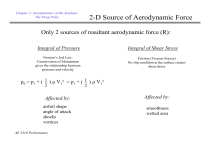 Chapter 2- Aerodynamics of the Airplane: The Drag Polar 2-D Source of Aerodynamic Force Only 2 sources of resultant aerodynamic force (R): Integral of Pressure Integral of Shear Stress Newton’s 2nd Law: Conservation of Momentum gives the relationship between pressure and velocity Friction (Viscous Forces) No slip condition at the surface creates shear stress p0 = p1 + ( 1 ) ρ V12 = p1 + ( 1 ) ρ V12 2 2 Affected by: Affected by: airfoil shape angle of attack shocks vortices smoothness wetted area AE 3310 Performance Chapter 2- Aerodynamics of the Airplane: The Drag Polar Source of Aerodynamic Force A body immersed in an airflow will experience an Aerodynamic Force due to: Pressure Integrate around the surface of the body to get the total force: p=p(s) S acts perpendicular to the surface ∫∫ p n d S+ ∫∫τ k d S R= S S Shear Stress τ=τ(s) S n k acts parallel to the surface AE 3310 Performance dS Chapter 2- Aerodynamics of the Airplane: The Drag Polar Aerodynamic Lift, Drag, and Moments AERODYNAMIC FORCES L (defined as perpendicular to V∞ ) MOMENTS R (not perpendicular to V∞) D (defined as parallel to V∞) MLE Mc 4 α V∞ c “free stream velocity” or “relative wind” By convention, a moment which rotates a body causing an increase in angle of attack is positive. AE 3310 Performance Chapter 2- Aerodynamics of the Airplane: The Drag Polar Center of Pressure Question: At what point on the body do the lift and drag (or R) act? Answer: The forces act at the centroid of the distributed load, called the center of pressure L L L Mc 4 D c.p. NO moment! = D c 4 Same force, but move it to the quarter chord and add a moment = M LE D Same force, but now it’s at the leading edge, along with a moment about the leading edge Question: So why don’t we use center of pressure as reference point in aircraft dynamics? Answer: Because c.p. shifts when angle of attack is changed. Use quarter chord. AE 3310 Performance Chapter 2- Aerodynamics of the Airplane: The Drag Polar Aerodynamic Coefficients From intuition and basic knowledge, we know: aerodynamic force = f (velocity, density, size of body, angle of attack, viscosity, compressibility) L = L(ρ∞, V ∞, S, α, µ ∞, a ∞) D = D(ρ∞, V ∞, S, α, µ ∞, a ∞) M = M(ρ∞, V ∞, S, α, µ ∞, a ∞) To find out how the lift on a given body varies with the parameters, we could run a series of wind tunnel tests in which the velocity, say, is varied and everything else stays the same. From this we could extract the change in lift due to change in velocity. If we did this for each parameter, and each force (moment), we would have to conduct experiments that resulted in 19 stacks of data (one for each variation plus a baseline). This is bad: wind tunnel time is very expensive and the whole process is time consuming. AE 3310 Performance Chapter 2- Aerodynamics of the Airplane: The Drag Polar Aerodynamic Coefficients Instead, let’s define lift, drag, and moment coefficients for a given body: CL = L q∞ S CD = D q∞ S CM = M q∞ Sc and q is defined as the dynamic pressure: q = 1 ρ V∞ 2 2 c is defined as a characteristic length of a body, usually the chord length Now define the following similarity parameters: Re = ρ ∞ V ∞ c µ∞ Reynold’s Number (based on chord length) AE 3310 Performance M∞= V∞ a∞ Mach Number Chapter 2- Aerodynamics of the Airplane: The Drag Polar Aerodynamic Coefficients Using dimensional analysis, we get the following results. For a given body shape: CL = f1( α, Re, M ∞) CD = f2( α, Re, M ∞) CM = f3( α, Re, M ∞) If we conduct the same experiments, we can now get the equivalent data with 10 stacks of data. But more fundamentally, dimensional analysis tells us that, if the Reynold’s Number and the Mach Number are the same for two different flows (different density, velocity, viscosity, speed of sound), the lift coefficient will be the same, given two geometrically similar bodies at the same angle of attack. This is the driving principle behind wind tunnels. But…be careful. In real life, it is very difficult to match both Re and M. AE 3310 Performance Chapter 2- Aerodynamics of the Airplane: The Drag Polar Reference Area, S S is some sort of reference area used to calculate the aerodynamic coefficients. S as wetted area - not common, but is the surface upon which the pressure and shear distributions act, so it is a meaningful geometric quantity when discussing aerodynamic force. S as planform area - the projected area we see when looking down at the wing or aircraft (the “shadow”). Most common definition of S used when calculating aerodynamic coefficients. S as base area - mostly used when analyzing slender bodies, such as missiles. The Point: it is crucial to know how S was defined when you look at or use technical data! AE 3310 Performance Chapter 2- Aerodynamics of the Airplane: The Drag Polar Variation of Coefficients with Parameters How do the coefficients vary with α, Re, and M? Answer: it depends on the flow regime and the shape of the body. Primarily, the effect of the three parameters is that they change the pressure distribution, and thus R. Note linear shape of slope AE 3310 Performance Generic Lift Curve Slope Chapter 2- Aerodynamics of the Airplane: The Drag Polar cl vs. α First question: What is difference between CL and cl? CL is for the whole (3-D) aircraft. cl is for 2-D shape, usually just airfoil. Features of Typical Airfoils and Lift Curve Slope: Slope is mostly linear over practical range of alpha For thin airfoils, theoretical maximum of lift curve slope is 2π per radian For most conventional airfoils, experimentally measured lift slopes are very close to theoretical values. All positively cambered airfoils have negative zero-lift angles of attack. A symmetric airfoil has a zero-lift angle of attack equal to zero (α L=0=0 deg) At high angles of attack, slope becomes non-linear and airfoil exhibits stall due to seperated flow. AE 3310 Performance Cha