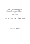 Request For Proposal Wireless Broadband System For [The User] Technical Requirements Date: Aug 12, 2014 Request for Proposal [Propsal No.] Table of Contents 1. 2. 3. 4. 5. 6. 7. Introduction ............................................................................................ 4 1.1 Scope ................................................................................................ 4 Service Background ..............................................................................4 2.1 Service Overview ............................................................................. 4 Service Configuration ...........................................................................4 3.1 Outdoor Coverage ......................................................................... 5 3.2 Indoor Coverage ............................................................................. 6 3.2.1 Wireless Backhaul with CPE .............................................. 6 3.2.2 Wired Backhaul with Indoor AP (Optional) .................... 6 3.3 Data Center...................................................................................... 6 Ethernet Switch....................................................................................... 7 4.1 Network Connectivity ..................................................................... 7 4.1.1 Fast Ethernet Interface ...................................................... 7 4.2 Operation Support ........................................................................... 7 4.2.1 802.1Q (VLAN) .................................................................... 7 4.2.2 802.1p (QoS) and Traffic Prioritization ............................. 7 Access Point (AP) .................................................................................. 7 5.1 Network Connectivity Requirements ............................................ 7 5.1.1 WAN Interface .................................................................... 7 5.2 Wireless Network Features .............................................................. 8 5.2.1 Operation Mode Support ................................................. 8 5.2.2 Radio Frequency Setting .................................................. 8 5.2.3 Multiple SSID Support ......................................................... 8 5.2.4 Wireless Security ................................................................. 9 5.2.5 Encryption support ............................................................. 9 5.3 Authentication Support .................................................................. 9 5.3.1 UAM (Universal Access Method) ..................................... 9 5.3.2 802.1x Mutual Authentication .......................................... 9 5.3.3 RADIUS Support .................................................................. 9 5.3.4 EAP Support ...................................................................... 10 5.4 System Operation Features .......................................................... 10 5.4.1 Per SSID Operation ........................................................... 10 5.4.2 VLAN Configuration ......................................................... 10 5.4.3 Bridge Mode ..................................................................... 10 5.4.4 Quality of Service (QoS) Support................................... 11 802.11e WMM .................................................................................. 11 Wireless Bridge ..................................................................................... 11 6.1 Network Connectivity Requirements .......................................... 12 6.1.1 Network Interface ............................................................ 12 6.2 Wireless Network Features ............................................................ 12 Wireless CPE ......................................................................................... 12 7.1 Network Connectivity Requirements .......................................... 12 7.1.1 WAN Interface .................................................................. 12 7.1.2 LAN Interface.................................................................... 13 Request for Proposal [Propsal No.] 7.2 Security Features ............................................................................ 13 7.3 Networking Features ..................................................................... 13 7.4 Management Features ................................................................. 13 8. Service Control System .......................................................................14 8.1 System Capacity ............................................................................ 14 8.2 Functions and Features ................................................................. 14 8.2.1 Bandwidth Controller ...................................................... 14 8.2.2 Access Controller ............................................................. 14 8.2.3 Backbone Router ............................................................. 14 8.2.4 Firewall ............................................................................... 15 8.2.5 VPN Server ......................................................................... 15 8.2.6 DHCP and Proxy Servers ................................................. 15 8.2.7 Tools.................................................................................... 15 9. Management & System Support Tools ............................................... 15 9.1 Remote Monitoring ........................................................................ 16 9.2 Administration................................................................................. 16 9.3 Management Security Configurations ....................................... 16 9.4 Remote Firemare Upgrade .......................................................... 16 10. Network Management System ................................