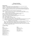 The Secret Life of Bees Literary Terms and Vocabulary Literary Terms Protagonist – the main character in a work, on whom the author focuses most of the narrative attention. Antagonist – the character against whom the protagonist struggles Point of View – vantage point from which a writer tells a story (omniscient, first person, and third person). Symbolism – frequent use of words, places, characters, or objects that mean something beyond the literal level. Flashback – a scene that interrupts the present action of the plot to flash backward and tell what happened at an earlier time. Foreshadowing – the use of clues to hint at events that will occur later in a plot. Theme - the central idea the writer wishes to reveal about a subject through a work of literature. Allusion – reference to a statement, a person, a place, or an event from literature, history, religion, mythology, politics, sports, science, or pop culture. Motif – a conspicuous recurring element which appears frequently in a work of literature. Epigraph – a quotation or sentence usually placed at the beginning of a chapter. Plot – series of related events that make up a story of drama. Characterization – the process of revealing the personality of a character (direct and indirect). Conflict – struggle or clash between opposing characters or forces. Setting – the time and place of a story. Mood – a story’s atmosphere or the feeling it evokes. Tone – attitude a writer takes toward a subject, a character, or the audience. Irony – contrast between expectation and reality – between what is said and what is meant, between what is expected to happen and what really happens, or between what appears to be true and what is true. Figurative Language – language that uses words or expressions with a meaning that is different than the literal interpretation. Common types include: Simile – figure of speech that makes a comparison between two unlike thinks using like, as, resembles or than. Metaphor – figure of speech that makes a comparison between two seemingly unlike things. Hyperbole – figure of speech that uses exaggeration to express strong emotion or to create a comic effect. Personification – kind of metaphor in which a nonhuman thing or quality is talked about as if it were human. Imagery – language that appeals to the five senses. Vocabulary Words Ch. 1 Pivot, (v) p. 10 Disjointed, (adj) p.7 Coax, (v) p. 6 Orneriness, (adj) p. 3 Presumptuous, (adj) p. 2 Imbecile, (n) p. 11 Carousing, (v) p. 12 Magnitude, (n) p. 13 Recoil, (v) p. 32 Parsonage, (n) p. 31 Ch. 2 Wrench, (v) p. 40 Beseeching, (v) p. 40 Gore, (v) p. 42 Pious, (adj) p. 44 Decapitate, (v) p. 37 Ch.3 Barge, (n) p. 57 Turpentine, (n) p. 62 Scuppernong, (n) p. 62 Consternation, (n) p. 64 Ch. 4 Pith Helmet, (n) p. 67 Billows, (n) p. 67 Simultaneously, (adv) p. 69 Radiating, (v) p. 69 Pomade, (n) p. 71 Corrugated, (adj) p .71 Gourds, (n) p. 80 Ch. 5 Consolation, ( p. 82 Marvel, p. 84 Bona fide, p. 85 Indignation, p. 87 Resentment, p. 88 Vigilante, p. 88 Outlandish, p. 92 Recede, p. 94 Sedative, p. 94 Ch. 6 Beaming, p. 102 Percolator, p. 102 Crimson, p. 106 Deliverance, p. 1-7 Consolation, p. 108 Solace, p. 109 Bewildered, p 112 Ch. 7 Equated, p. 115 Cloister, p. 115 Riotous, p. 115 Bordello, p. 115 Extractor, p. 117 Incessantly, p. 120 Excursion, p. 124 Consignment, p. 125 Plying, p. 128 Ch. 8 Figurehead, p. 141 Kamikaze, p. 151 Locusts, p. 151 Jag, p. 152 Ascribed, p. 154 Ch. 9 Sheen, 168 Nymphs, p. 168 Dander up, p. 169 Inferno, p. 169 Shiftless, p. 171 Cunning, p. 173 Conjured, p. 178 Ch. 10 Organism, p. 190 Catacombs, p. 206 Ch. 11 Vat, p. 220 Semblance, p. 222 Ch. 13 Roving, p. 261 Lacquer, p. 261 Commode, p. 262 Contemptible, p. 268 Ch. 14 Stupefied, p. 277 Demoralized, p. 289 Drone, p. 287 Hasten, p. 290 Exertion, p. 294 Resolve, p. 298 Ignoramuses, p. 301 The Secret Life of Bees Reading, Vocabulary, Study Guide & Quiz Calendar* Monday Tuesday Wednesday Thursday Friday Mar 18th Mar 19th Mar 20th Due: SG/Voc Chap 1 Mar 23rd Mar 24th HW: Read pp 1-10 Mar 25th Due: SG/Voc Chap 2 Quiz Chaps 1-2 Due: SG/Voc Chap 3 HW: Read pp 45-56 Apr 6th HW: Read pp 57-66 Apr 7th HW: Read pp 67-81 Apr 8th HOLIDAY - STAFF DEVELOPMENT Due: SG/Voc Chap 6 Due: SG/Voc Chap 7 HW: Read pp 10-33 Mar 26th HW: Read pp 34-45 Mar 27th Due: SG/Voc Chap 4 Due: SG/Voc Chap 5 Quiz Chaps 3-4 HW: Read pp 82-101 Apr 9th HW: Read pp 102-114 Apr 10th Apr 16th HW: Read pp 136-164 Apr 17th Quiz Chaps 5-6 Apr 13th HW: Read pp 115-135 Apr 14th Due: SG/Voc Chap 8 Due: SG/Voc Chap 9 Apr 15th Due: SG/Voc Chap 10 Quiz Chaps 7-8 Quiz Chaps 9-10 HW: Read pp 165-188 Apr 20th HW: Read pp 189-202 Apr 21st HW: Read pp 202-213 Apr 22nd HW: Read pp 214-231 Apr 23rd Apr 24th Due: SG/Voc Chap 11 Due: SG Chap 12 Due: SG/Voc Chap 13 Due: SG/Voc Chap 14 Essay Outline Quiz Chaps 13-14 Start Film Quiz Chaps 11-12 HW: Read pp 233-256 Apr 27th HW: Read pp 257-276 Apr 28th HW: Read pp 289-302 Apr 29th Finish Film Unit Exam In-Class Essay *Each date above indicates the reading that we will start in class. If we do not finish the entire reading in class, then you are expected to finish reading the chapter for homework. You are expected to read the assigned pages on your own if you are absent. You will be expected to take the quiz on the chapters on the same date as the class or, if you are absent, on the date that you return. Study Guides and Vocabulary are due on the dates above or, if you are absent, on the date that you return. The Secret Life of Bees - Annotation Instructions Annotations: There will be random annotation checks. You are required to annotate the text as you read. There should be an average of at least ONE annotation per full page of the text. Annotations should explain WHY you’ve highlighted the particular quote. Phrases, sentences and questions are all acceptable – single words are not. Literary Devices: Find examples of at least one literary device per chapter. Your an