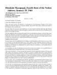 Diosdado Macapagal, Fourth State of the Nation Address, January 25, 1965 “The Philippines After Three Years (1962-1965)” Message to Congress President Diosdado Macapagal On the State of the Nation [January 25, 1965] Mr. Senate President, Mr. Speaker, Ladies and Gentlemen of Congress: Three years ago, on this very platform, we presented the Socio-Economic Program of the Nation designed to secure the objective of economic stability and growth of the country and the alleviations of the condition of the common man. We were filled with conviction and enthusiasm; we were inspired with the bright hope that with the attainment of those objectives, national prosperity would be achieved and the level of livelihood of the masses of our people elevated. The same optimism and conviction still inspire us as we look back in retrospect at the last three years. Despite the difficulties and odds that confronted us in the task of moving toward our desired goals, we submit that we have been able to accomplish tangible results in carrying out the fight against poverty by effectively laying the basis of future growth and progress in freedom. FILIPINO WAY OF LIFE We must begin with the fundamental act of casting a scrutinizing glance at the state of our way of life. It has become a truism that the Filipino way of life consists of three minimum elements, namely, the system of freedom, the love for peace and the sustenance of the rule of law. As long as these essential ingredients of Filipinism are safeguarded, the country, whatever its problems, is safe and the future of our posterity is secure. As we perform our duty of rendering an account of our trust to our people, we are gratified that we have strengthened these fundamental tenets of our national life and destiny. The system of freedom—we have restored free enterprise. We have upheld the freedom of the press and other media to the tolerance of license. We believe so firmly in freedom that given a choice between licentious freedom and restricted freedom, we have by deeds preferred license to restriction because of our conviction that in an aspiring democracy in Afro-Asia, licentious freedom is better than restricted freedom because freedom has the inherent virtue of restraining its excesses but restriction bears the danger of curtailment which may lead to tyranny and despotism. Love for peace—this is exemplified in the doctrine sanctified in our Constitution which renounces war as an instrument of national policy. We have served the cause of peace in our land by capturing Jesus Lava, the top head and brain of the communists who seek to overthrow our peace and freedom. Not only have we maintained peace and tranquility among ourselves but we have also been fortunate to be saved from the international turmoil that has beset our immediate neighbors like Vietnam, Laos, Malaysia, Cambodia, Indonesia, Thailand, Korea, Free China and India. We attribute this to our policy of firm opposition to international communism, aggression, subversion and infiltration in our country and to our security alliance with the United States and other free nations. The rule of law—we all feel gratified that our people will not accept any system other than the rule of law which assures justice to the humblest citizen vis a viz the most powerful in the land. All have contributed to the impregnability of the rule of law in our society but we believe that the outstanding credit for this stability in our democratic institutions belongs to the Supreme Court under the leadership of Chief of Justice Cesar Bengzon all of whose members have upheld with zeal the inviolability of the rule of law in our free society. Satisfied that we have bolstered the preservation of our free society, which is of overriding importance, we shall now review the results of our efforts in the last three years in the light of the goals that we have set and the conditions under which we were constrained to attain those goals for our people, deduce there from what remains to be done and draw a picture of the outlook for the future. Free Enterprise and Nationalism The things done which we shall speak of are the cumulative significance of the past three years. They were not the logical results of an economy allowed to maintain its sedentary pace in the mainstream of the status quo. Radical changes had to be introduced into the economic structure of the country. Drastic reforms in administration had to be undertaken, and tremendous efforts had to be exerted to provide the social services demanded by an expanding population in the face of inadequate resources. The national objectives we defined had to confront, in their implementation, the reality of a situation the terms of which were not merely issues of the national condition but of the surrounding actuality of ourselves as a sovereign nation. We formulated those objectives at a time when the Philippine Republic had to exercise larger responsibilities within the Southeast Asian area as well as in the emergent community of the Afro-Asian continent. It was for this reason that the most basic and fundamental change which was instituted by the Administration was to release the innate power of our people for progress by liberating the economy from controls and thus enabling our citizens to assume the major responsibility for national development. The controlling idea of the Nation’s program of free enterprise that we launched was nationalism, and the goal of that nationalism was economic prosperity and enlarged freedom for the masses of the Filipino people. ESTABLISHING THE BASE FOR SOCIO-ECONOMIC GROWTH We shall now list the main results of our efforts on the progress of this program fro the people which we shall number one (1) to (109). The problem of restoring economic stability must inevitably lead to the necessity of creating an assured base for dynamic national growth. Production 1) In this connection, agricultural production rose by 4.8 per cent during cr