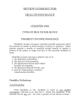 REVIEW SUMMARY FOR HEALTH INSURANCE CHAPTER ONE TYPES OF HEALTH INSURANCE DISABILITY INCOME INSURANCE Disability income insurance provides periodic payments when the insured is unable to work because of injury or sickness. These policies provide a weekly or monthly income benefit to replace a portion of the salary or wages lost due to the insured's inability to work. Disability income insurance policies vary as to: 1. the definition of disability, 2. the amount of the payment, 3. the Elimination Period (time before benefits are payable), 4. the Maximum Benefit Period, and 5. and the relationship to workers compensation benefits. Disability Definitions Total Disability Total disability is the "inability to work at any gainful occupation” (referred to as “Any Occ”). Under this definition, if the insured can do any job - for even a portion of his former income 1 the insured is not considered totally disabled. Total disability is the "inability to perform the duties of any occupation for which he is reasonably suited by education, training, or experience.” Another definition is "inability to perform all of the substantial and material duties of his regular occupation.” (Referred to generally as “His Occ”) Partial Disability Contracts may provide partial disability benefits, particularly in the case of disability caused by accident. Policies may provide benefits for residual disabilities. A residual disability benefit provides benefits for loss of earnings after a return to work from total disability, if the insured cannot earn as much as he did prior to the disability. Amount of Benefits The amount of the weekly or monthly payment applied for is usually based on the insured's earnings and is usually limited to a percentage of the insured's earned income. The benefits may be capped (such as: 75% of stated annual income, with a maximum monthly benefit of $5,000). Elimination Period The Elimination Period is the period of time immediately after the onset of the disability measured in time (usually days) during which benefits are not payable. Maximum Benefit Period The Maximum Benefit Period is the length of time disability benefits will be paid under the contract and can range from six months to lifetime (if disability is caused by accident). 2 SPECIAL FORMS OF DISABILITY INCOME INSURANCE Disability Income Insurance Under Life Policies Disability income insurance may be offered as a rider to a life insurance policy that provides for a monthly indemnity in the event of total disability before a certain age. Business Overhead Expense Benefits Business Overhead Expense insurance provides funds to pay certain expenses required for the operation of a business or professional office for a specified period of time when the insured owner is totally disabled. Key Employee Disability Insurance Key Employee coverage pays a monthly benefit to a business for the purpose of hiring and training additional help or services, when a Key Employee is disabled. Accidental Death and Dismemberment Accidental Death policies provide a death benefit which is payable in the event of death resulting from accidental bodily injury. An Accidental Death and Dismemberment policy also provides benefits for loss of limbs or sight (dismemberment coverage). MEDICAL EXPENSE INSURANCE Medical expense insurance provides benefit payments for medical care. The providing of benefits may be by: 1. reimbursement to the policyholders for medical expenses incurred, 2. paying those who provide the services directly, 3 3. paying a set amount regardless of the amount charged for medical expenses. (This is referred to as an “Indemnity policy”). A policy may cover an individual, his or her spouse and children. The categories generally accepted, for Medical Expense Insurance, are 1. basic medical expense insurance, 2. major medical insurance, 3. comprehensive medical insurance and 4. special policies. Basic Medical Expense Policies Basic coverages provided by an individual medical expense policy include basic hospital expense, basic surgical expense, and basic medical expense. Basic hospital expense coverage provides benefits for daily hospital room and board and miscellaneous hospital expenses while the insured person is confined to a hospital. Basic surgical expense coverage provides benefits for the surgical services of a physician performed in or out of the hospital. Basic medical expense policies may also include nursing care coverage, which provides payment for private duty nursing care by order of a doctor while the insured is in the hospital. In addition, maternity expenses and or indemnity payment may be offered with some plans. Major Medical Insurance Major medical insurance provides benefits for serious or prolonged injury or illness. These policies may be written to complement basic medical expense policies. 4 Deductibles are a necessary function of the Major Medical policy, which keeps the cost of insurance down because of the elimination of small claims whose expenses to administer frequently exceed the claims payment. The deductible may apply to each accident or illness, or to each calendar year, and to each covered person. Most policies have a coinsurance provision. A coinsurance provision provides for the sharing of medical costs after the deductible has been met (satisfied), generally up to a maximum, at which point the insurer pays 100% of medical costs. Comprehensive Medical Insurance The popularity of Comprehensive Medical insurance has been replaced by Major Medical plans, as Major Medical insurance has become “comprehensive” and so competitive in price, that the original Comprehensive medical insurance concept is not often used. Comprehensive Medical Insurance in this context, is a combination of basic medical expense coverage and major medical coverage. Special Medical Expense Insurance Policies Specified Disease or Dread Disease insurance which provides a variety of benefits for only certain (specifi
