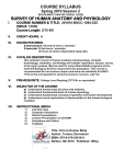COURSE SYLLABUS Spring 2010 Session 2 201010-BSCC-1084-23Z (CRN #: 13538) SURVEY OF HUMAN ANATOMY AND PHYSIOLOGY I. COURSE NUMBER & TITLE: 201010-BSCC-1084-23Z CRN #: 13538 Course Length: 2/15-5/8 II. CREDIT HOURS: 4 III. HOURS PER WEEK: IV. CATALOG DESCRIPTION: V. PRE-REQUISITE: College Level Reading (CPT 83+ or equivalent) VI. OBJECTIVE OF THE COURSE: VII. INSTRUCTIONAL MEDIA: 3 hours lecture: 45 lecture hours / semester 2 hours lab: 30 lab hours / semester 30 hours of online independent study labs One semester course of human anatomy and physiology. Includes terminology; chemistry; cell biology and cellular respiration; tissues; survey of all organ systems. May be used for some Allied Health programs and to meet the Biological Science requirement for graduation. This course is recommended for non-science majors and does not substitute for BSCC 1010 as the prerequisite for advanced science courses. Lab Fee. a) Understand human body structure and anatomy. b) Understand fundamental basis of human physiology. c) Understand fundamental concepts of genetics and human development. d) Understand social implications of abnormalities in the human biological condition. 1) 2) 3) 4) 5) 6) Lab Exercises Computer Simulations Online Presentations Lecture Presentation on CD ROM Animations and Videos Textbook Title: Intro to Human Body Author: Tortora, Derrickson ISBN: 978-0-470-23016-9 Edition: 8th 2010 Publisher: Wiley VIII. SPECIFIC COURSE REQUIREMENTS: In order to complete this course the student will complete all lab exercises, all lab practicals, all unit exams, all quizzes and all summary papers. Keeping up with CD ROM lectures as well as performing required readings and internet quizzes is mandatory. Material which is handed in late will be eligible to receive partial credit. All required work must be received by the last day of classes. No work will be accepted after this date. IX. GRADING PROCEDURE: 4 8 8 10 2 8 Unit Exams Quizzes Summary Papers Lab Reports Lab Practicals Discussion Entries 90-100 81-89 73-80 66-72 Below 66 A B C D F 4 8 8 10 2 8 X X X X X X 100 7 11 14 38 5 Total = 400 = 56 = 88 = 140 = 76 = 40 = 800 720 Points 648 Points 584 Points 528 Points *Proctored Unit Exams (100 points each) Exams will be made available at your proctor location. You will need to set up an appointment to perform the exam with your proctor. In order to take the exam you will be provided a “password” by your proctor. You will find the exams in the UNIT EXAMS link in ANGEL. *Online Quizzes (7 Points each) There are 8 online quizzes (2 for each unit) which will be performed online. Access to the quizzes is provided on the ANGEL SURVEY OF HUMAN ANATOMY & PHYSIOLOGY home page. *Summary Papers (11 Points each) Two summary papers will be required for each of the 4 Units during the course of the class. The summary paper topics and criteria can be found by following the links from the SUMMARY PAPERS INDEX from the SURVEY OF HUMAN ANATOMY & PHYSIOLOGY home page. *Lab Reports (14 Points each) Each of the 10 labs will require a lab report to be submitted. You can find criteria and directions for writing your lab report on the LAB INDEX link on the SURVEY OF HUMAN ANATOMY & PHYSIOLOGY home page. *Lab Practical (38 Points each) There will be 2 lab practicals which are basically exams which will test your knowledge of the completed labs. These will be taken and submitted online. The Lab Practicals are available from the ANGEL SURVEY OF HUMAN ANATOMY & PHYSIOLOGY home page. *Discussion Entries (5 Points each) There will be two discussion questions for each unit. The discussion will require that you supply at least one entry to the discussion questions presented by the instructor and one response to another students entry. The discussion questions are on the ANGEL system and so you will need to access the discussion questions by logging on to ANGEL. You can then link to the DISCUSSION BOARD. The discussion entries will be graded on the depth and amount of information entered on the discussion board. Each discussion question can be worth up to 5 points. *Extra credit: Topic Paper (80 points) Topic paper involving the scientific field of Human Anatomy or Human Physiology. You must follow the directions and the paper requirements listed below. The paper will be due the same date as the last exam is due for the course. Paper requirements: A) B) C) D) E) Title page Bibliography or works cited page 5 typed pages in the body of the paper *font size no larger than 12 *1 ½ spaces *margins on top, sides and bottom no more than ¾ inch *a total of 7 pages in the report A minimum of 3 sources *at least 1 of the sources must be from the Internet *at least 2 of the sources cannot be from the internet Topic approved by instructor *Work handed in Late and Incompletes Exams, lab reports, quizzes, summary papers, Lab Practicals and any other work handed in later than the dates listed will be considered late. Date of submission will be determined by the time stamp on the assignment if submitted on line or by email attachment. Assignments submitted by US mail will be considered to have a submission date as given by the Postmark on the envelope. Due dates are listed for assignments in the SYLLABUS and on the ASSIGNMENT SHEET. Of course assignments can be submitted before the due dates listed. Guidelines will be posted to keep you on track for the assignments. Exams must be completed during the window of time specified. There is no make-up work. If you are not able to finish the course in the prescribed time you will need to fill out the REQUEST FOR INCOMPLETE form which you can access from the SURVEY OF HUMAN ANATOMY & PHYSIOLOGY HOME PAGE. An incomplete is normally given under special circumstances only. If you need more time to finish the course because of events that have occurred to you which you could not control, then submitting a request for incomplete may be an option for you. A submission of this form does not substitute for 