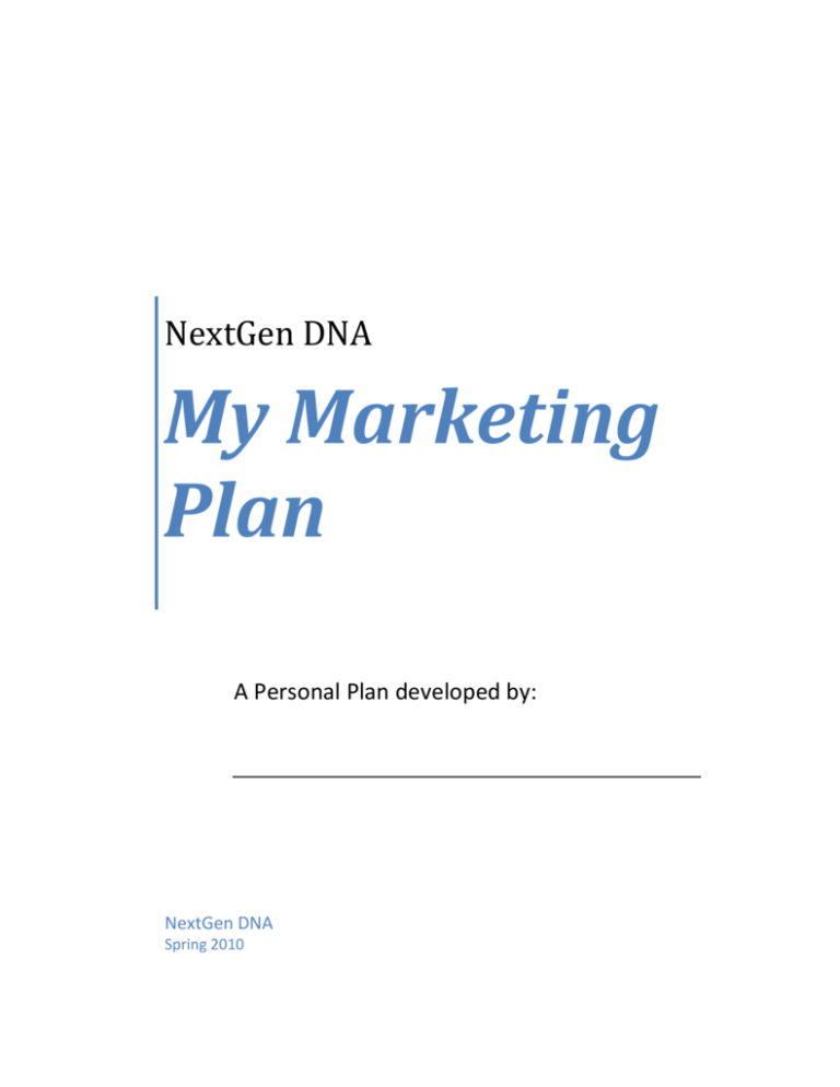 NextGen DNA My Marketing Plan A Personal Plan developed by: NextGen DNA Spring 2010 Table of Contents Introduction…....…………………………………………………………………………………………………..4 Chapter 1 – My Marketing Plan My Proposition..…………………………………………………………………………………………………..5 My Positioning Statement My Core Competencies My S.W.O.T Analysis…………………………………………………………………………………………….6 My Strengths My Weaknesses My Opportunities (in my career field) My Threats (in my career field) My Career Goals…………………………………………………………………………….……………………8 My Goals My Goal Timeline My Preferences……………………………………………………………………………………………………9 My Likes My Dislikes MyIdeal Employer………………………………………………………………………………………………10 My Geographic Preference My Industry Preference My Ideal Organization Size My Ideal Organizational Culture My Job Scorecard………………………………………………………………………………………………11 My Development Plan……………………………………………………………………….………………12 Chapter 2 – My Road Map My Action Plan…….………………………………………………………………………………………..…..13 My Target Companies…………………………………………………………………………………………14 My Network……………….…………………………………………………………………………………..….15 Chapter 3 – My Commitment My Commitment Sheet……..……………………………………………………………………………….16 My Activities Scorecard………………………………………………………………………………………17 Appendix My Resources…....…………………………………………………………………………………………….18 My Extra Worksheets.………………………………………………………………………..………………24 My Job Scorecard My Development Plan My Action Plan My Target Companies My Network My Commitment Sheet My Activity Scorecard Introduction This document was created to help you to develop a detailed plan for your job search. Whether you are a hourly or salary worker, recent college graduate, returning to the work force, currently employed or under-employed (working but not in your ideal position), if you are considering a job search it is best completed with a plan. Looking for a job requires a plan. One cannot just wake up in the morning and start looking for work. Where do you look? What do you want to do? What type of company do you want to work for? What skills are required and are there any new skills I must learn? Who do you know that might be able to help you? This document should help you in your journey. It will not provide you all the answers, but it will help you to develop your road map to finding that next step in your career. Remember to take time to plan. Take time to reflect on what you have done. When this document is completed use to aid you in your search. Additionally, share this document with friends, family and others that may be able to assist you during search. Chapter 1 – My Marketing Plan My Value-Proposition My Positioning Statement Describe who you are and the how you want to be perceived in the market based upon your skills, competencies, and experiences. Approach this in the manner of only having thirty seconds with someone how would you quickly describe yourself, why should they want to hear more about you? My Core Competencies Describe your skills and competencies that will help to see you apart from anyone else. In other words, what do you bring to the table or their organization? Chapter 1 – My Marketing Plan My S.W.O.T. Analysis Internal My Strengths Describe what makes you successful, technical abilities, etc. If you were to ask one of your peers what would they say? My Weaknesses Describe areas that you are not as strong. Perhaps these are areas you don’t want as requirements in a new role based on your personal preferences and values. If they are areas you wish to improve, consider how this can occur. Chapter 1 – My Marketing Plan My S.W.O.T. Analysis External My Opportunities within my Field What is going for you right now? Who have you networked with? What positive trends do you see in your industry? How can your skills, interests and experiences be leveraged? Be creative and be confident! My Threats within my field What challenges exist for you in your desired field(s)? How can you overcome these? What solutions are possible? Don’t get buried in the threats. Consider whether these are temporary or long-term. Chapter 1 – My Marketing Plan My Career Goals My Goals Describe key goals you have during your career journey. • Examples might be to reach a certain level position in next three years, complete education, earn a certain amount of money annually, etc My Goals Timeline The goals you have set for yourself should be what you hope you can accomplish in these periods. . For instance if you are out of work it may be more important for you to get a job that helps to pay the bills now and then look for a more senior position in the 2-3 years Next 6 Months Months 6-12 Years 2-3 Years 3-5 Chapter 1 – My Marketing Plan My Preferences My Likes Describe those things that are important to you in the job you perform Examples might be you like to manage people, enjoy travelling, hands-on job, project management, working as part of a team working outside, working with customers, etc My Di