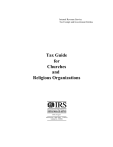 Internal Revenue Service Tax Exempt and Government Entities Tax Guide for Churches and Religious Organizations www.irs.gov Publ ic ati on 1828 (R ev. 7 -2002) Catalog No. 21096G Congress has enacted special tax laws applicable to churches, religious organizations and ministers in recognition of their unique status in American society and of their rights guaranteed by the First Amendment of the Constitution of the United States. Churches and religious organizations are generally exempt from income tax and receive other favorable treatment under the tax law; however, certain income of a church or religious organization may be subject to tax, such as income from an unrelated business. It is also important for a church or religious organization to understand the tax law to avoid losing its tax-exempt status by engaging in activity that violates the Internal Revenue Code (IRC). The Internal Revenue Service (IRS) offers this quick reference guide of Federal tax law and procedures for churches and religious organizations to help them voluntarily comply with tax rules. The contents of this publication reflect the IRS’s interpretation of tax laws enacted by Congress, Treasury regulations, and court decisions. The information given is not comprehensive, however, and does not cover every situation. Thus, it is not intended to replace the law or be the sole source of information. The resolution of any particular issue may depend on the specific facts and circumstances of a given taxpayer. In addition, this publication covers subjects on which a court may have made a decision more favorable to taxpayers than the interpretation by the IRS. Until these differing interpretations are resolved by higher court decisions, or in some other way, this publication will present the interpretation of the IRS. For more detailed tax information, the IRS has assistance programs and tax information products for churches and religious organizations, as noted in the back of this publication. Most IRS publications and forms can be downloaded from the IRS Web site at www.irs.gov, or ordered by calling toll-free (800) 829-3676. Specialized information can be accessed through the Exempt Organizations Web site under the IRS Tax Exempt and Government Entities division via www.irs.gov/eo or by calling toll-free (877) 829-5500. The IRS considers this publication a living document, one that will be revised to take into account future developments and feedback. Comments on the publication may be submitted to the IRS at the following address: Internal Revenue Service 1 1 1 1 Constitution Avenue, NW Washington, DC 20224 Attn: T:EO:CE&O Contents TAX EXEMPT STATUS ........................................................................................................................................ 2 Recognition of Tax-Exempt Status Applying for Tax-Exempt Status Public Listing of Tax-Exempt Organizations JEOPARDIZING TAX-EXEMPT STATUS.......................................................................................................... 4 Inurement and Private Benefit Substantial Lobbying Activity Political Campaign Activity UNRELATED BUSINESS INCOME TAX (UBIT)......................................................................... 12 Examples of Unrelated Trade or Business Tax on Income Producing Activities EMPLOYMENT TAX ...........................................................................................................................................14 SPECIAL RULES FOR COMPENSATION OF MINISTERS............................................................................15 Withholding Income Tax for Ministers Parsonage or Housing Allowances FICA Taxes vs. SECA Tax PAYMENT OF EMPLOYEE BUSINESS EXPENSES .......................................................................................16 RECORDKEEPING REQUIREMENTS..............................................................................................................17 FILING REQUIREMENTS ..................................................................................................................................18 CHARITABLE CONTRIBUTIONS — SUBSTANTIATION AND DISCLOSURE RULES............................20 Substantiation Rules Disclosure Rules That Apply to Quid Pro Quo Contributions Exception to Disclosure Statement SPECIAL RULES LIMITING IRS AUTHORITY TO AUDIT A CHURCH..................................................22 Audit Process GLOSSARY ...........................................................................................................................................................24 HELP FROM IRS . . . . . . . . . . . . . . . . . . . . . . . . . . . . . . . . . . . . . . . . . . . . . . . . . . . . . . . . . . . . . . . . . . . . 25 This publication explains the benefits and the responsibilities under the Federal tax system for churches and religious organizations. The term church is found, but not specifically defined, in the Internal Revenue Code (IRC). The term is not used by all faiths; however, in an attempt to make this publication easy to read, we use it in its generic sense as a place of worship including, for example, mosques and synagogues. With the exception of the special rules for church audits, the use of the term church throughout this publication also includes conventions and associations of churches as well as integrated auxiliaries of a church. Because special tax rules apply to churches, it is important to distinguish churches from other religious organizations. Therefore, when this publication uses the term “religious organizations,” it is not referring to churches or integrated auxiliaries. Religious organizations that are not churches typically include nondenominational ministries, interdenominational and ecumenical organizations and other entities whose principal purpose is the study or advancement of religion. Churches and religious organizations may be legally organized in a variety of ways under state law, in