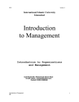IIUI Lecture -1 International Islamic University Islamabad Introduction to Management Introduction to Organizations and Management Contributed By: Muhammad Adnan Khan E.mail: adnan_comsats@yahoo.com Contact: 0300-9568964 Introduction to Management IIU 1 IIUI Lecture -1 Lecture Out line Introduction Who Are Managers? What Is Management? What Do Managers Do? Management Functions and Processes Management Roles Interpersonal Roles Informational Roles Decisional Roles Management Skills Technical Skills Human Skills Conceptual Skills Managing Systems Managing in Different and Changing Situations What Is an Organization? Why Study Management? The Universality of Management The Reality of Work Rewards and Challenges of Being a Manager Introduction to Management IIU 2 IIUI 1. Lecture -1 INTRODUCTION. The concept of management and managers is introduced in this chapter. Five questions are addressed: A. Who are managers? B. What is management? C. What do managers do? D. What is an organization, and how is the concept of an organization changing? E. Why study management? 2. WHO ARE MANAGERS? A. The changing nature of organizations and work has blurred the clear lines of distinction between managers and nonmanagerial employees. Many workers’ jobs now include managerial activities. Definitions used in the past no longer work. B. How do we define a manager? A manager is an organizational member who works with and through other people by coordinating their work activities in order to accomplish organizational goals. However, keep in mind that managers may have other work duties not related to integrating the work of others. C. Managers can be classified by their level in the organization, particularly for traditionally structured organizations (those shaped like a pyramid). 1. 2. 3. 3. First-line managers are the lowest level of management. They’re often called supervisors. Middle managers include all levels of management between the first-line level and the top level of the organization. Top managers include managers at or near the top of the organization who are responsible for making organizationwide decisions and establishing the plans and goals that affect the entire organization. WHAT IS MANAGEMENT? A. Management refers to the process of coordinating and integrating work activities so that they’re completed efficiently and effectively with and through other people. 1. 2. 3. The process refers to the ongoing functions or primary activities engaged in by managers. Coordinating others’ work activities is what distinguishes a manager’s job from a nonmanagerial one. Efficiency is getting the most output from the least amount of inputs, the goal of which is to minimize resource costs. Introduction to Management IIU 3 IIUI Lecture -1 4. Effectiveness is completing activities so that organizational goals are attained; often described as “doing the right things.” 5. Optimization of resources is alos called management. 4. WHAT DO MANAGERS DO? No two managers’ jobs are alike. But management writers and researchers have developed some specific categorization schemes to describe what managers do. We’re going to look at five categorization schemes: functions and processes, roles, skills, managing systems, and situational analysis. A. Management Functions and Processes. Henri Fayol, a French industrialist from the early part of the 1900s, proposed that managers perform five management functions: POCCC (plan, organize, command, coordinate, control). 1. These functions still provide the basis around which popular management textbooks are organized, but the functions have been condensed to four. a. b. c. d. 2. 3. B. Planning involves the process of defining goals, establishing strategies for achieving those goals, and developing plans to integrate and coordinate activities. Organizing is the process of determining what tasks are to be done, who is to do them, how the tasks are to be grouped, who reports to whom, and where decisions are to be made. Leading includes motivating subordinates, influencing individuals or teams as they work, selecting the most effective communication channel, or dealing in any way with employee behavior issues. Controlling is monitoring activities to ensure that they are being accomplished, comparing performance with previously set goals, and correcting any significant deviations. The reality of managing isn’t quite as simplistic as these descriptions imply. It’s more realistic to describe managers’ functions from the perspective of a process. The management process is the set of ongoing decisions and work activities in which managers engage as they plan, organize, lead, and control. Management Roles. In the late 1960s, Henry Mintzberg conducted a precise study of managers at work. He concluded that managers perform 10 different, but highly interrelated roles. 1. Management roles refer to specific categories of managerial behavior. a. b. c. Introduction to Management IIU Interpersonal roles included figurehead, leadership, and liaison activities. Informational roles included monitoring, disseminating, and spokesperson activities. Decisional roles included those of entrepreneur, disturbance handler, resource allocator, and negotiator. 4 IIUI Lecture -1 2. 3. C. Follow-up studies of Mintzberg’s role categories in different types of organizations and at different managerial levels within organizations have generally supported the notion that managers perform similar roles. However, the more traditional functions have not been invalidated. In fact, the functional approach still represents the most useful way of classifying the manager’s job. Management Skills. Managers need certain skills to perform the varied duties and activities associated with being a manager. 1. Robert L. Katz found through his research in the early 1970s that managers need three essential skills or competencies. a. Technical skills are skills that include knowledge of and proficiency in a cer