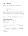 Layer 3 - Exercises All participants will work within their groups in pairs. Each group has three routers and three switches to work with. The lab is divided into four components: 1. Basic Router Configuration 2. Static Routing 3. Dynamic routing with OSPF 4. iBGP 5. eBGP There is a certain dependency between the labs as the exercises progress. Make sure to maintain your configuration unless otherwise instructed. All exercises will use a common IP addressing scheme and network topology. Given the limited number of interfaces we will be using VLAN interfaces to facilitate the exercise and the different features we will be using. As you go through the exercises all the examples are given from the point of view of R11, the border router in group 1. Make sure that you take the examples and adapt them to your own router, network topology and addressing scheme. Address Space Allocation Group Group Group Group Group 1: 2: 3: 4: 5: 10.10.0.0/16 10.20.0.0/16 10.30.0.0/16 10.40.0.0/16 10.50.0.0/16 ASN: ASN: ASN: ASN: ASN: 10 20 30 40 50 Each group will then further partition their space: 10.X0.1.0/24 FEC0:X0:1:1::/64 10.X0.64.0/24 FEC0:X0:2:64::/64 (VLAN 64) 10.X0.65.0/24 FEC0:X0:3:65::/64 (VLAN 65) 10.X0.128.0/24 FEC0:X0:4:128::/64 (VLAN 128) 10.X0.129.0/24 FEC0:X0:4:129::/64 (VLAN 129) 10.X0.254.0/24 FEC0:X0:0:FE::/64 Loopback Subnet - Core Network - Access Subnet - Access Subnet - Access Subnet - Access Subnet - Router 1 10.254.X0.0/30 FEC0:FE:0:X0::/64 – Connection to ISP 10.255.0.X0/24 FEC0:FF::X0/64 – Connection to IXP 10.254.X0.0/30 – Connection to ISP 10.255.0.X0/24 – Connection to IXP With X being your group number (1,2,3,4,5) All equipment in the remote lab will be managed via their console ports. Access to the consoles is available via secure shell (ssh). Use the topology and device/console name reference in page X to identify your devices and ssh to console server nsrclab-console1-gw.uoregon.edu (128.223.11.137) with user nsrc:<device>. For example: ssh nsrc:router3@nsrclab-console1-gw.uoregon.edu 2 LAB TOPOLOGY 3 Network Topology 4 Network Topology Details 5 Alternate Network Topology 1 6 Alternate Network Topology 2 7 DEVICE/CONSOLE NAMES REFERENCE 8 Basic Router Configuration 1. Name the router. Router> enable Router# config terminal Enter configuration commands, one per line. Router(config)# hostname R11 R11(config)# End with CNTL/Z. 2. Deactivate domain name resolution. R11 (config)# no ip domain-lookup 3. Create a username and password. R11 (config(# username walc secret nsrc R11 (config)# enable secret nsrc R11 (config)# service password-encryption 4. Activate remote login access to the router R11 (config)# aaa new-model R11 (config)# aaa authentication login default local R11 (config)# aaa authentication enable default enable 5. Make sure that you configure your console and vtys R11 R11 R11 R11 (config)# (config)# (config)# (config)# line con 0 login authentication default line vty 0 4 login authentication default 6. Make sure the router understands CIDR R11 (config)# ip subnet-zero R11 (config)# ip classless 7. Activate IPv6 routing. R11 (config)# ipv6 unicast-routing 8. Save the configuration and checkpoint. 9 R11(config)#^Z R11# write memory Building configuration... [OK] R11# 9. Configure your interfaces. R11(config)# interface FastEthernet0/1 R11(config-if)# ip address 10.10.1.1 255.255.255.0 R11(config-if)# description Link to Core R11(config-if)# ipv6 enable R11(config-if)# ipv6 address FEC0:10:1:1::1/64 R11(config-if)# no ip redirects R11(config-if)# no ip directed-broadcast R11(config-if)# no ip proxy-arp R11(config-if)# no shutdown R11(config)#^Z R11# Or from the point of view of R12 & R13 where you will use VLANs R12(config)# interface FastEthernet0/1 R12(config)# no ip address R12(config)# no shutdown R12(config)# interface FastEthernet0/1.64 R12(config-subif)# encapsulation dot1Q 64 R12(config-subif)# ip address 10.10.64.2 255.255.255.0 R12(config-subif)# description Link VLAN 64 R12(config-subif)# ipv6 enable R12(config-subif)# ipv6 address FEC0:10:2:64::2/64 R12(config-subif)# no ip redirects R12(config-subif)# no ip directed-broadcast R12(config-subif)# no ip proxy-arp R12(config-subif)# no shutdown R12(config-subif)#^Z R12# R13(config)# interface FastEthernet0/1 R13(config)# no ip address R13(config)# no shutdown R13(config)# interface FastEthernet0/1.64 R13(config-subif)# encapsulation dot1Q 64 R13(config-subif)# ip address 10.10.64.3 255.255.255.0 R13(config-subif)# description Link VLAN 64 R13(config-subif)# ipv6 enable R13(config-subif)# ipv6 address FEC0:10:2:64::3/64 R13(config-subif)# no ip redirects R13(config-subif)# no ip directed-broadcast R13(config-subif)# no ip proxy-arp R13(config-subif)# no shutdown R13(config-subif)#^Z 10 R13# 10. Do some ping tests. R11# ping 10.10.2.2 and then very the output of the following commands IPv4: show arp show interface <int> <number> show ip interface : Shows ARP cache : Shows interface state and configuration : Shows interface IP state and config IPv6: show ipv6 neighbors show ipv6 interface <int> <number> show ipv6 interface 11. : Shows IPv6 neighbors : Shows interface state and configuration : Shows interface state and configuration Create loopback interface. R11(config)#interface loopback 0 R11(config-if)#ip address 10.10.254.1 255.255.255.255 R11(config-if)#ipv6 address FEC0:10:0:FE::1/128 R11(config-if)#^Z R11# 12. Save the configuration and checkpoint. R11# write memory Building configuration... [OK] R11# 11 Static Routing 1. Try pinging some of the addresses with your AS. R11# R11# R11# R11# R11# R11# R11# R11# ping ping ping ping ping ping ping ping 10.10.1.1 10.10.1.2 10.10.1.3 10.10.254.1 10.10.254.2 10.10.254.3 10.10.64.2 10.10.64.3 R11# R11# R11# R11# R11# R11# R11# R11# ping ping ping ping ping ping ping ping ipv6 ipv6 ipv6 ipv6 ipv6 ipv6 ipv6 ipv6 FEC0:10:1:1::1 FEC0:10:1:1::2 FEC0:10:1:1::3 FEC0:10:0:FE::1 FEC0:10:0:FE::2 FEC0:10:0:FE::3 FEC0:10:2:64::2 FEC0:10:2:64::3 2. What is happening?