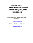 SPRING 2012 MERIT BADGE MADNESS MARCH 30-April 1, 2012 HANDBOOK 4/R Merit Badge Madness Chairman - Butch LaWall 410-636-6154 lawall3@cablespeed.com 4/R Registrar - Mike Norris - 410-355-5006 mikenorris@verizon.net SPRING 2012 MERIT BADGE MADNESS MARCH 30-APRIL 1, 2012, SULINS FARM, SEVERN, MD SCHEDULE OF EVENTS FRIDAY, MARCH 30, 2012 1700-2000 Check-in and final registration 2100 Staff, SMs AND SPLs - meeting in the QM Tent SATURDAY, MARCH 31, 2012 0630 Reveille 0630 Troop breakfast in their campsite --//-- MBM Staff - QM Tent 0700 Final Registration 0730 Opening Ceremony – Weather Permitting 0800 Classes Begin 1200 Lunch (Camp sites for Troops. QM tent for Staff) 1300 Afternoon classes begin 1800 Classes end - Troop supper in their campsite - MBM Staff QM Tent 1915 Vespers 1930 Campfire Program Order of the Arrow Call Out 2100 Cracker Barrel for all SUNDAY, APRIL 1, 2012 0630 Reveille 0630 Troop breakfast in their campsites Staff QM Tents 0730-1100 finish up classes 1130 Closing Ceremony SPRING 2012 MERIT BADGE MADNESS MARCH 30-APRIL 1, 2012 Annapolis Area Christian School General Guidelines and information 1. The Scout Law and Oath are the words of the day. 2. The Class A uniform is the uniform of the day for all Scouts. 3. Troops must bring their own camping gear. Campsites will be assigned upon arrival unless prior arrangements have been made. No ground fires. 12 inches above ground only. Bring water with you. 4. Scouts must bring blue card signed by Scoutmaster. Both side of card filled out. HAVE MERIT BADGE – TROOP – NAME FILLED IN. 5. Scouts must have pencil and paper for all classes. 6. Scouts must bring a merit badge book and must have read it before class. 7. Scouts must complete any pre-requisites prior to class to earn merit badge. Scout not completing requirements will receive partial credit for their efforts. 8. Scout should bring a camp stool or chair for outside classes. 9. Some activities and classes are outside. Be aware of the weather forecast. Temperature could be in the 40’s – maybe snow. Bring appropriate gear. 10. Quartermaster will provide a Cracker Barrel after campfire. 11. Quartermaster will serve the staff all meals Saturday and Breakfast on Sunday. 12. Trading Post will be in the 4R Trailer. Hours will be posted. 13. The OA will be on site to conduct call outs. 14. Brotherhood Ceremony will be conducted. 15. Scoutmaster – check with OA Representative sometime during the day on Saturday to let him know who is in camp that should be called out. Brotherhood conversions will also be done. 16. One Adult Leader will be needed from each Troop for hall monitoring and safety of school and camp grounds on Saturday and Sunday. 17. Senior Patrol Leader - turn in skit or song for campfire to Karen Scheel. 18. No packets will be given out until all classes are completed. Scoutmaster or his Rep is to sign for blue cards and patches. SPRING 2012 MERIT BADGE MADNESS MARCH 30-APRIL 1, 2012 Annapolis Area Christian School EVENT STAFF REGISTRATION FORM (Please print neatly or use you computer) Name: ________________________Phone: ________________________ Address: _____________________________________________________ E-mail: _______________________________________________________ I am registering to support this event as a: ___Staff Member ___check here if you are under 18 years old Please indicate how you would like to help: ___ On-site Registration/HQ Staff ___ Quartermaster (kitchen) Staff ___ Physical Arrangements Staff ___ Health and Safety Staff ___ Parking/Campsite Guide/Security Staff ___ Any help the District needs ___ Individual Merit Badge Counselor (Badge ______________) ___ Team Merit Badge Counselor (Badge _____________) (Lead Counselor: _____________________) NOTE: All Merit Badge Counselors must be age 18 and above and formally registered as a “Code 42” (Merit Badge Counselor) through the Boy Scouts of America. Classes will be limited to 20 Scouts each. Experience in teaching in a group setting is desirable. You will be responsible for providing all your own class materials. ___ I have BSA Youth Protection cert ___ I have an Amateur or GMRS Radio License Logistics Support Requirements (indicate as appropriate): Merit Badge support: ___ I will need an indoor classroom ___ I will need access to electricity ___ Other support requirement (specify): ________________________________________ Camping: ___ I will support the Event Staff but cannot camp overnight ___ I will camp with my home troop (Troop Nr _______________) ___ I am prepared to camp in my own tent in the designated Staff Area Meals: I would like to be fed by the Staff Quartermaster for the following meals (check appropriate): ___ Saturday breakfast ___Saturday Lunch ___Saturday Dinner ___Sunday breakfast ___ALL meals ___ Cracker Barrel Saturday night ___ I have the following dietary restrictions: _____________________________________ ___ I will take all meals with my home troop ___ Special needs: I have a handicap or special medical requirement to discuss with the Health & Safety Officer For further event information, please call or e-mail: Butch LaWall MBM Event Chairman 410-636-6154 lawall3@cablespeed.com **** Staff is $3.00 per meal **** To register as a Staff Member, complete this form and pay at Roundtable or send a check (made out to BSA/BAC) to: Mike Norris, District Registrar mikenorris@verizon.net Four Rivers Merit Badge Madness P.O. Box 2824 Brooklyn Park, MD 21225 SPRING 2012 MERIT BADGE MADNESS MARCH 30-APRIL 1, 2012 Annapolis Area Christian School REGISTRATION FORM (Please print neatly or use you computer) TROOP Nr ____________ Troop Contact Name: ___________________________________Phone: _______________ Address: ____________________________________________________________________ E-mail: ______________________________________________________________________ Total Number of Boys Planning to Attend _______ X $15= $ ________________ Total Number of Adults* Planning to Attend______