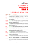 www.sharewithu.com BARRON’S HOW TO PREPARE FOR THE SAT I 3,500 Basic Word List Word List 1 abase V. abash V. abate V. abbreviate V. abase-adroit /降低,羞辱/lower; humiliate. Defeated, Queen Zenobia was forced to abase herself before the conquering Romans, who made her march in chains before the emperor in the procession celebrating his triumph. abasement, N. /使难堪/embarrass. He was not at all abashed by her open admiration. /减弱,减少/subside; decrease, lessen. Rather than leaving immediately, they waited for the storm to abate. abatement, N. /减短,缩写/shorten. Because we were running out of time, the lecturer had to abbreviate her speech. abdicate V. abduction N. /绑架/ aberrant N. abet V. abeyance N. /悬而未决/ abhor V. abject ADJ. abjure V. ablution N. abnegation N. /批判,自我牺牲/ abolish V. abominable ADJ. aboriginal ADJ., /放弃/renounce; give up. When Edward VIII abdicated the British throne to marry the woman he loved, he surprised the entire world. kidnapping. The movie Ransom describes the attempts to rescue a multimillionaire's son after the child's abduction by kidnappers. abduct,V. /不正常的/abnormal or deviant. Given the aberrant nature of the data, we doubted the validity of the entire experiment. also N. /帮助,鼓励/aid, usually in doing something wrong; encourage. She was unwilling to abet him in the swindle he had planned. suspended action. The deal was held in abeyance until her arrival. /憎恨/detest; hate. She abhorred all forms of bigotry. abhorrence, N. /穷困潦倒,卑微/wretched; lacking pride. On the streets of New York the homeless live in abject poverty, huddling in doorways to find shelter from the wind. /发誓放弃/renounce upon oath. He abjured his allegiance to the king. abjuration, N. /洗/washing. His daily ablutions were accompanied by loud noises that he humorously labeled "Opera in the Bath." repudiation; self-sacrifice. No act of abnegation was more pronounced than his refusal of any rewards for his discovery. /废除/cancel; put an end to. The president of the college refused to abolish the physical education requirement. abolition, N. /可恶的,非常糟糕/detestable; extremely unpleasant; very bad. Mary liked John until she learned he was dating Susan; then she called him an abominable young man, with abominable taste in women. N. /原来的,土著的/being the first of its kind in a region; primitive; native. Her studies of the primitive art forms of the aboriginal Indians were widely reported in the scientific journals. aborigines, N. -1- www.sharewithu.com abortive ADJ. /不成功的,失败/unsuccessful; fruitless. Attacked by armed troops, the Chinese students had to abandon their abortive attempt to democratize Beijing peacefully. abort,V. abrade V. abrasive ADJ. abridge V. abrogate ADJ. /废除/ abscond V. absolute ADJ. absolve V. absorb V. abstain V. abstemious ADJ. abstinence N. abstract ADJ. abstruse ADJ. /难以理解的,复杂的/ abundant ADJ. /丰富, 富足/ abusive ADJ. abut V. abysmal ADJ. abyss N. academic ADJ. accede V. accelerate V. /磨损,侵蚀/wear away by friction; scrape; erode. The sharp rocks abraded the skin on her legs, so she put iodine on her abrasions. /摩擦的,粗糙的,研磨剂/rubbing away; tending to grind down. Just as abrasive cleaning powders can wear away a shiny finish, abrasive remarks can wear away a listener's patience. abrade,V. /删节,节选/condense or shorten. Because the publishers felt the public wanted a shorter version of War and Peace, they proceeded to abridge the novel. abolish. He intended to abrogate the decree issued by his predecessor. /隐匿,逃避,躲债/depart secretly and hide. The teller who absconded with the bonds went uncaptured until someone recognized him from his photograph on "America's Most Wanted." /完全的,肯定的/complete; totally unlimited; certain. Although the King of Siam was an absolute monarch, he did not want to behead his unfaithful wife without absolute evidence of her infidelity. /谅解/pardon (an offense). The father confessor absolved him of his sins. absolution, N. / 吸收,合并/assimilate or incorporate; suck or drink up; wholly engage. During the nineteenth century, America absorbed hordes of immigrants, turning them into productive citizens. Can Huggies diapers absorb more liquid than Pampers can? This question does not absorb me; instead, it bores me. absorption, N. /控制,限制(自己)/refrain; hold oneself back voluntarily from an action or practice. After considering the effect of alcohol on his athletic performance, he decided to abstain from drinking while he trained for the race. abstinence, N. /节制(饮食),调节/sparing in eating and drinking; temperate. Concerned whether her vegetarian son's abstemious diet provided him with sufficient protein, the worried mother pressed food on him. /节制(饮食)/restraint from eating or drinking. The doctor recommended total abstinence from salted foods. abstain,V. /抽象的/theoretical; not concrete; nonrepresentational. To him, hunger was an abstract concept; he had never missed a meal. obscure; profound; difficult to understand. She carries around abstruse works of philosophy, not because she understands them but because she wants her friends to think she does. plentiful; possessing riches or resources. At his immigration interview, Ivan listed his abundant reasons for coming to America: the hope of religious freedom, the prospect of employment, the promise of a more abundant life. / 粗 俗 的 侮 辱 , 对 身 体 有 害 的 /coarsely insulting; physically harmful. An abusive parent damages a child both mentally and physically. /毗邻/border upon; adjoin. Where our estates abut, we must build a fence. /无底的/bottomless. His arrogance is exceeded only by his abysmal ignorance. /深渊,深坑,无底洞/enormous chasm; vast bottomless pit. Darth Vader seized the evil emperor and hurled him down into the abyss, /学术的/related to a scho