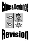 1 Crime & Deviance> What you need to know: Deviance & Crime you should be able to: Explain the difference between crime and deviance Describe the ways in which individuals are encouraged to abide legal and social rules through informal and formal social control. Describe the process of deviance amplification and the role of the mass media in gender stereotyping. In your own words give some examples of the above points: Sociological Approaches you should be able to: demonstrate a basic understanding of different sociological explanations of criminal and deviant behaviour. For example: Subcultural explanations, labeling theory, risk theory and strain theory. discuss the theories by referring to class, gender and ethnic differences. recognize that official statistics, self-report studies and victim studies do have their uses but that they also have limitations. In your own words give some examples of the above points: Crime & Society you should be able to: describe the social significance of criminal & deviant behaviour. In other words there are positive links between such behavior and change within society. In your own words give some examples of the above points: 2 Deviance & Crime Explain the difference between crime and deviance Sociologists illustrate a difference between crime & deviance. A crime is an act that breaks the criminal law of society. Deviance refers to behaviour that is disapproved of by most people in society as it does conform to society’s norms & values. Is deviance always illegal? Deviant behaviour may be illegal but not all deviant acts are against the law. Legal deviance will be considered ‘abnormal’ in some way by most people in a society. For example a woman who owns a 60 cats or someone who wears their clothes inside out. Illegal deviance is criminal and is punishable by the state. For example, murdering an old lady or rape. Check your understanding 1.) Explain the difference between legal and illegal deviance (2 marks) 2.) Give 2 examples of acts which are against the law but which are not usually considered deviant (2 marks) 3.) Give 2 other examples of deviant acts which are not against the law (2 marks) When is an act deviant? Many sociologists believe that deviance is socially defined. In other words whether an act is seen as deviant or not depends on the particular social setting it takes place. Consider the example of nudity. Being naked in the bath, shower, sauna is seen as perfectly acceptable. However, in a supermarket, at a pop concert or on a football pitch nudity would be seen as deviant. Sociologists argue that what is considered deviant depends not on the act itself but how others react to it. Deviance is defined according to the social setting in which the act takes place. It is socially defined. You should be able to describe the ways in which individuals are encouraged to abide legal and social rules through informal and formal social control. Why do most people conform or go along with most of the rules most of the time? Social Control refers to the processes by which most people are persuaded to obey the rules. 3 Activity: In order to explore the processes of social control, choose 2 settings with which you are familiar, for example a football match, a shopping center or home and answer the following:1.) State 3 rules that operate in each setting. 2.) Explain briefly why you stick to each of these rules. 3.) If the rules were broken what would happen to you – the individual – and to society? In explaining how social control operates, sociologists point to the role of AGENCIES OF SOCIAL CONTROL. These are the groups and organizations in society that serve to ensure that most people conform and stick to the rules most of the time. Sociologists have identified 2 different types of social control: Formal & Informal Social Control. Formal Social Control This is based on written rules and laws. There are 4 main agencies: 1.) Houses of Parliament: make laws to control behavior. 2.) Police force: enforce the law and investigate crime. 3.) Courts: to find out if a defendant is guilty and decide on sentencing 4.) Prison: punishes lawbreakers and stops other people from committing crime. Informal Social Control This type of control is based on informal processes such as the approval and disapproval of others. It is reinforced through the reaction of group members such as families, friends, workmates and bosses. Activity: Write down a list of 5 negative reactions towards individuals who do not conform to the group’s expectations (it has been started off for you): 1.) ridiculing them, 4.) 2.) ignoring them, 5.) 3.) Now write down 5 positive reactions: 1.) promotion 4.) 2.) pay rise 5.) 3.) 4 There are a number of different AGENCIES OF SOCIALIZATION, which carry out socialization and try to prevent people from becoming criminal or deviant in the first place. These agencies include: * families * peer groups * religions * mass media * schools * the workplace Check your understanding 1. Identify two agencies of formal social control and explain, in each case, how they control people’s behaviour. 2. Identify and describe two ways in which society tries to prevent people from becoming criminals. (4 marks) (4 marks) You should be able to describe the process of deviance amplification and the role of the mass media in gender stereotyping. Deviancy amplification It has been argued that in certain circumstances the labelling of some groups as deviant by agencies such as the media and the police can actually generate more deviance. This idea is known as deviancy amplification. We will examine two examples of deviancy amplification here; the role of the mass media and the role of the police. The mass media The mass media are very powerful in their ability to label certain groups as deviant. As most people may never meet the labelled groups themselves, the description of the group of individuals given by the media will be in the image they hold of them. A