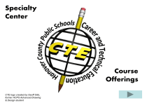 Specialty Center Course Offerings CTE logo created by Geoff Sills, former HCPS Advanced Drawing & Design student Hanover County Specialty Center Courses Design, Multimedia and Web Technologies Design, Multimedia and Web Technologies ADV Electronics I Electronics II Electronics III Electronics IV Engineering Exploration Manufacturing Systems I Manufacturing Systems II Nurse Aide Program Public Safety I & II Sports Medicine II Specialty Center Dual Enrollment Courses at Reynolds Community College EMT Fire Science Human Anatomy Medical Technology and Laboratory Medicine Program Pharmacy Technician Certificate Program Design, Multimedia and Web Technologies Design, Multimedia and Web Technologies - Grades 9-12 Year - 1 Weighted Credit Students develop proficiency in designing and creating desktop published projects, multimedia presentations / projects and websites using industry-standard application software. Students apply principles of layout and design in completing projects. Students create portfolios that include a resume and a variety of desktop published multimedia and website projects produced in the course. Design, Multimedia and Web Technologies ADV Design, Multimedia and Web Technologies ADV - Grades 10-12 Year - 1 Weighted Credit Students develop proficiency in designing and creating desktop published projects, multimedia presentations / projects and websites using industry-standard application software. Students apply principles of layout and design in completing projects. Students create portfolios that include a resume and a variety of desktop published multimedia and website projects produced in the course. Electronics I Electronics Level I - Grades 9 - 12 Year - 1 Weighted Credit Prerequisite: Algebra I This course provides comprehensive, hands-on instruction in the terminology, principles and applications of DC circuits, AC circuits and magnetism / electromagnetism. Working with instructional technology, students will isolate, identify and test a series of circuits. Students will perform troubleshooting exercises to demonstrate mastery of course objectives. Electronics II Electronics Level II - Grades 10 - 12 Year - 1 Weighted Credit This course provides comprehensive, hands-on instruction in the terminology, principles and application of digital logic circuits and digital circuits. Students will use instructional technology to identify and test a series of circuits as well as to perform troubleshooting exercises. Electronics III Electronics Level III - Grades 11- 12 Year - 1 Weighted Credit This course provides comprehensive, hands-on instruction in the terminology, principles and application of analog communications and digital communications, including Robotics Systems and Basic Programming. Students will use their knowledge from Electronics I and II and apply it to advanced circuitry. Students will use instructional technology to demonstrate mastery of course objectives. Electronics IV Electronics Level IV – Grade 12 Year - 1 Weighted Credit This course provides comprehensive, hands-on training in the terminology and principles of semiconductor devices, robotics, engineering and programming. Students will use their previous knowledge and skills from earlier courses to gain a deeper understanding for advanced AC and DC Circuits. Students will use instructional technology to demonstrate mastery of course objectives. Engineering Exploration Engineering Exploration - Grades 9 - 12 Year - 1 Weighted Credit Prerequisite: Algebra I This course provides a pre-engineering curriculum in which students will earn essential knowledge for several different types of engineering. The pre-engineering laboratory classroom contains computers and software for students to work in teams to master content in the background of engineering, explore career opportunities for engineers and begin to apply math and science skills to solve complex, real-world problems in mechanical, aerospace, materials, civil, environmental, chemical, industrial and electrical engineering. Manufacturing Systems I Manufacturing Systems I - Grades 9 - 12 Year - 1 Weighted Credit Prerequisite: Algebra I This sequence of two courses in Automated Manufacturing prepares students for college and/or careers in manufacturing. The two courses utilize multimedia and provide comprehensive hands-on activities in the following content areas: - Design - Industrial Electronics - Mechanical Systems - Automation and Material Handling - Manufacturing Process - Quality Control - Material Processing - Packaging Manufacturing Systems II Manufacturing Systems II - Grades 10 - 12 Year - 1 Weighted Credit Students who completed Automated Manufacturing I and mastered Level I curriculum will broaden their knowledge of the eight main subject areas studied, concentrating on impacts and issues concerning manufacturing. Also, students will create a fictitious manufacturing company and develop a product from design to sale, showing that the student has learned all content areas of manufacturing. Nurse Aide Program Benefits of Enrollment: - Become a licensed nurse aide in just 1 year - Work in a clinical environment (hospital, long-term care facilities and rehabilitative facilities) - Hands on instruction - Meet students with same interests - Small class sizes - Earn an average of $11.50 / hour ($24K / year) – recent students make anywhere from $12-$15/hour - Job outlook faster than average (LPN Program available – Ask your counselor for more info) Nurse Aide Program Nurse Aide I - Grade 11 or 12 Semester - 1 Credit Emphasizes the study of nursing occupations as related to the health care system. Students study normal growth and development, simple body structure and function, medical terminology, etc… They receive skill training in patient – nursing assistant relationships, taking and recording vital signs, cardiopulmonary resuscitation and bathing, feeding, dressing and transporting patients in hospitals and nursing homes. Nurse Aide Pr