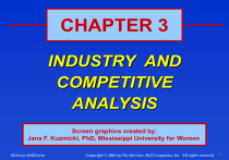 CHAPTER 3 INDUSTRY AND COMPETITIVE ANALYSIS Screen graphics created by: Jana F. Kuzmicki, PhD, Mississippi University for Women McGraw-Hill/Irwin Copyright © 2001 by The McGraw-Hill Companies, Inc. All rights reserved. 1 “Analysis is the critical starting point of strategic thinking.” Kenichi Ohmae “Things are always different-the art is figuring out which “Quote” differences matter.” Laszlo Birinyi McGraw-Hill/Irwin Copyright © 2001 by The McGraw-Hill Companies, Inc. All rights reserved. Chapter Outline Role of Situation Analysis in Strategy-Making Methods of Industry and Competitive Analysis Industry’s Dominant Economic Traits Industry’s Competitive Forces Drivers of Industry Change Competitive Positions of Rivals Competitive Moves of Rivals Key Success Factors Conclusions: Overall Industry Attractiveness Conducting an Industry and Competitive Analysis McGraw-Hill/Irwin Copyright © 2001 by The McGraw-Hill Companies, Inc. All rights reserved. 3 What Is Situation Analysis? Two considerations Company’s external or macro-environment Industry and competitive conditions Company’s internal or micro-environment Competencies, capabilities, resource strengths and weaknesses, and competitiveness McGraw-Hill/Irwin Copyright © 2001 by The McGraw-Hill Companies, Inc. All rights reserved. 4 Figure 3.1: The Components of a Company’s Macro-Environment MACROENVIRONMENT The Economy at Large Suppliers Rival Firms Substitutes COMPANY Buyer s New Entrants IMMEDIATE INDUSTRY AND COMPETITIVE ENVIRONMENT McGraw-Hill/Irwin Copyright © 2001 by The McGraw-Hill Companies, Inc. All rights reserved. 5 Figure 3.2: Strategic Thinking and Analysis Leads to Good Strategic Choices Assess Industry & Competitive Conditions 1. Industry’s dominant economic traits 2. Nature of competition & strength of competitive forces 3. Drivers of industry change 4. Competitive position of rivals 5. Strategic moves of rivals 6. Key success factors 7. Conclusions about industry attractiveness Assess Company Situation Identify Strategic Options for the Company Select the Best Strategy for the Company 1. Assessment of company’s present strategy 2. Resource strengths and weaknesses, market opportunities, and external threats 3. Company’s costs compared to rivals 4. Strength of company’s competitive position 5. Strategic issues that need to be addressed McGraw-Hill/Irwin Copyright © 2001 by The McGraw-Hill Companies, Inc. All rights reserved. 6 Key Considerations Regarding the Industry and Competitive Environment Industry’s dominant economic traits Competitive forces and strength of each force Competitor analysis McGraw-Hill/Irwin Drivers of change in the industry Key success factors Conclusions: Industry attractiveness Copyright © 2001 by The McGraw-Hill Companies, Inc. All rights reserved. 7 Question 1: What are the Industry’s Dominant Economic Traits? Market size and growth rate Scope of competitive rivalry Number of competitors and their relative sizes Prevalence of backward/forward integration Entry/exit barriers Nature and pace of technological change Product and customer characteristics Scale economies and experience curve effects Capacity utilization and resource requirements Industry profitability McGraw-Hill/Irwin Copyright © 2001 by The McGraw-Hill Companies, Inc. All rights reserved. 8 Table 3.1: Sample Profile of the Dominant Economic Characteristics of the Sulfuric Acid Industry The Experience Curve Effect An experience curve exists when a company’s unit costs decline as its cumulative production volume increases because of Accumulating Growing production know-how mastery of the technology The bigger the experience curve effect, the bigger the cost advantage of the firm with the largest cumulative production volume McGraw-Hill/Irwin Copyright © 2001 by The McGraw-Hill Companies, Inc. All rights reserved. 10 Figure 3-3: Cost Advantages of Different Experience Curve Effects $1 Cost per Unit $1 .90 .80 .81 .70 .64 .729 10% Cost Reduction .512 .49 .343 20% Cost Reduction 30% Cost Reduction 1 2 Million Million Units Units McGraw-Hill/Irwin 4 Million Units 8 Million Units Copyright © 2001 by The McGraw-Hill Companies, Inc. All rights reserved. 11 Table 3.2: Relevance of Key Economic Features Economic Feature Strategic Importance Market growth rate Small markets don’t tend to attract new firms; large markets attract firms looking to acquire rivals with established positions in attractive industries Fast growth breeds new entry; slow growth spawns increased rivalry & shakeout of weak rivals Capacity surpluses/shortages Surpluses push prices & profit margins down; shortages pull them up Industry profitability High-profit industries attract new entrants; depressed conditions lead to exit Entry/exit barriers High barriers protect positions and profits of existing firms; low barriers make existing firms vulnerable to entry Product is big-ticket item for buyers More buyers will shop for lowest price Standard products Buyers have more power because it’s easier to switch from seller to seller Rapid technological change Vertical integration Raises risk; investments in technology facilities/equipment may become obsolete before they wear out Big requirements make investment decisions critical; timing becomes important; creates a barrier to entry and exit Raises capital requirements; often creates competitive & cost differences among fully vs. partially vs. non-integrated firms Economies of scale Increases volume & market share needed to be cost competitive Rapid product innovation Shortens product life cycle; increases risk because of opportunities for leapfrogging Market Size Capital requirements McGraw-Hill/Irwin Copyright © 2001 by The McGraw-Hill Companies, Inc. All rights reserved. 12 Question 2: What is Competition Like and How Strong Are the Competitive Forces? Objective To identify Main sources of competitive forces Strength of these forces Key analytical tool Five Forces Model of Competit